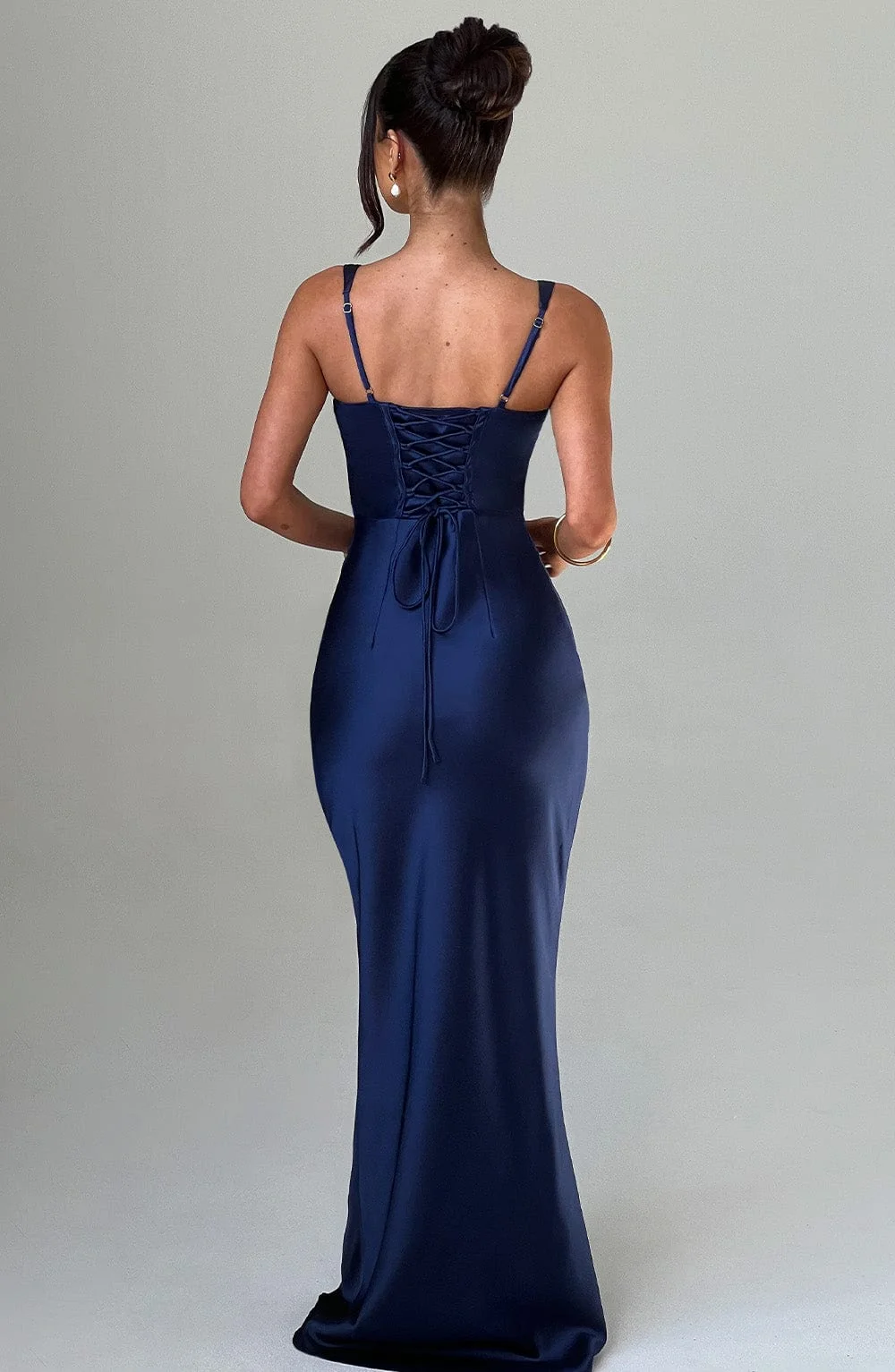 Experience the perfect fit and feminine allure with our Navy Satin Bias Cut Maxi Dress. Crafted from premium non-stretch satin, this dress features a corseted bodice with boning for a cinched waist, pleated cups, and adjustable straps. Complete with a lace-up back and invisible zipper, this maxi dress guarantees a stunning silhouette. Elevate your style effortlessly with a chic messy bun and tonal heels. Model showcased in size XS.