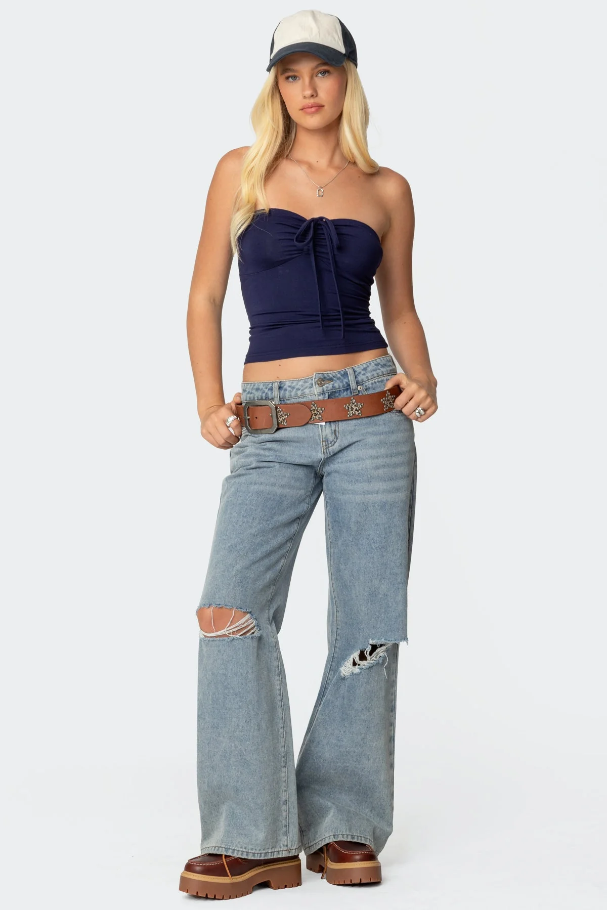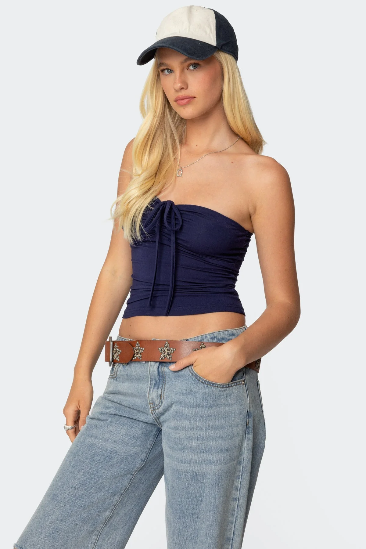 Indulge in the chic elegance of our Navy Strapless Sweetheart Top. Featuring a flattering sweetheart neckline, center ruching, and a charming tie front detail, this top is a must-have in every fashionistas wardrobe. Crafted from a blend of Rayon and Spandex, it offers comfort and style. Whether youre attending a special event or enjoying a casual outing, this top will elevate your look effortlessly. Machine washable for easy care. Available in sizes XS to XL.