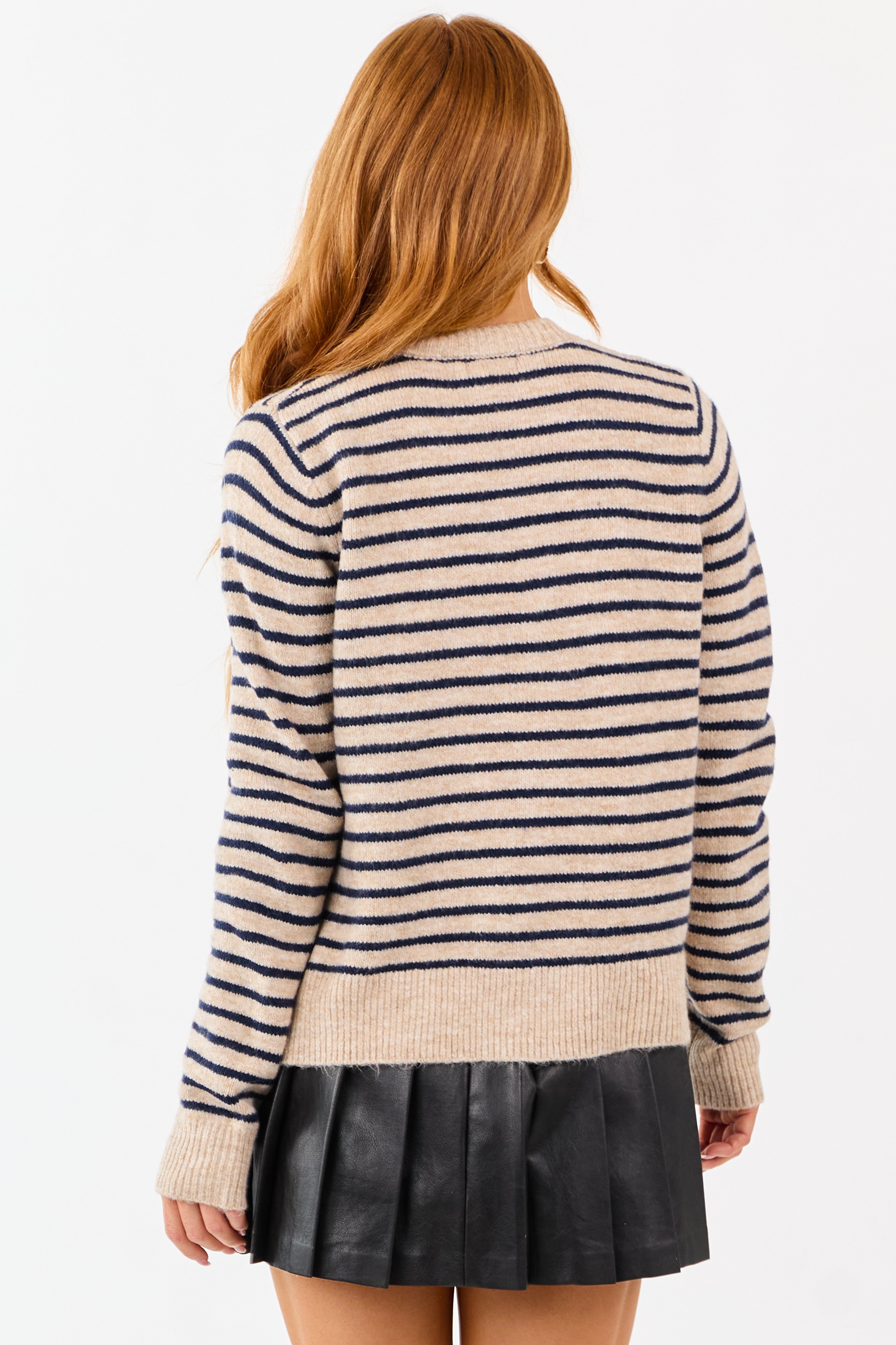Stay fashionable with our navy button-up cardigan featuring standout stripes and banded ribbed trim. This trendy outerwear is crafted from a stretchy knit blend of 68% Acrylic, 28% Polyester, and 4% Spandex for ultimate comfort and style. Available in sizes S, M, and L, with bust measurements of 44, 46, and 48, sleeve lengths ranging from 26to 27, and lengths from 25to 26. Perfect for fall season layering. Model in the picture is wearing a size Small and has the following dimensions: height 55, bust 33, and waist 24.