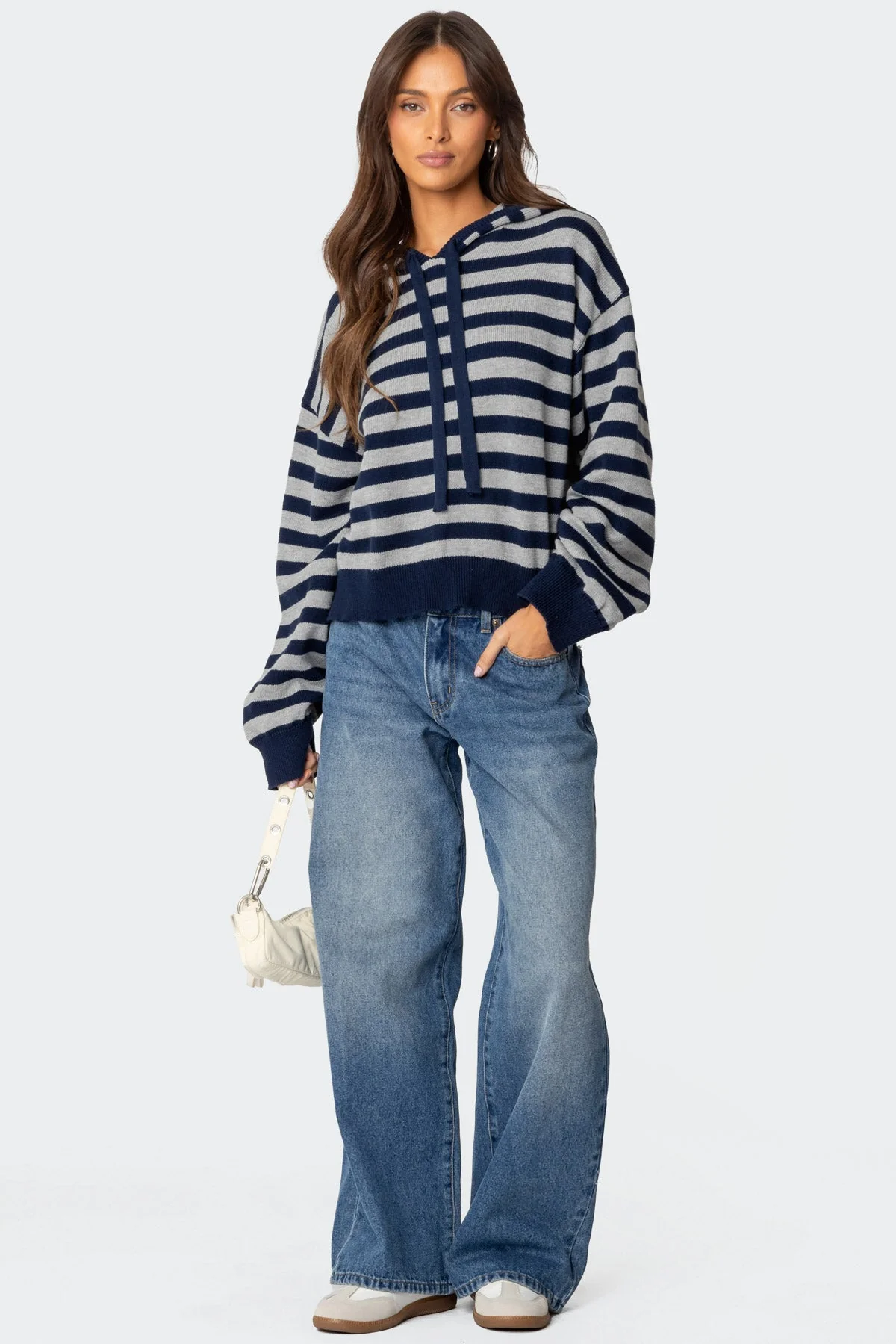 Stay stylish and cozy with our Navy Striped Knit Hoodie Sweater. Made from 100% Cotton, this sweater features a hooded design with drawstring detail and striped knit fabric. Ideal for any casual outing, this sweater is the perfect addition to your wardrobe. Model wears size S. Item care: Machine wash at max 30ºC, do not bleach, tumble dry low, iron at max 110ºC, do not dry clean.