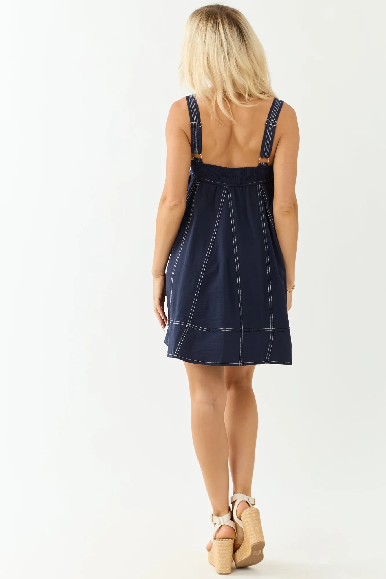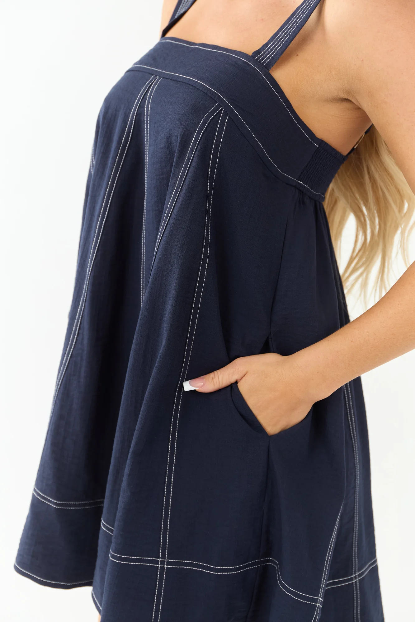 This sleeveless navy mini dress features a tent silhouette that floats with every step, combining breezy comfort with refined style. Crafted from 49% Rayon, 24% Polyester, 17% Nylon with white contrast stitching. It comes with adjustable straps, side pockets, smocked back, and is lined with 100% Rayon. Perfect for summer, the dress fits true to size. Garment specs for size small: Bust 33″, Length 32″. Imported.