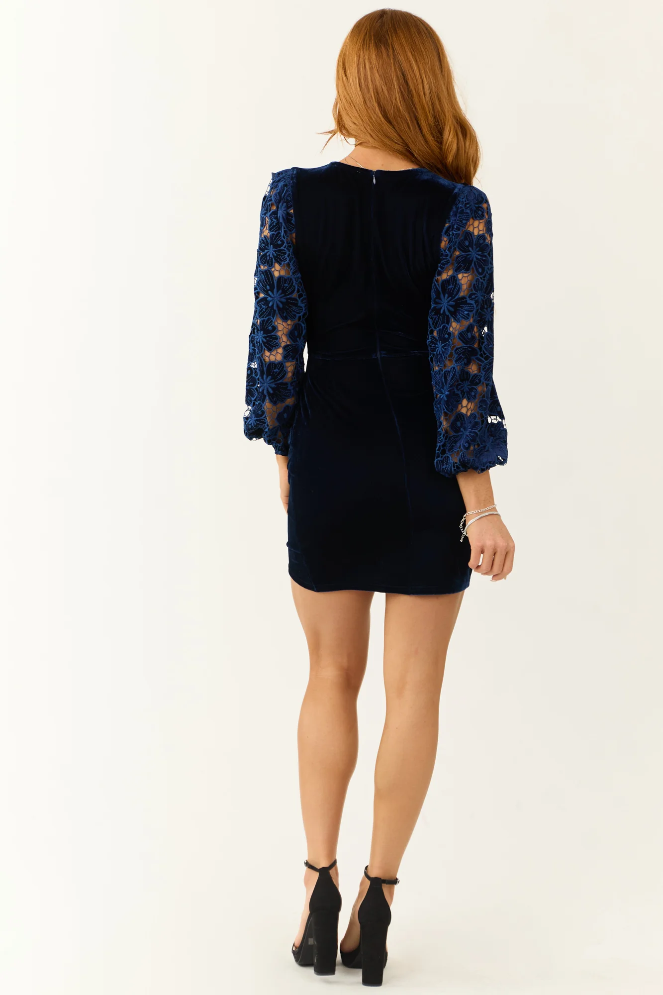Indulge in luxury with our Navy Velvet Mini Dress, designed with exquisite crocheted floral lace sleeves for a touch of elegance. This bodycon dress features a flattering surplice front, ruched sides, and a tulip skirt with a daring slit. Crafted from stretchy velvet and lined for comfort, this dress is perfect for evenings out. Available in sizes S, M, and L.