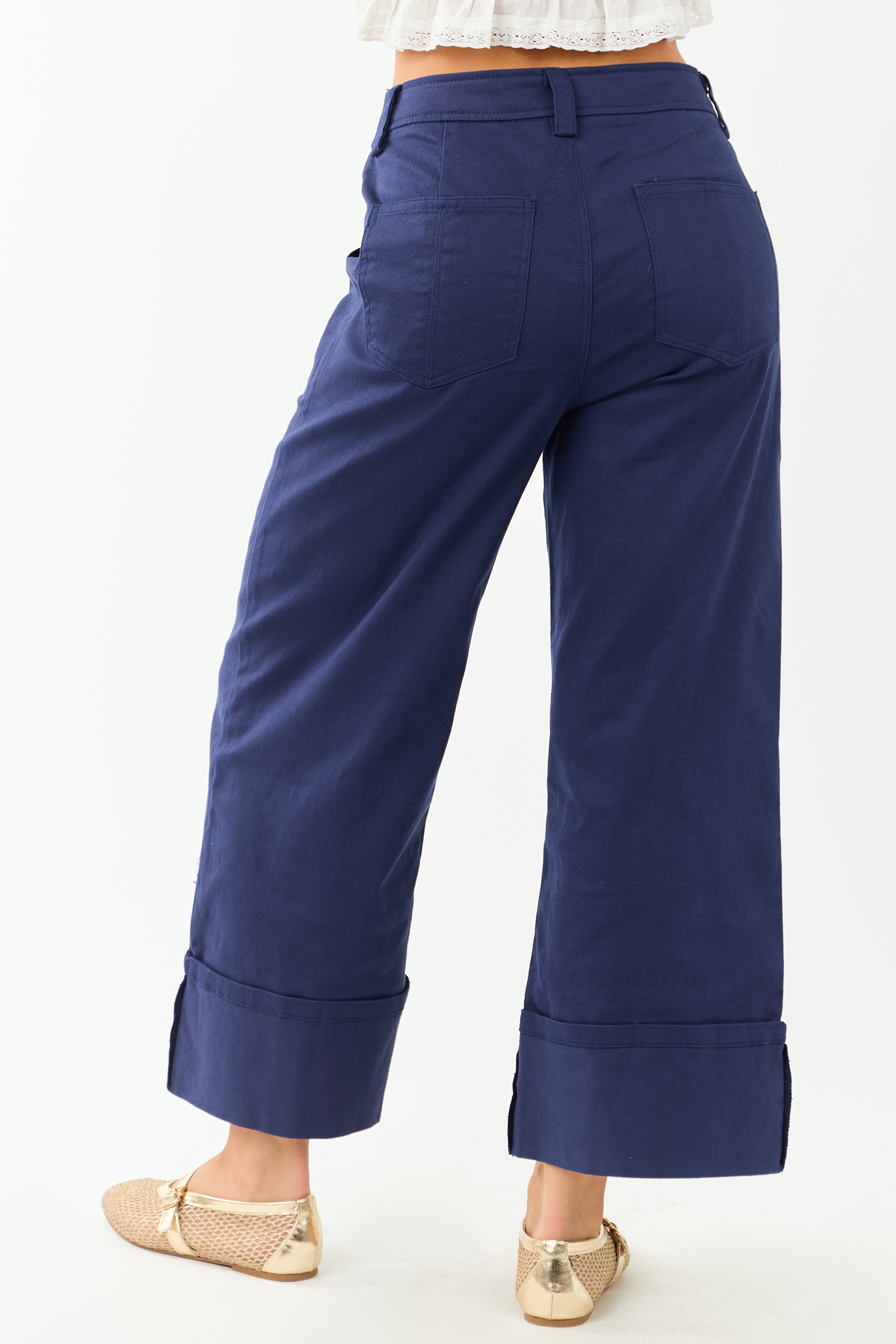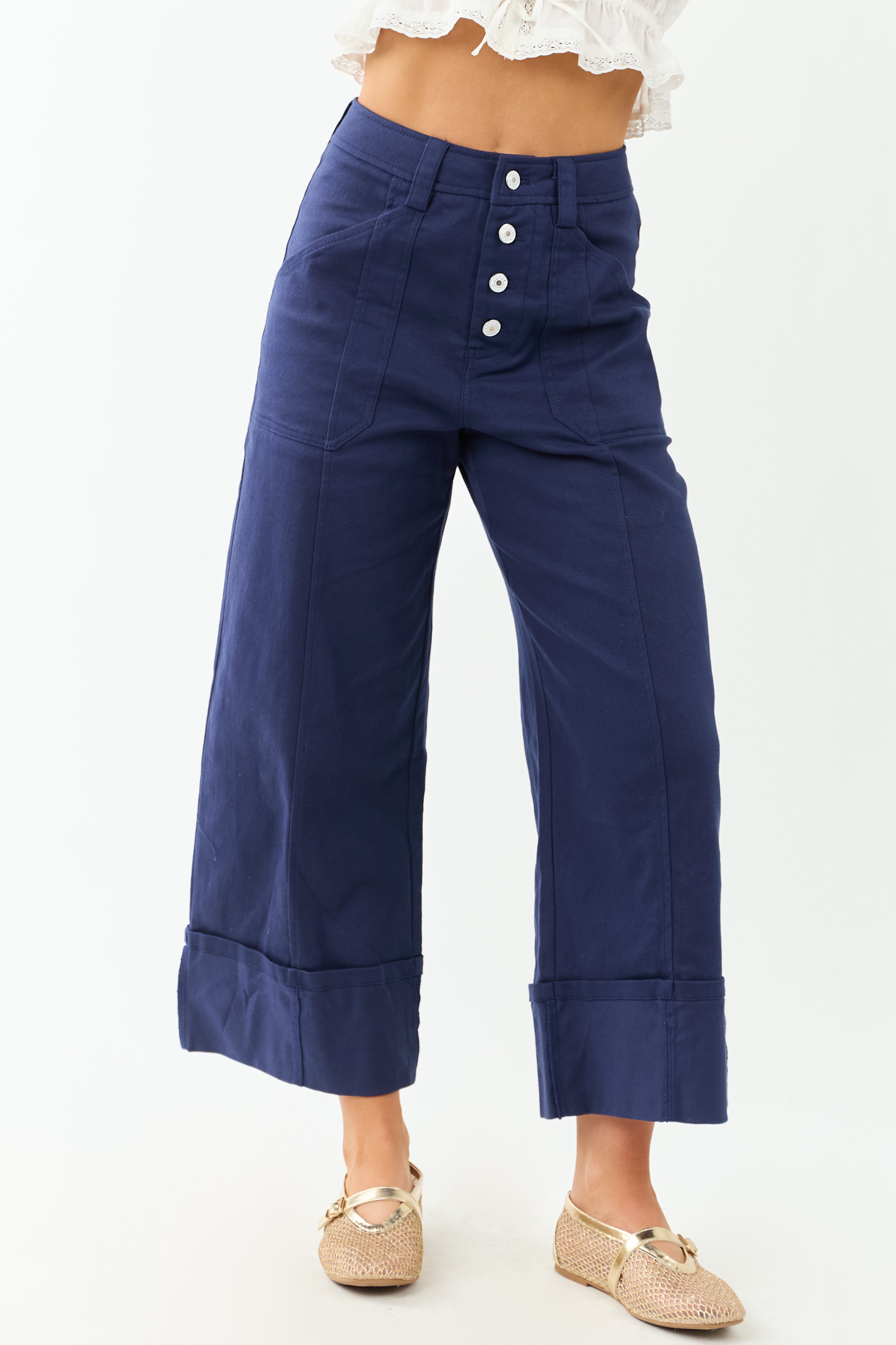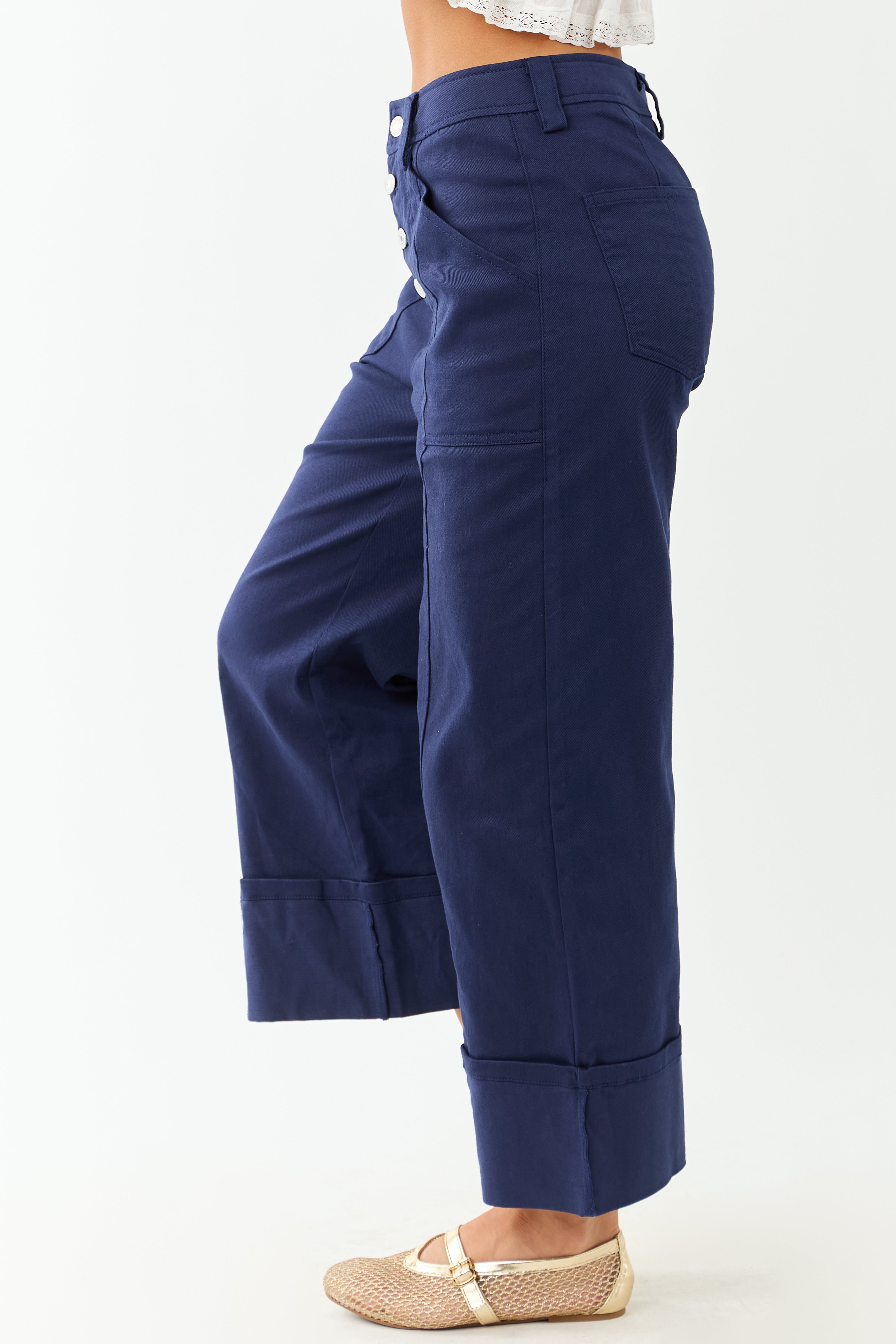 These navy high waist pants are designed to flatter and flow effortlessly, with a semi-stretchy cotton blend for comfort. Featuring a cuffed hem, button fly, belt loops, and 4 pockets for convenience. Available in sizes S, M, and L to suit different body types. Make a stylish statement with these versatile pants perfect for any occasion.