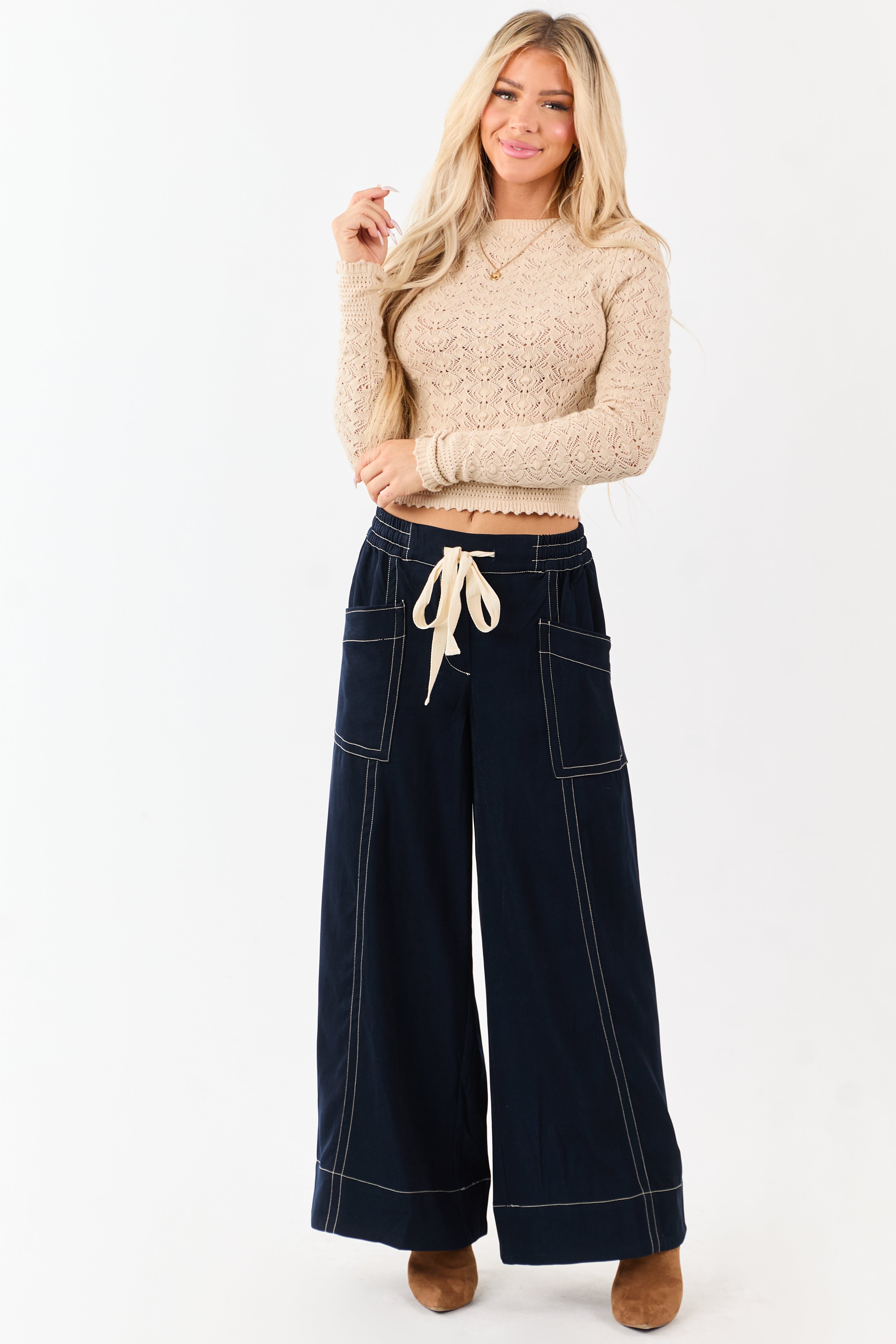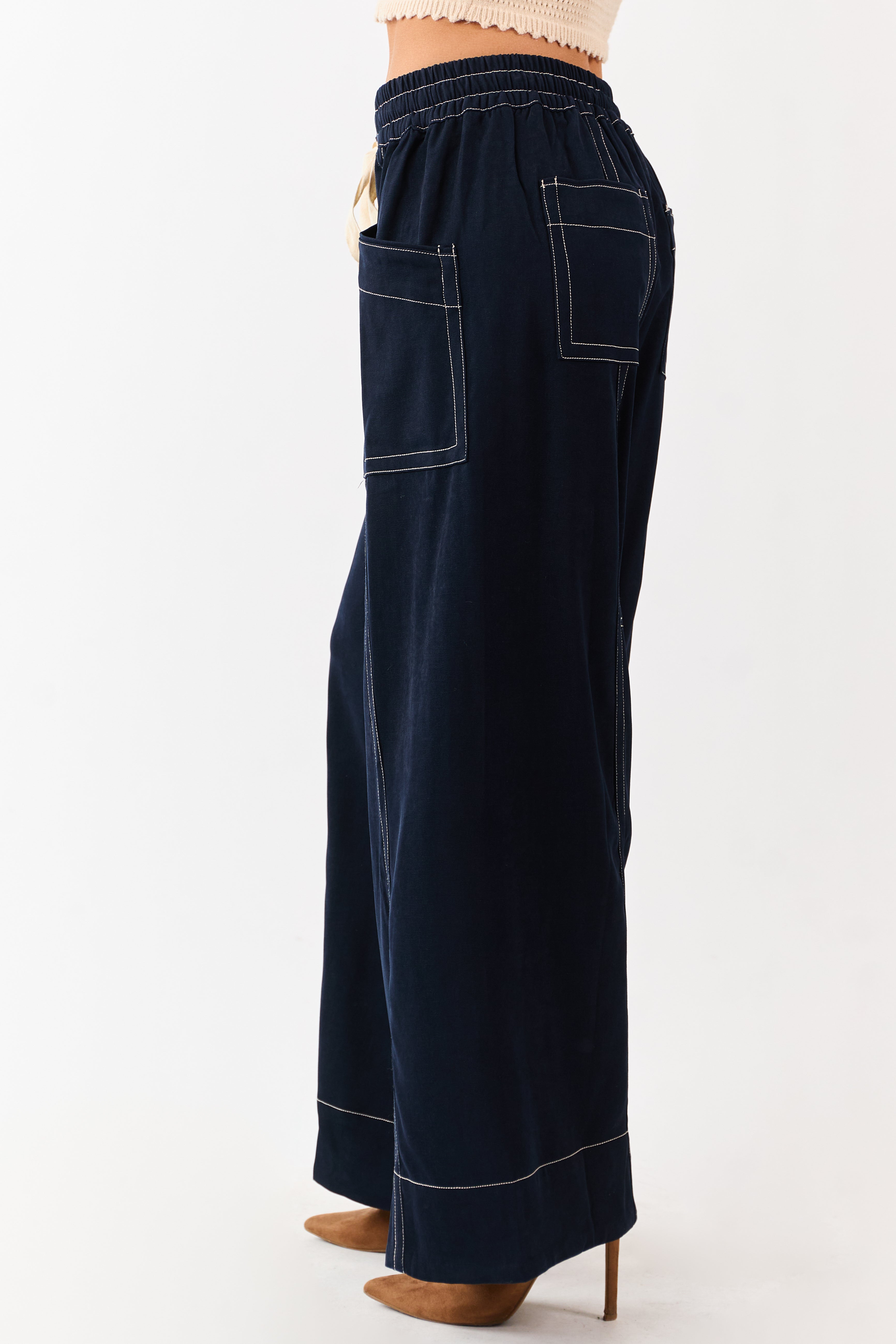 Experience modern comfort with our Navy Wide Leg Drawstring Pants featuring contrast stitch details. These high-waisted pants offer a laid-back yet stylish look for every day. Made from 95% Polyester and 5% Spandex, these pants come with an elastic waistband, 4 patch pockets, and measure 28″ inseam. Perfect for various occasions. Garment specs: Front Rise: 12″, Back Rise: 16″. Feel confident sizing down as this style runs large. Imported.