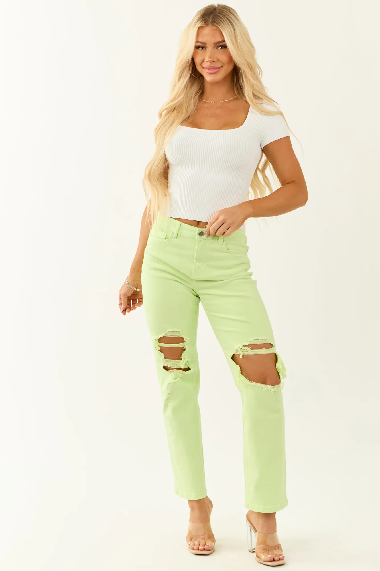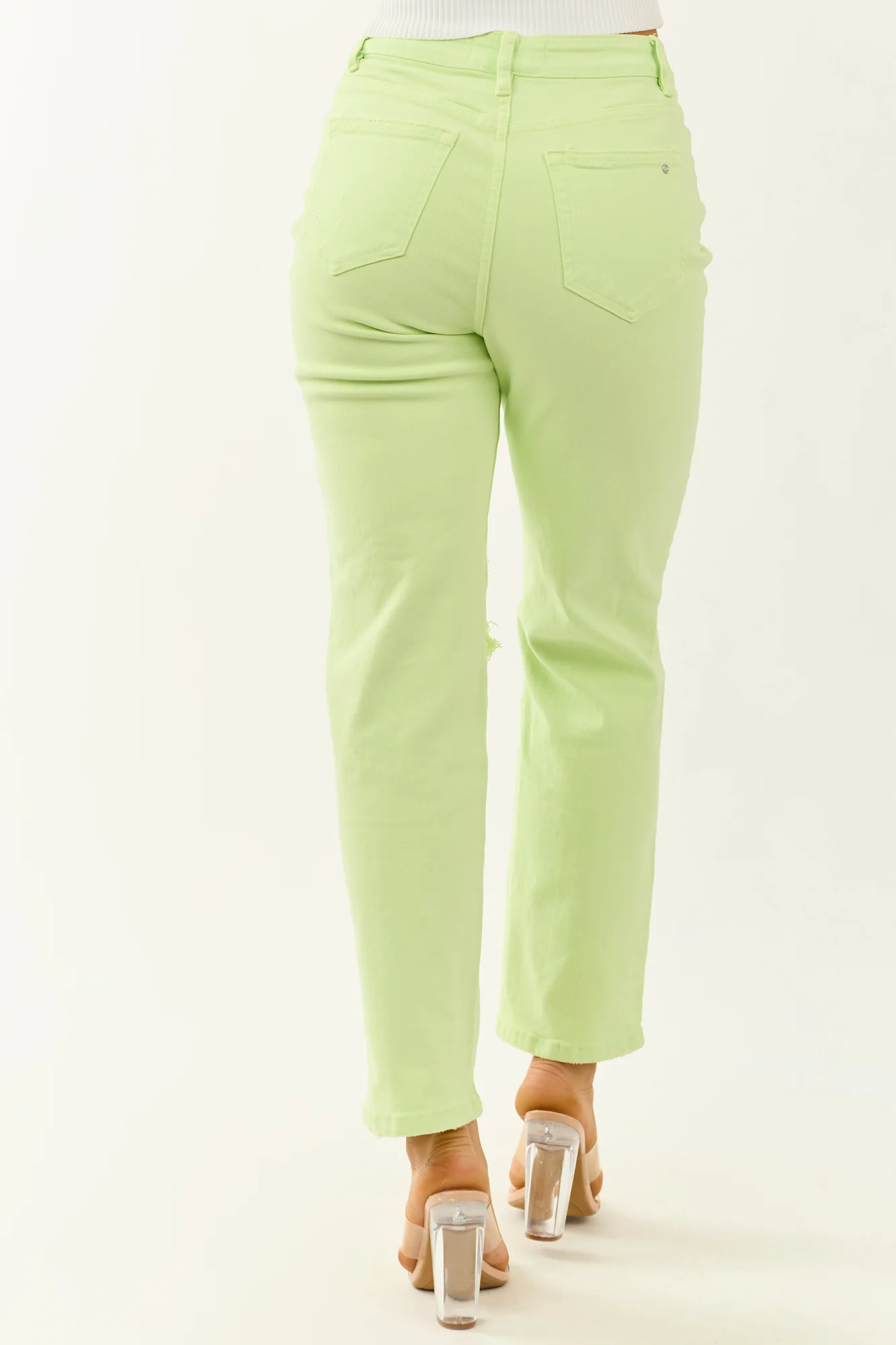 Make a bold statement with our neon lime high rise denim jeans that exude confidence and style. Crafted from stretchy denim for superior comfort, these jeans feature distressed knees, a high rise fit, five functional pockets, and ankle-length design. The zipper fly with button closure adds a classic touch. Perfect for standing out in any crowd. Embrace your vibrant side with these must-have jeans. Waist sizes range from 25″ to 33″. Hip sizes range from 33″ to 41″. Inseam measures 28.5″ across all sizes. Model is wearing a size 25. Made of 98% cotton and 2% spandex for a perfect blend of comfort and stretchiness.