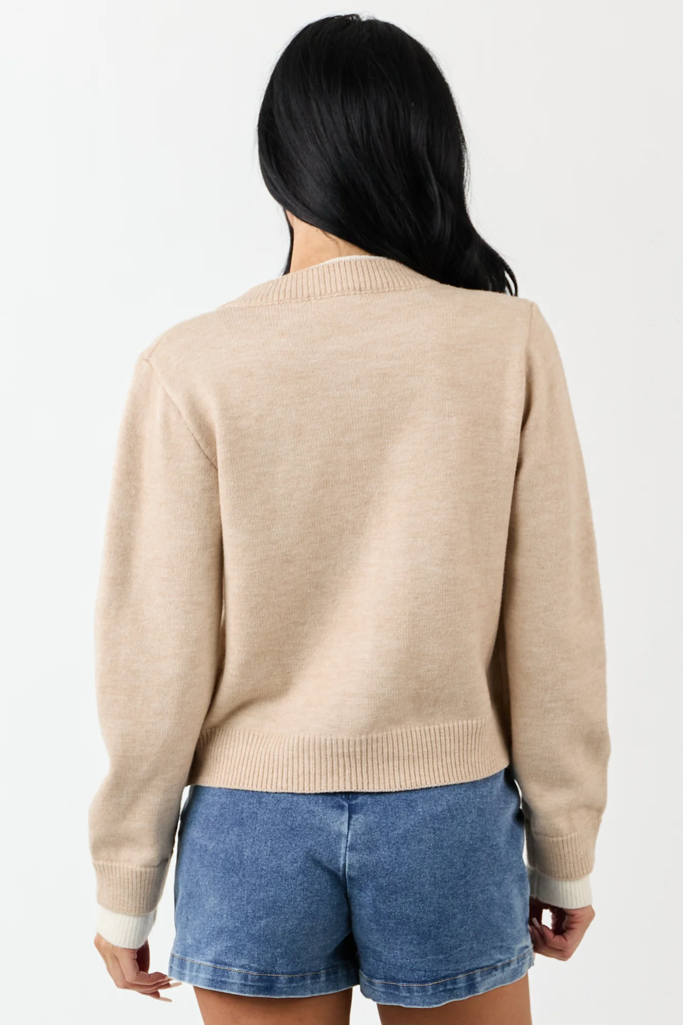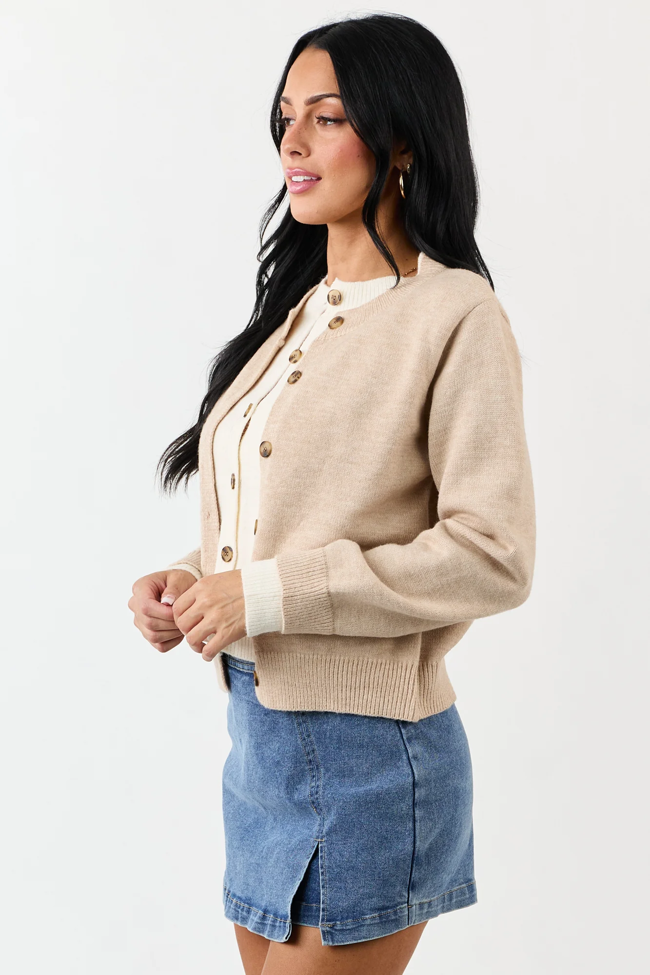 Discover the versatility of our desert sand and vanilla button-up cardigan with a unique sewn-together design. Crafted for comfort with stretchy knit fabric, ribbed trim, inner functional buttons, and faux outer buttons. This stylish cardigan offers two looks in one, making it a must-have for any wardrobe. Sizes available in S, M, and L. Ideal for layering in all seasons. Composition: 42% Acrylic, 30% Polyester, 28% Nylon. Imported.