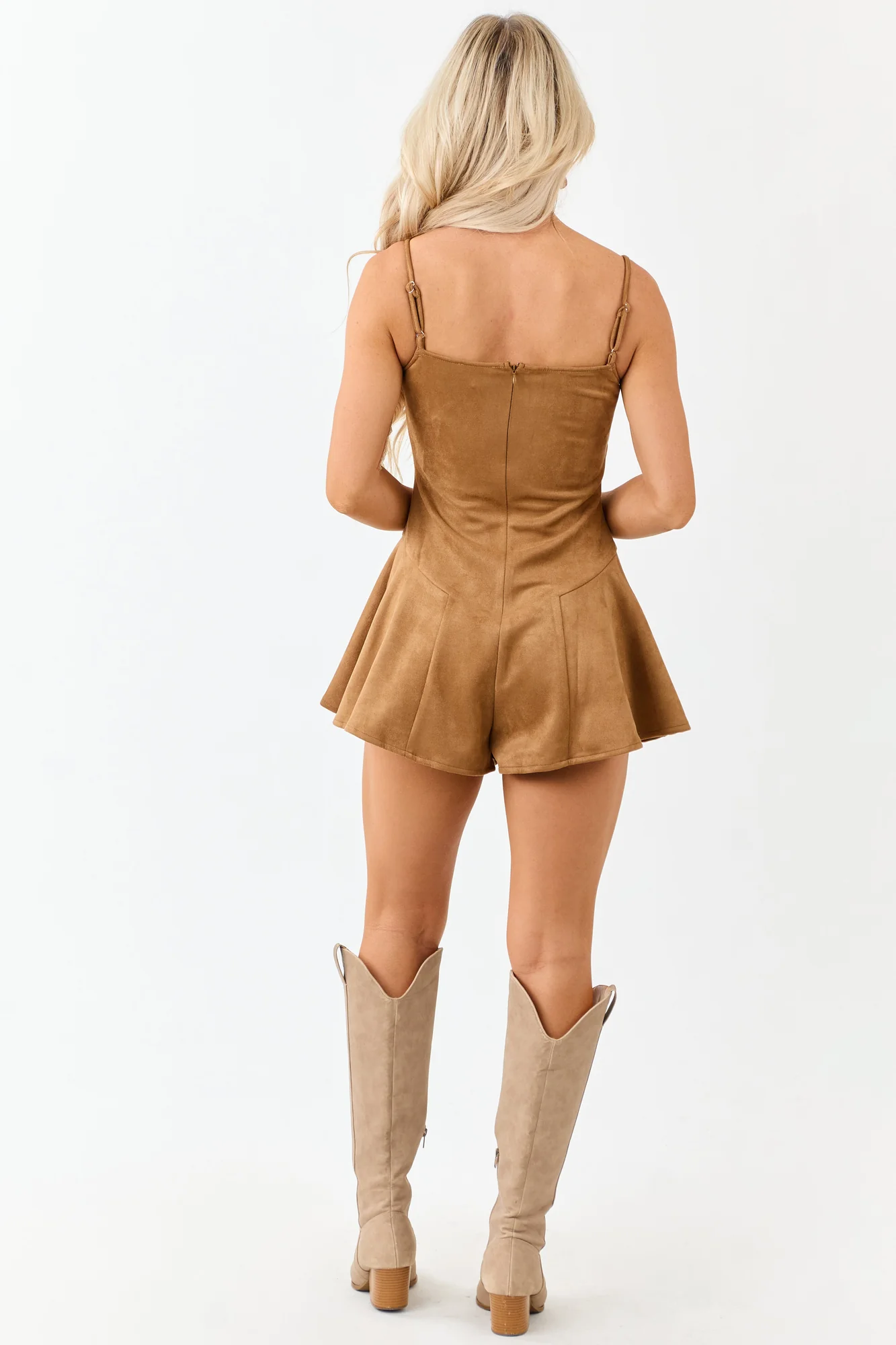 Embrace feminine charm with this neutral romper featuring a bold bust bow and breezy flare fit. Crafted from soft faux suede, this romper is both stylish and comfortable. The stretchy faux suede fabric, hidden back zipper, and adjustable straps ensure a perfect fit. Lined bust for added comfort. Ideal for various occasions. Available in sizes XS to XL. Size Chart: XS (0/2), S (4/6), M (8/10), L (12/14), XL (16/18). Garment specs for size SM: Bust 34″, Waist 27″, Torso Length 30″. Inseam: 2″. Material: 94% Rayon, 6% Nylon. Imported.