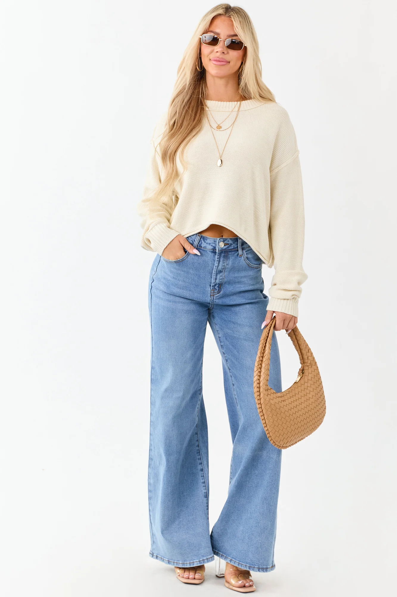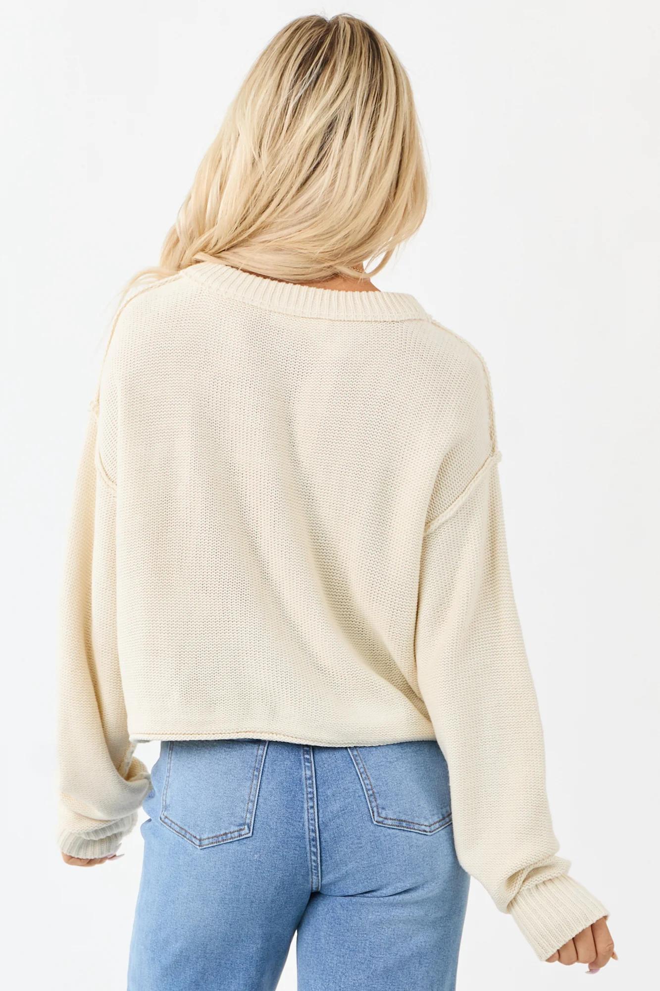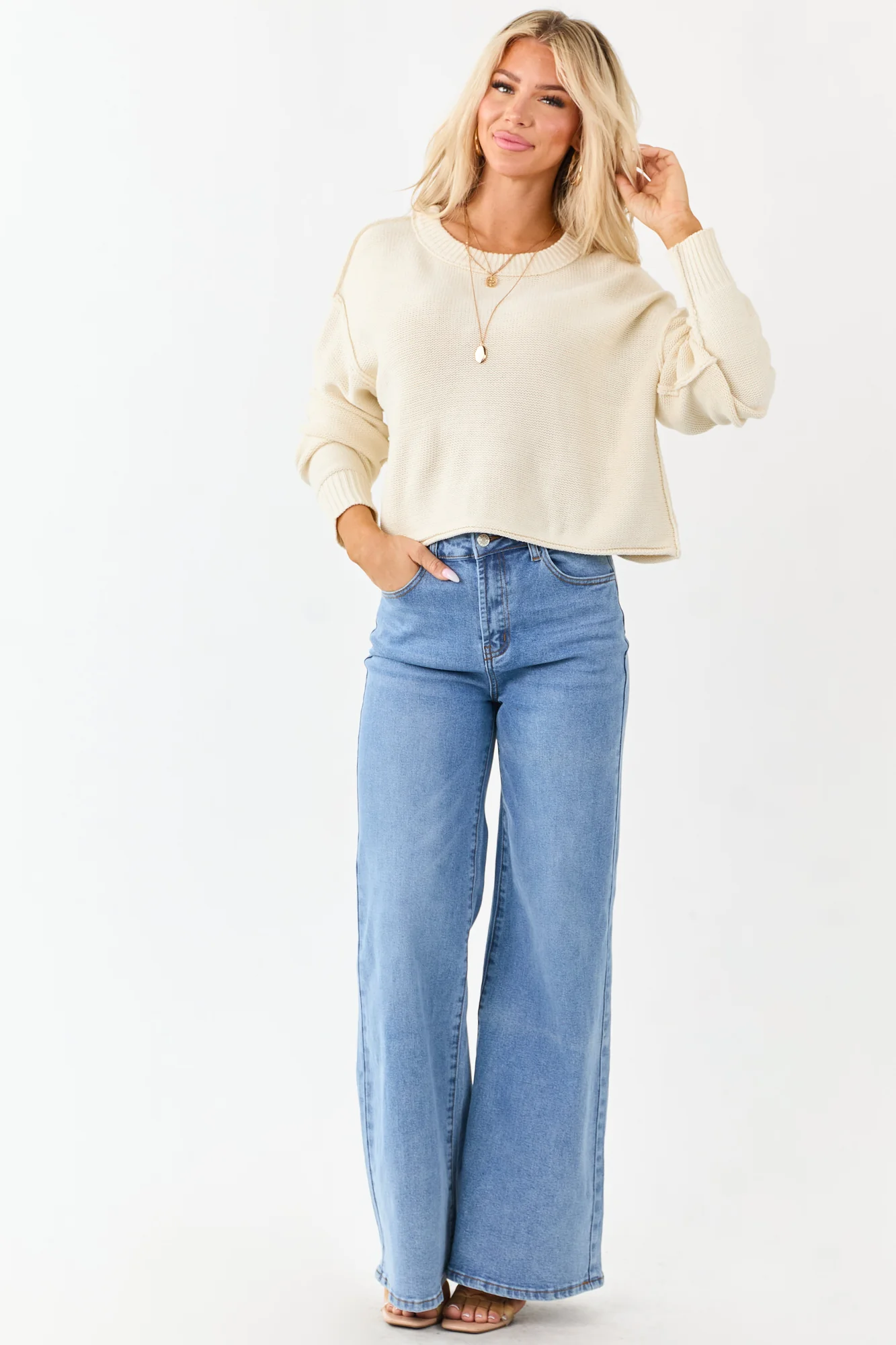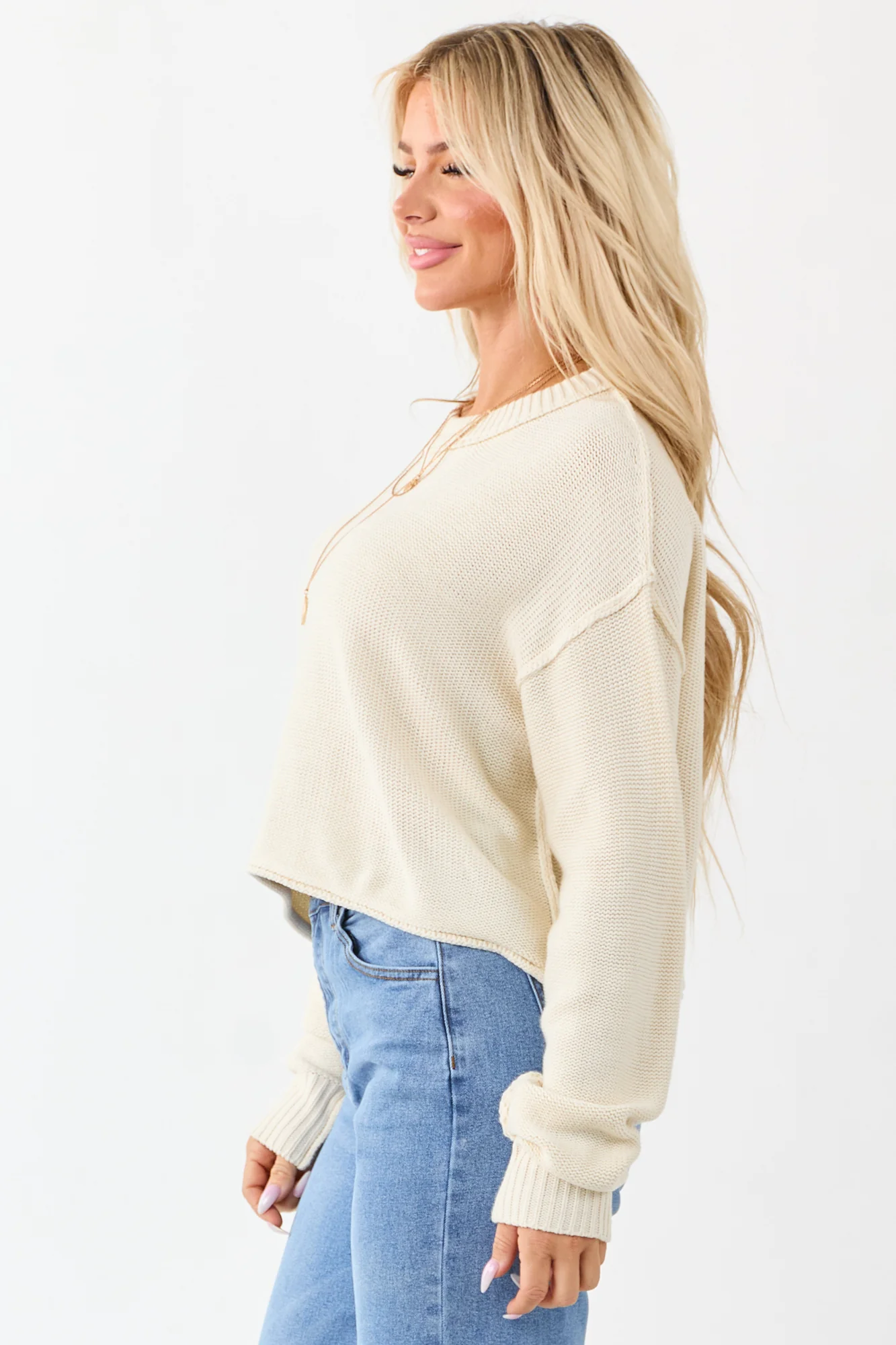 Indulge in the cozy comfort of our neutral cream long sleeve sweater. This soft knit features a relaxed, oversized fit with a wide, boxy design and stretchy feel. Enjoy the convenience of drop shoulders and banded trim, perfect for a semi-cropped style. Crafted from 100% Acrylic for ultimate comfort. Elevate your wardrobe with this effortlessly chic piece.