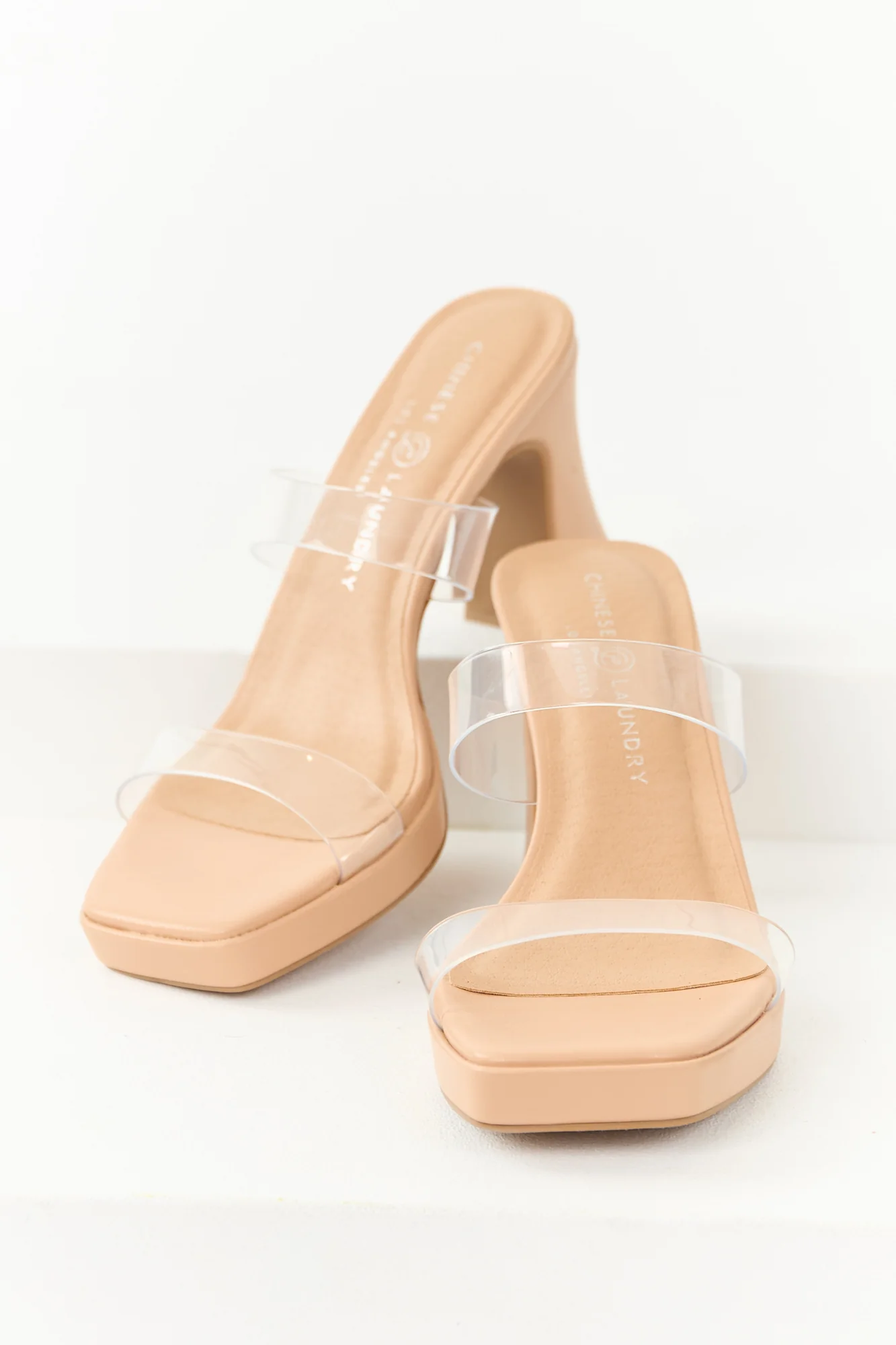 Step into style with these chic Nude Faux Leather Block Heels. Crafted from faux leather, these statement shoes feature a double clear strap design with a trendy square open toe. Enjoy comfort with a lightly cushioned insole and a stable rubber sole. Heel height of 3.5 inches and a 1-inch platform elevate your look. Imported.