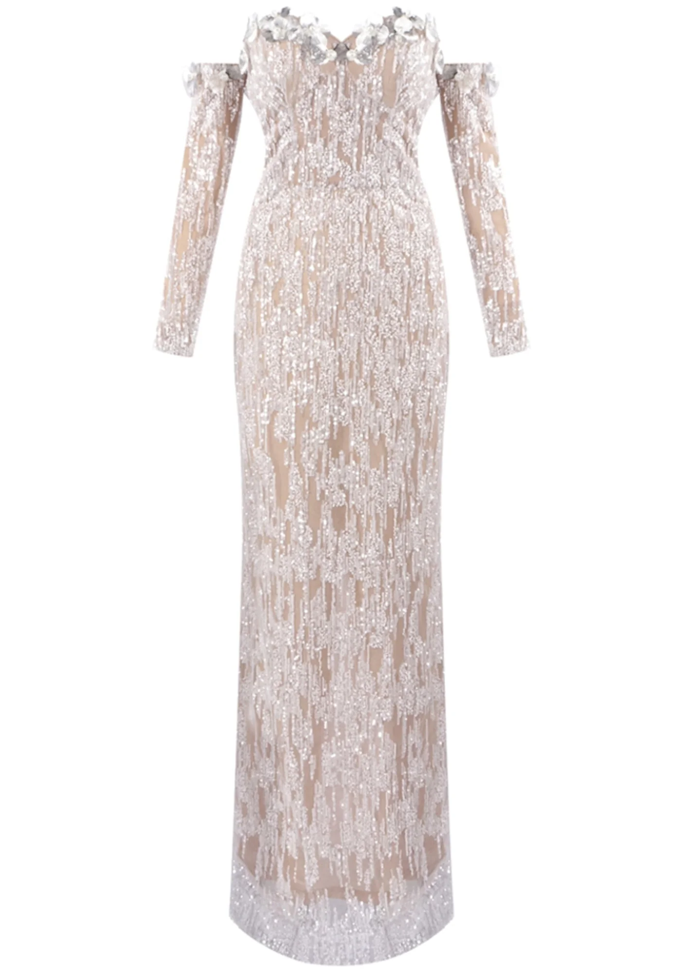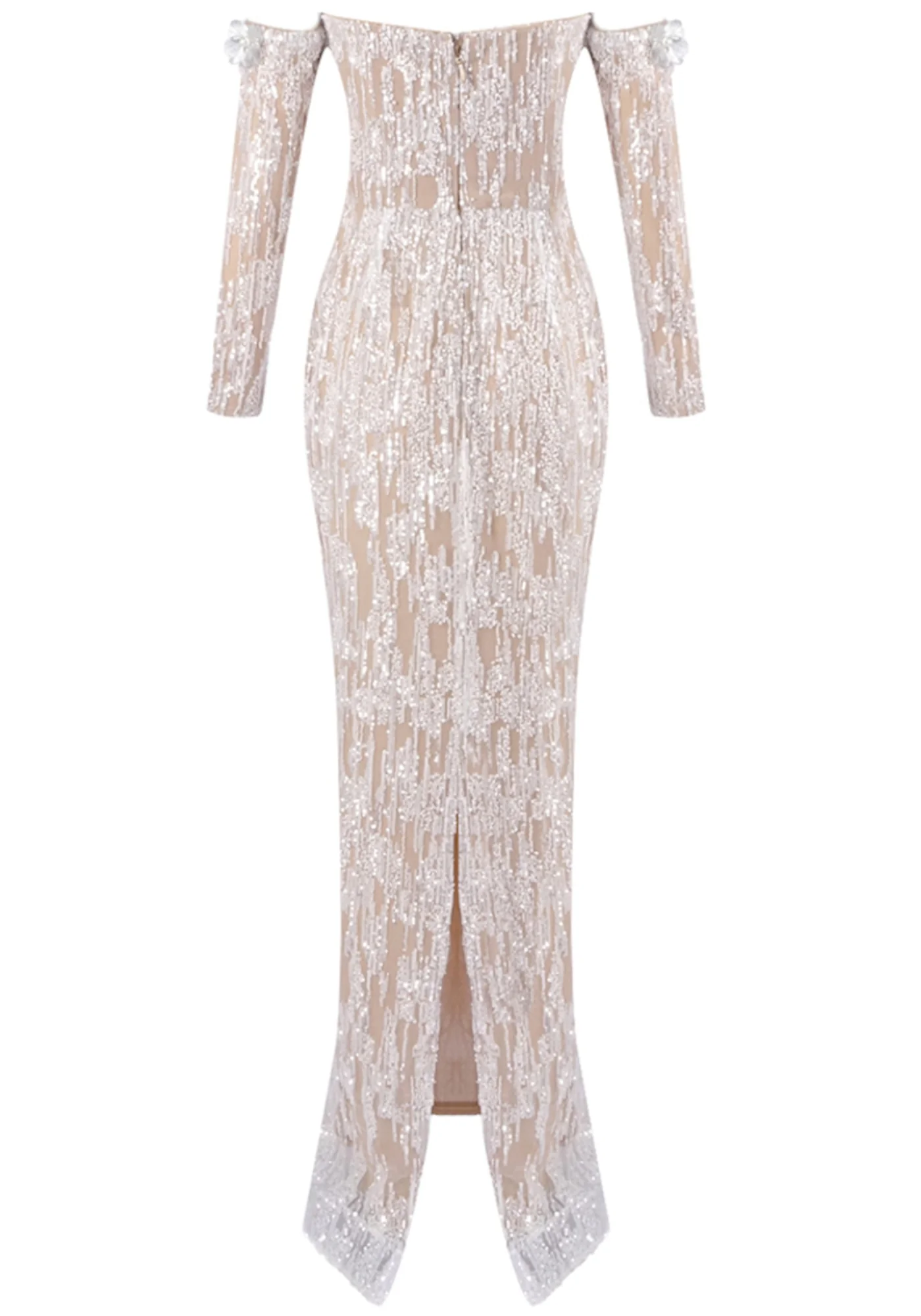 Elevate your style with our stunning Nude Sequined Off-Shoulder Maxi Dress featuring exquisite long sleeves and a sparkling sequined design. Made of high-quality polyester and cotton blend for durability and comfort. This elegant dress is perfect for special occasions. Carefully crafted with a concealed zipper for a seamless look. Keep heads turning with this captivating piece in your wardrobe. Make a statement. Order now!