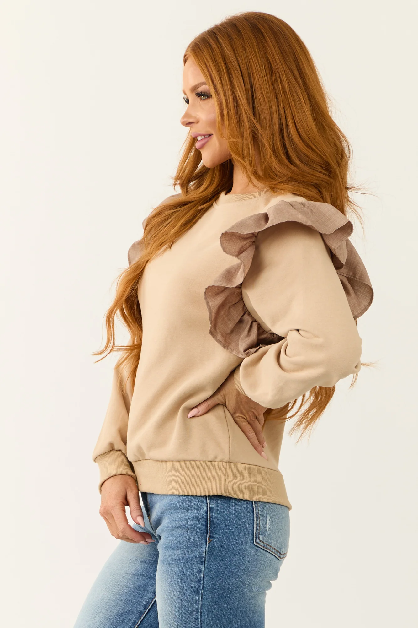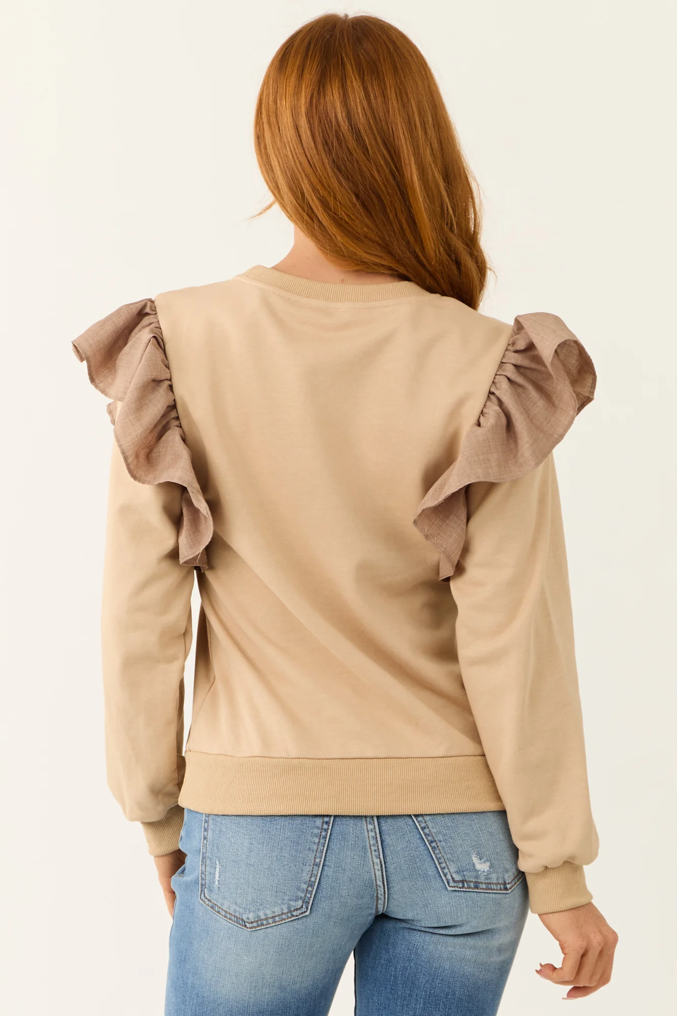 Indulge in style and comfort with our oatmeal ruffle detail long sleeve top. This chic top features elegant ruffle shoulders in a delightful mocha shade, designed with a crew neckline and banded ribbed trim. Expertly crafted from a luxurious blend of 80% Cotton and 20% Polyester, this non-stretchy woven top is perfect for various occasions. Care instructions: Hand wash cold, lay flat to dry. Model is wearing a size Small. Elevate your wardrobe with this sophisticated piece.