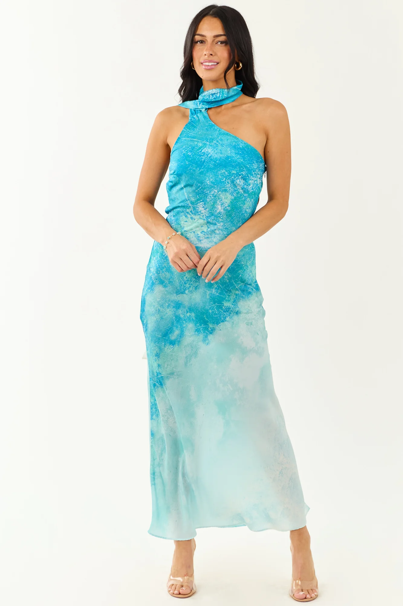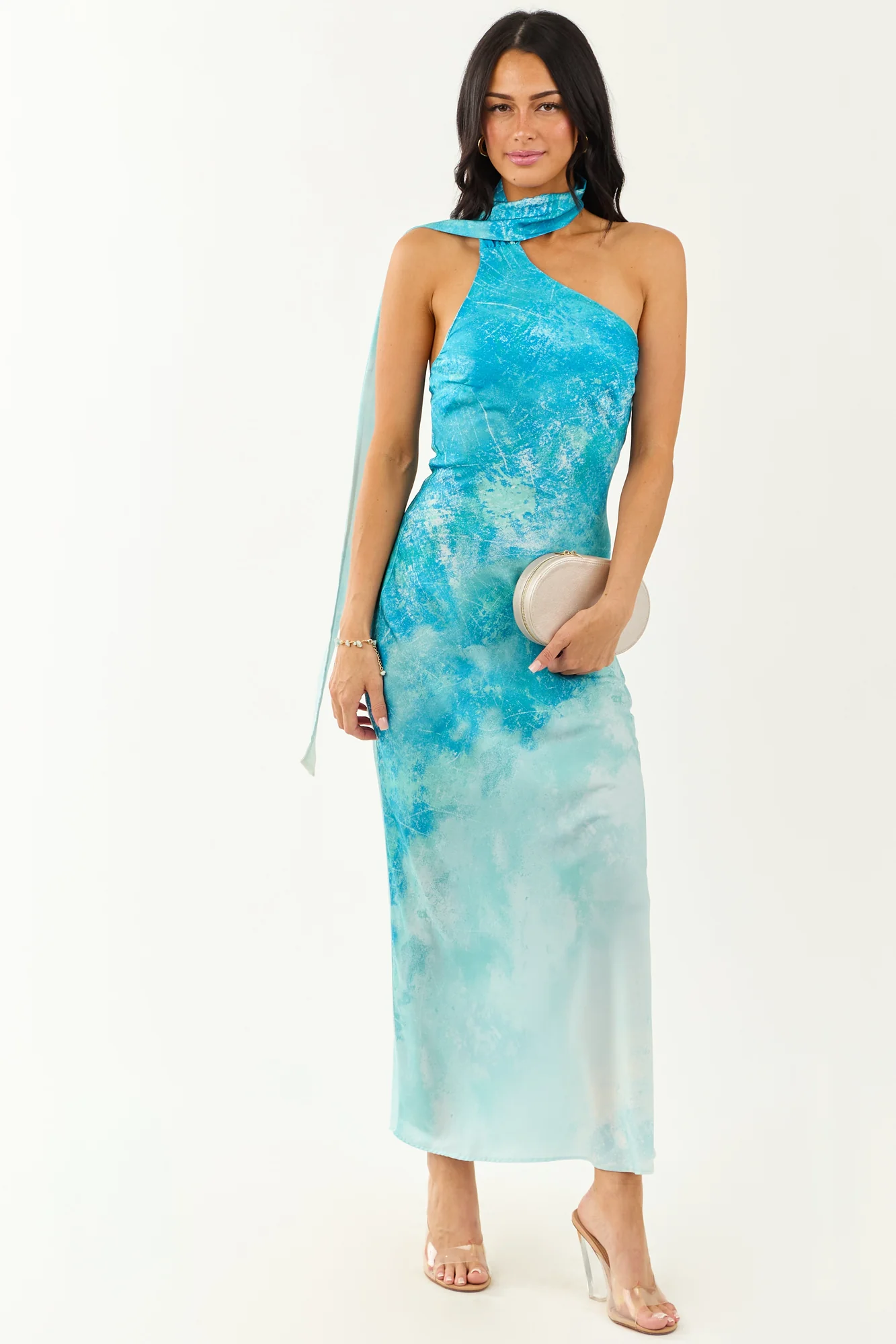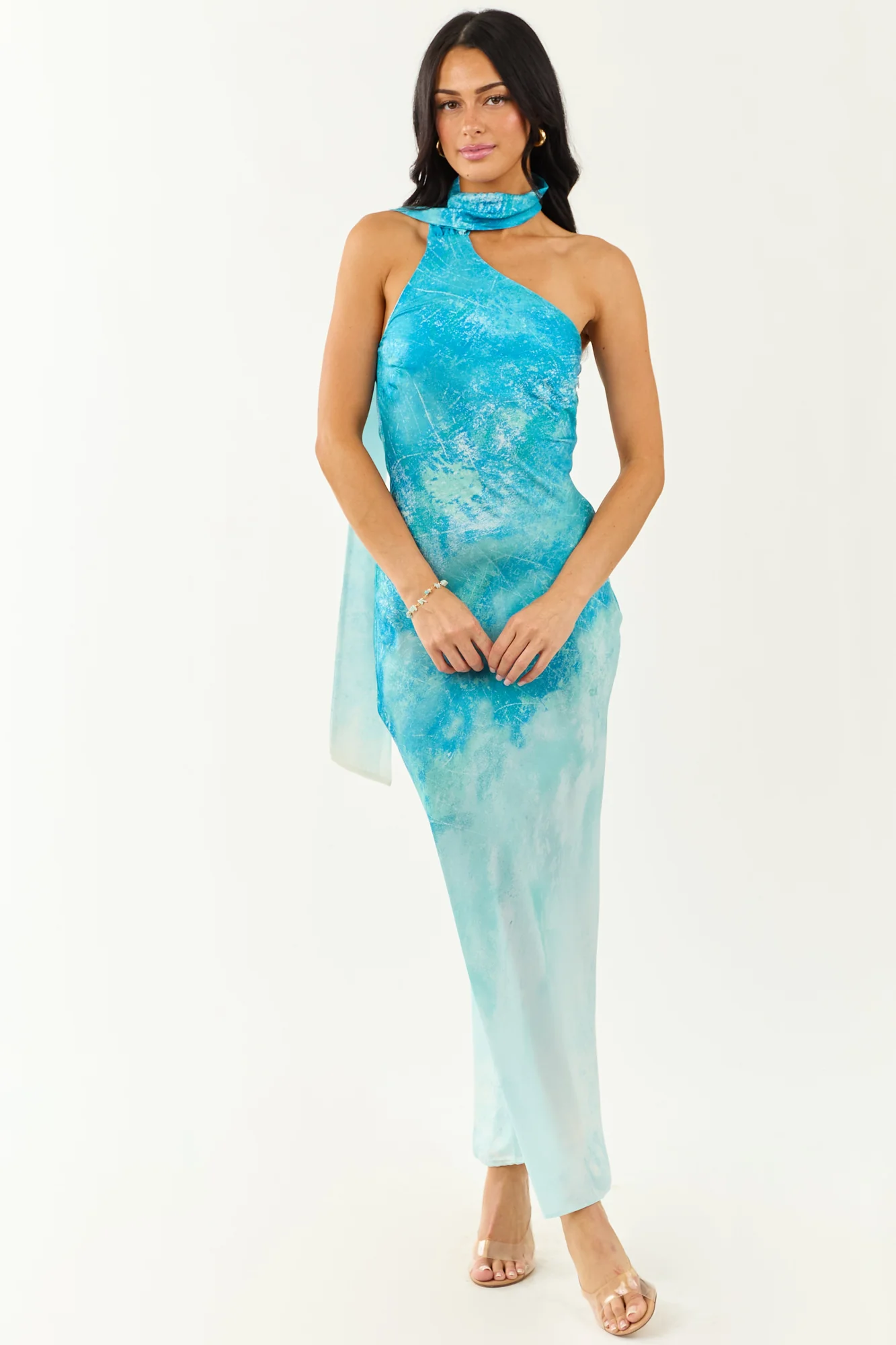 Indulge in the tranquil elegance of the ocean with our ombre maxi dress. Designed to flow like the tide with a one-shoulder sash, hidden side zipper, and ocean-inspired shades of Turquoise, Off White, Seafoam, and Sapphire. This dress features stretchy elastic back, neck sash with button closure, and is made of 100% Polyester. Unleash your inner elegance and captivate every eye with this exquisite piece. Available in sizes XS to XL.