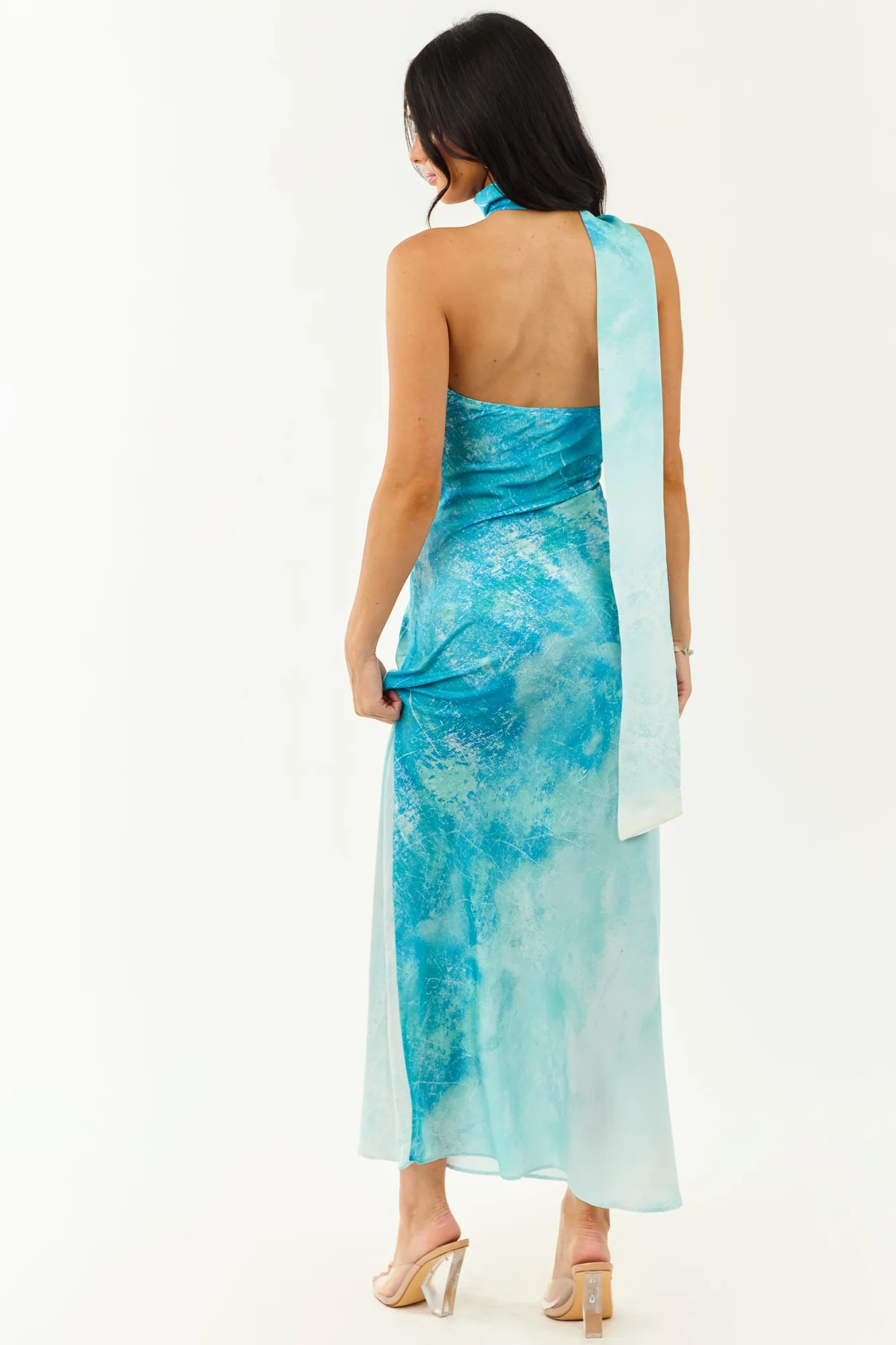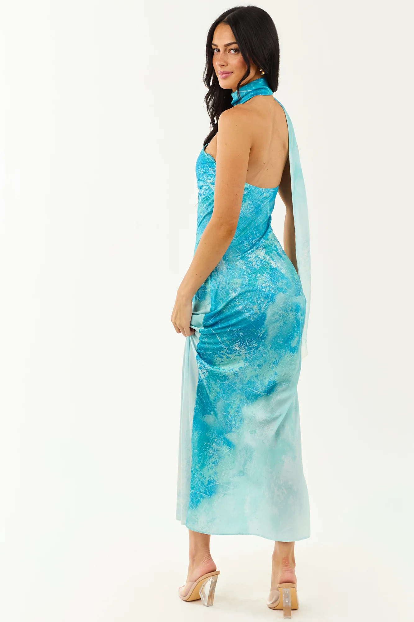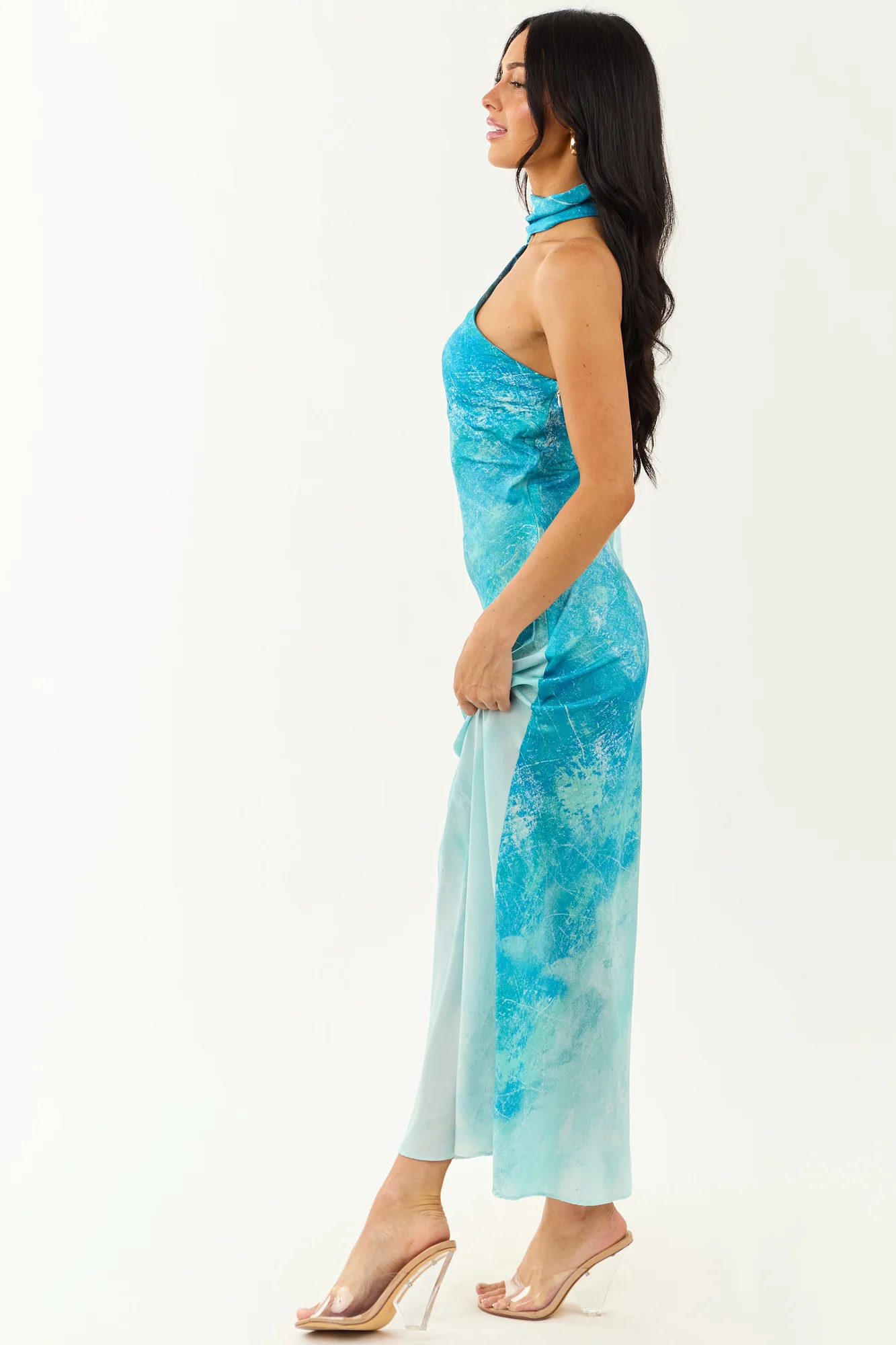 Indulge in the tranquil elegance of the ocean with our ombre maxi dress. Designed to flow like the tide with a one-shoulder sash, hidden side zipper, and ocean-inspired shades of Turquoise, Off White, Seafoam, and Sapphire. This dress features stretchy elastic back, neck sash with button closure, and is made of 100% Polyester. Unleash your inner elegance and captivate every eye with this exquisite piece. Available in sizes XS to XL.