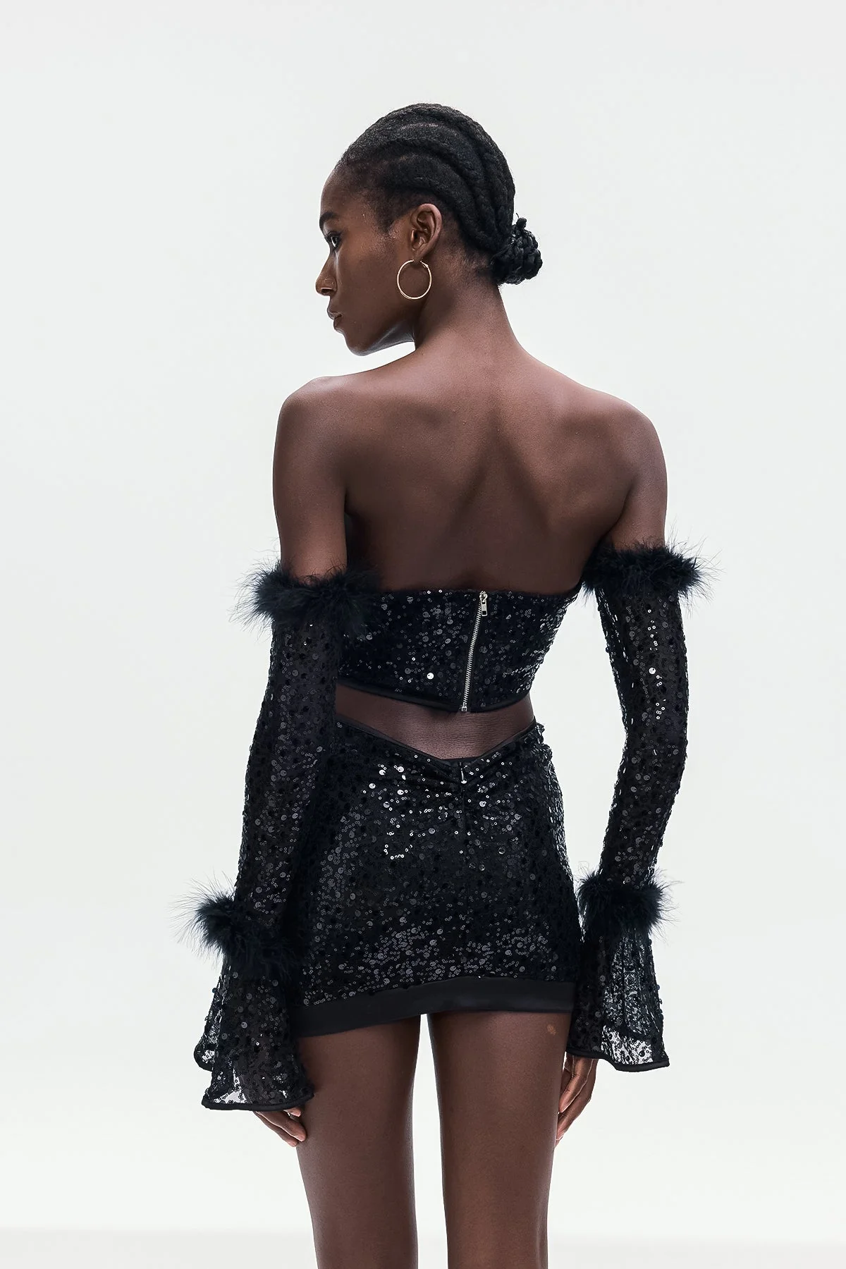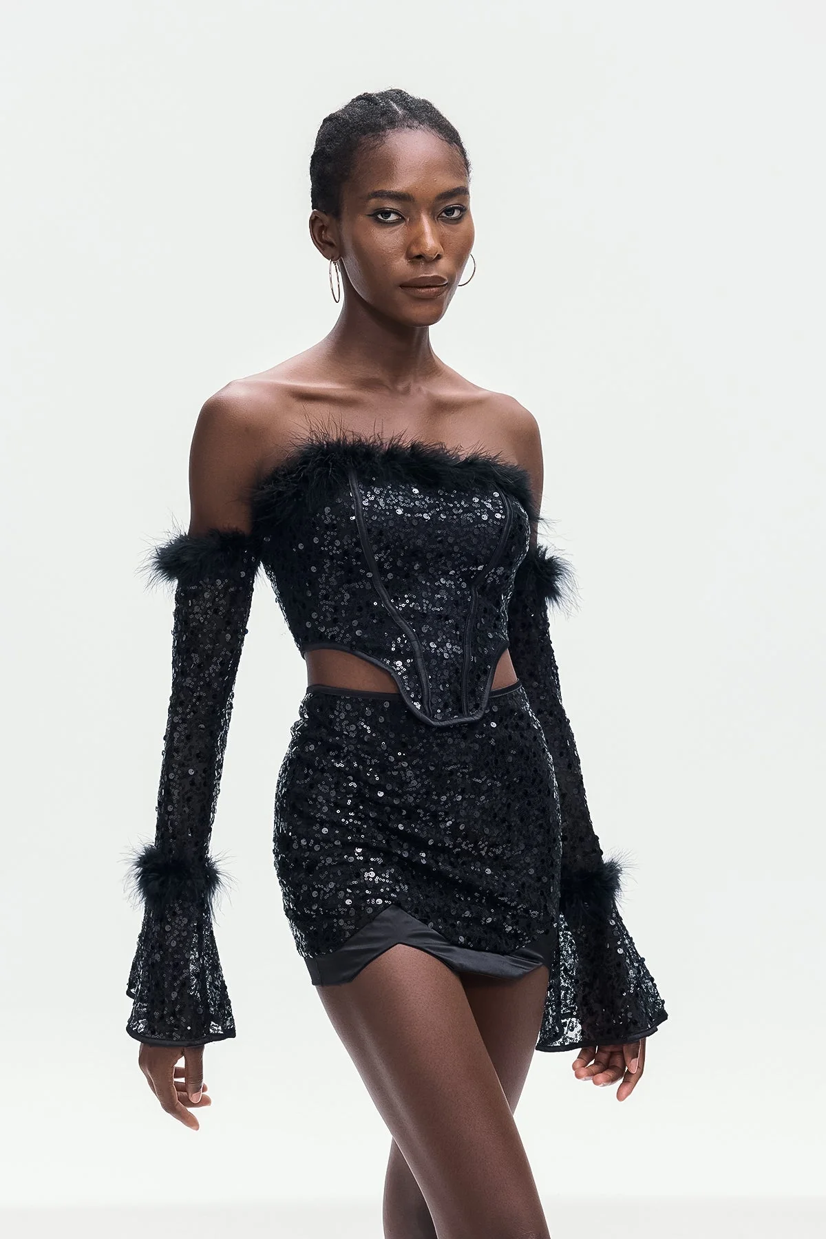 Elevate your style with the Off Shoulder Faux Fur Sequin Skirt Set. This stunning set features an off-shoulder design, luxurious faux fur, and eye-catching sequin accents – perfect for any special occasion. Made of 50% Polyester and 50% Cotton. Non-stretch material. Clean with gentle machine wash. Color may vary due to lighting. Order both the skirt and top for a complete set.