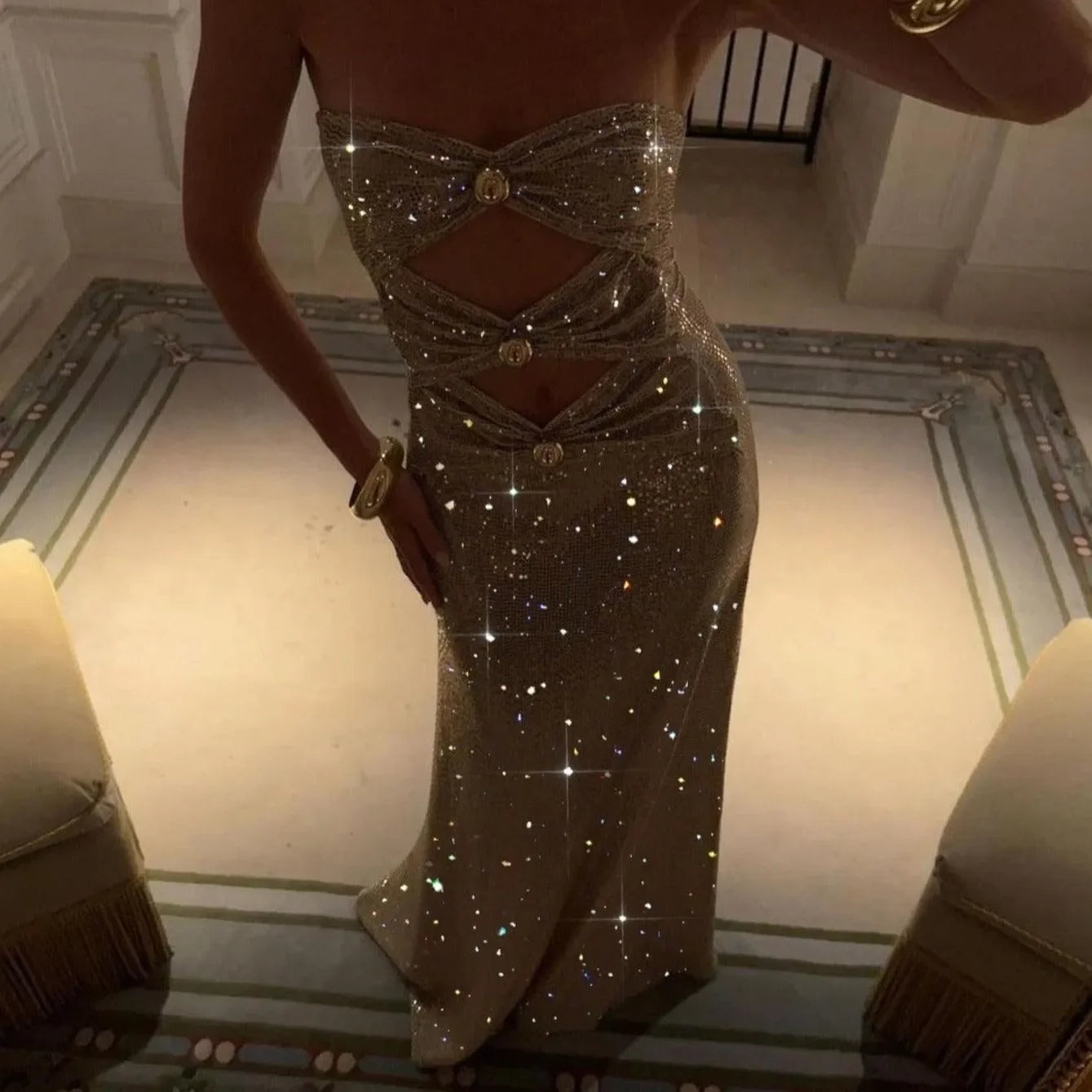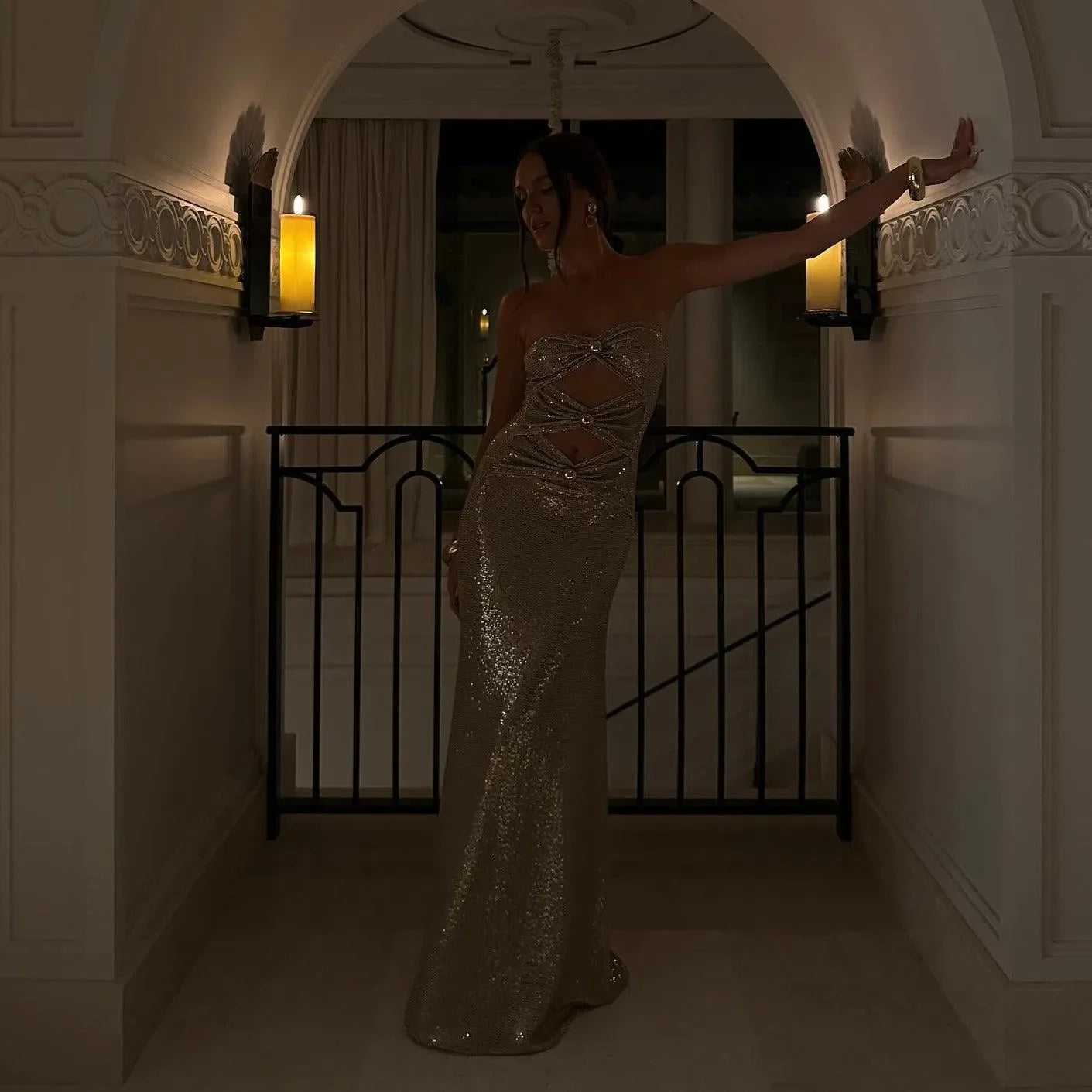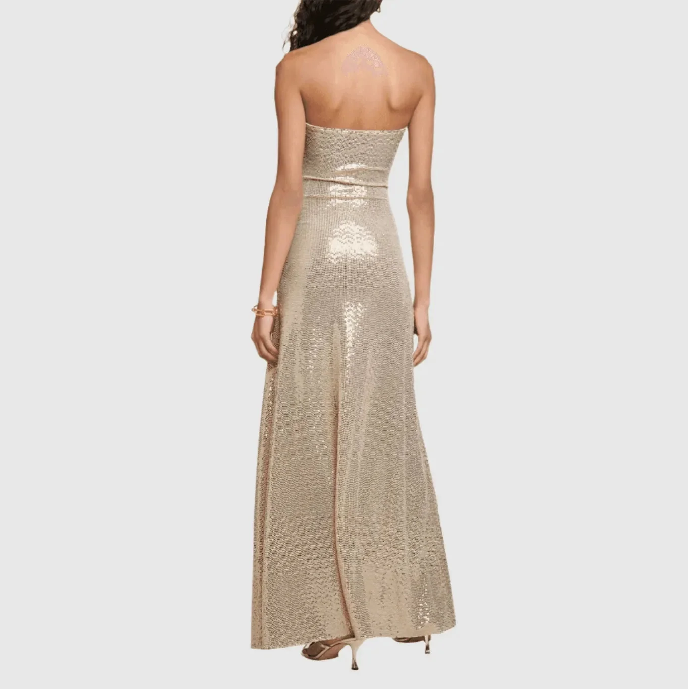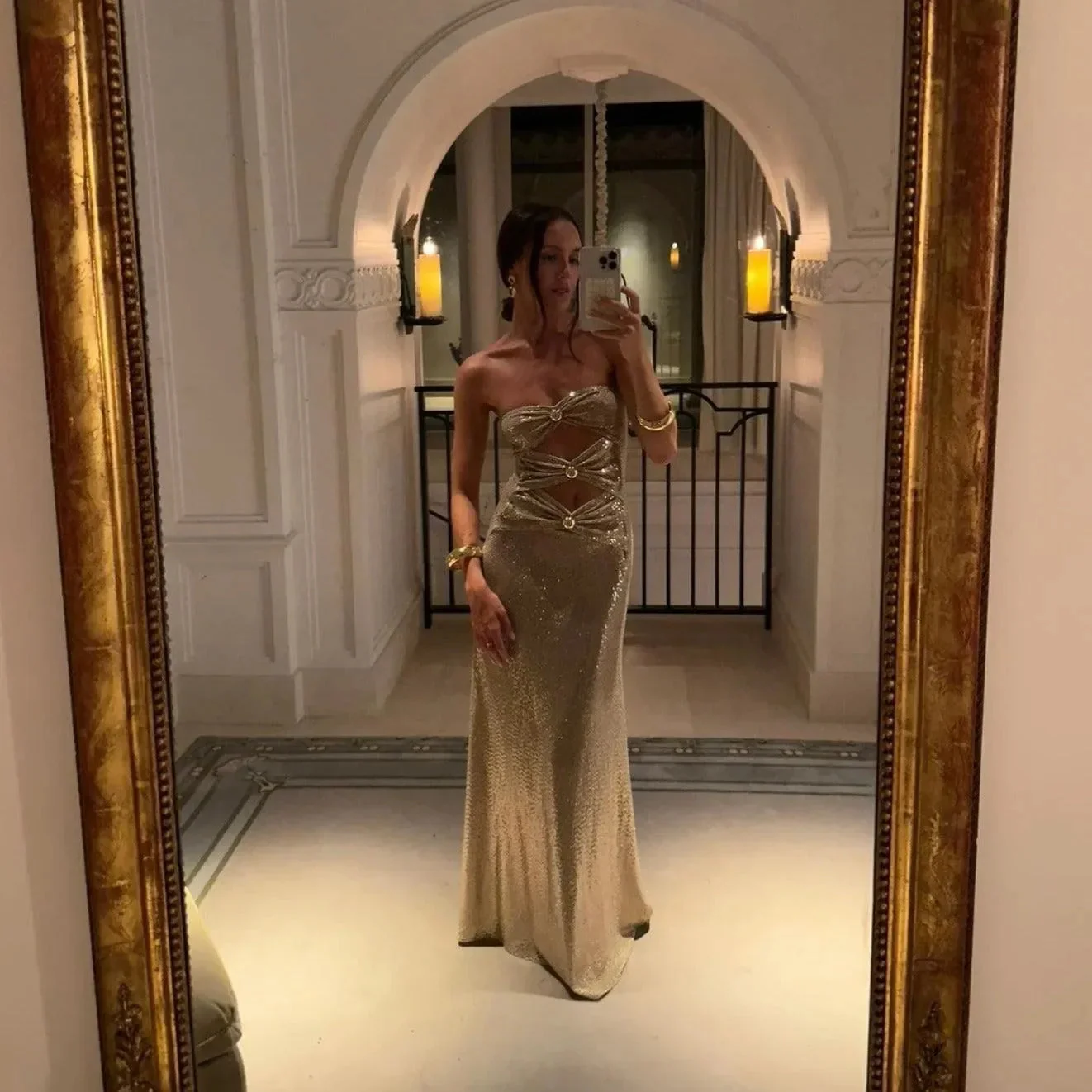 Elevate your style with our stunning Off-Shoulder Maxi Dress in gold. Perfect for special occasions, this dress features a chic cutout design, flattering off-shoulder neckline, and a flowy silhouette for all-day comfort. Crafted from high-quality fabric with a stylish slit for extra flair. Discover true style with our Instagram inspiration @mermaid_way. This strapless dress offers a relaxed fit from the hip down, made of mid-weight, stretchy fabric blend of polyamide, elastane, and metallic fibers ensuring a perfect fit. Enjoy size exchange if needed.