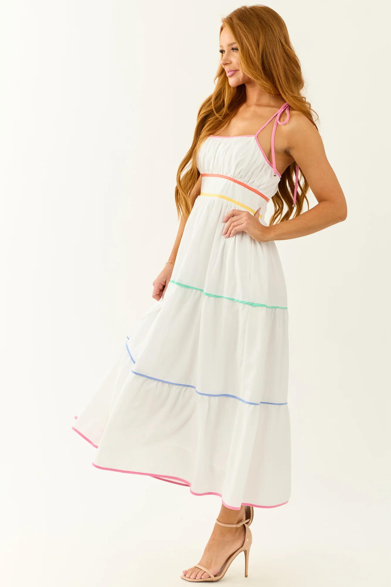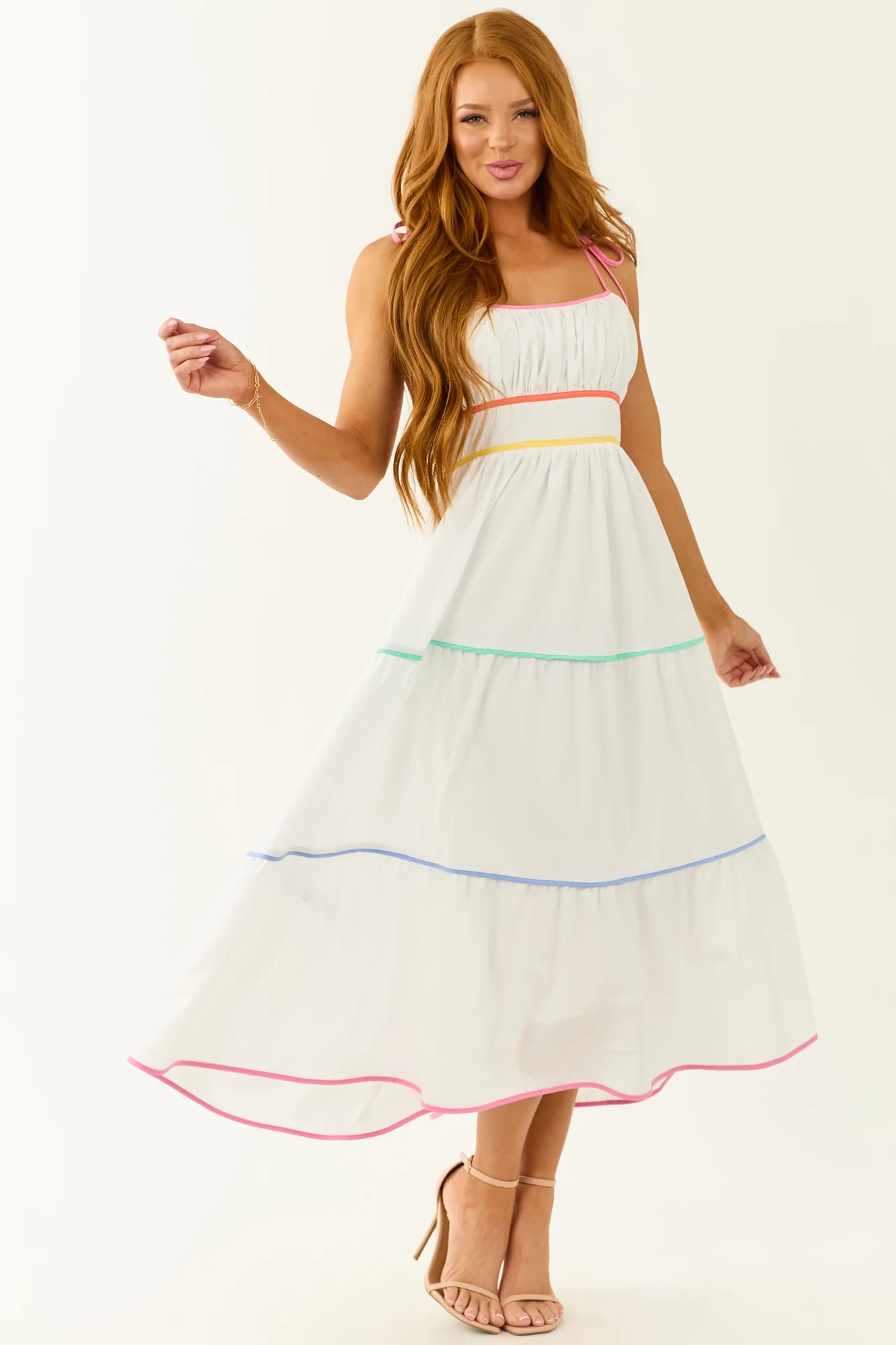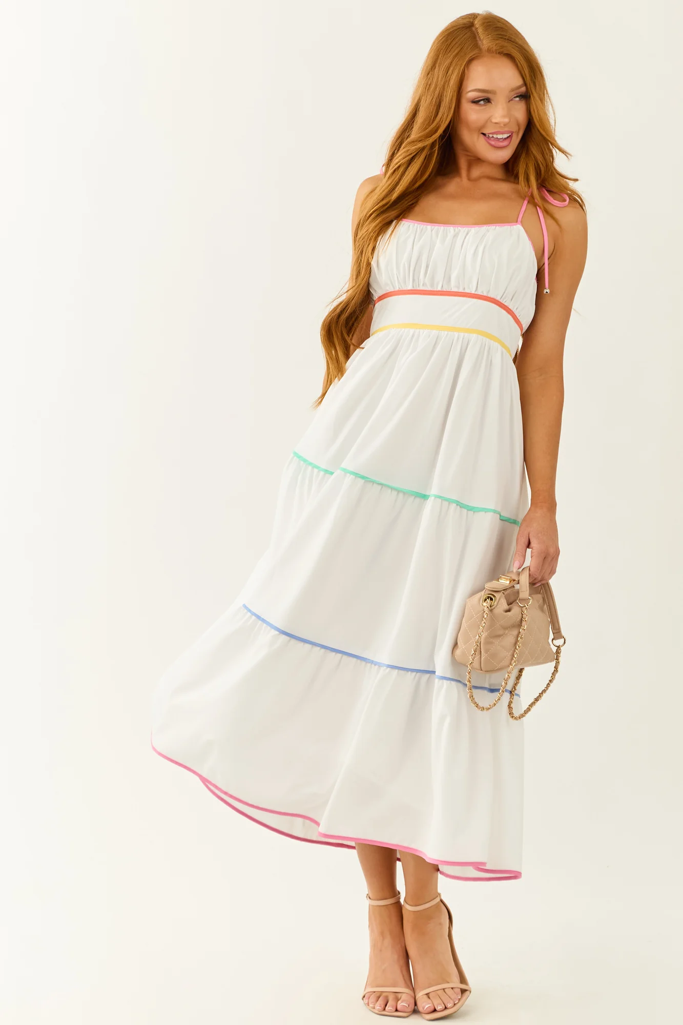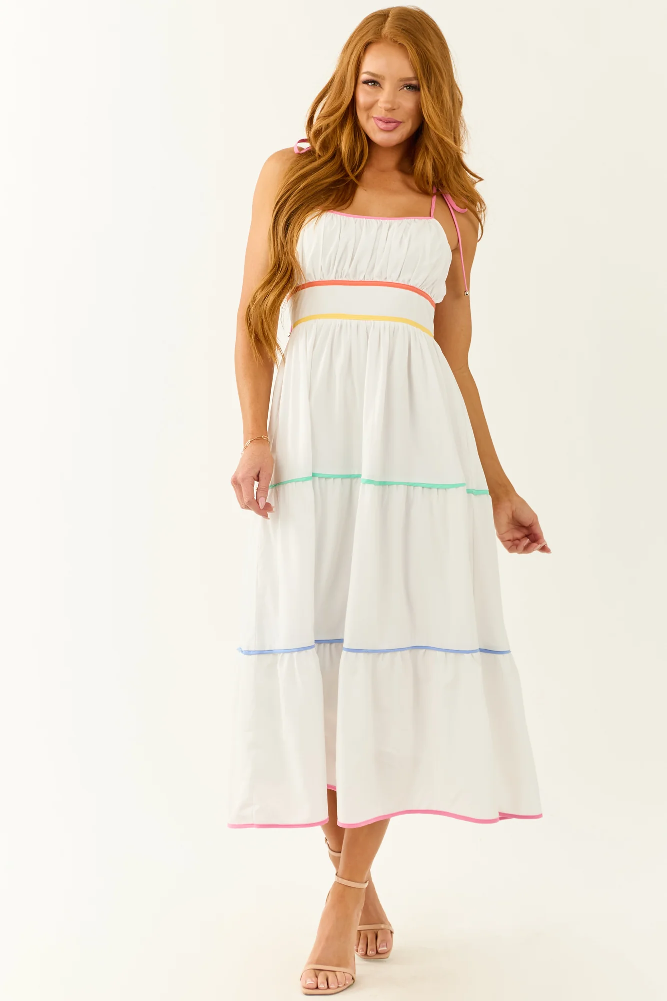 This off white sleeveless dress features vibrant tiers in Bubblegum, Coral, Lemon, Mint, and Periwinkle colors. It comes with a stretchy smocked back, back zipper with hook and eye closure, side pockets, ruched bust, and is lined for comfort. Available in sizes S, M, L. Made of 95% Polyester and 5% Spandex with a 100% Rayon lining. Perfect for a bright and breezy look at any occasion!