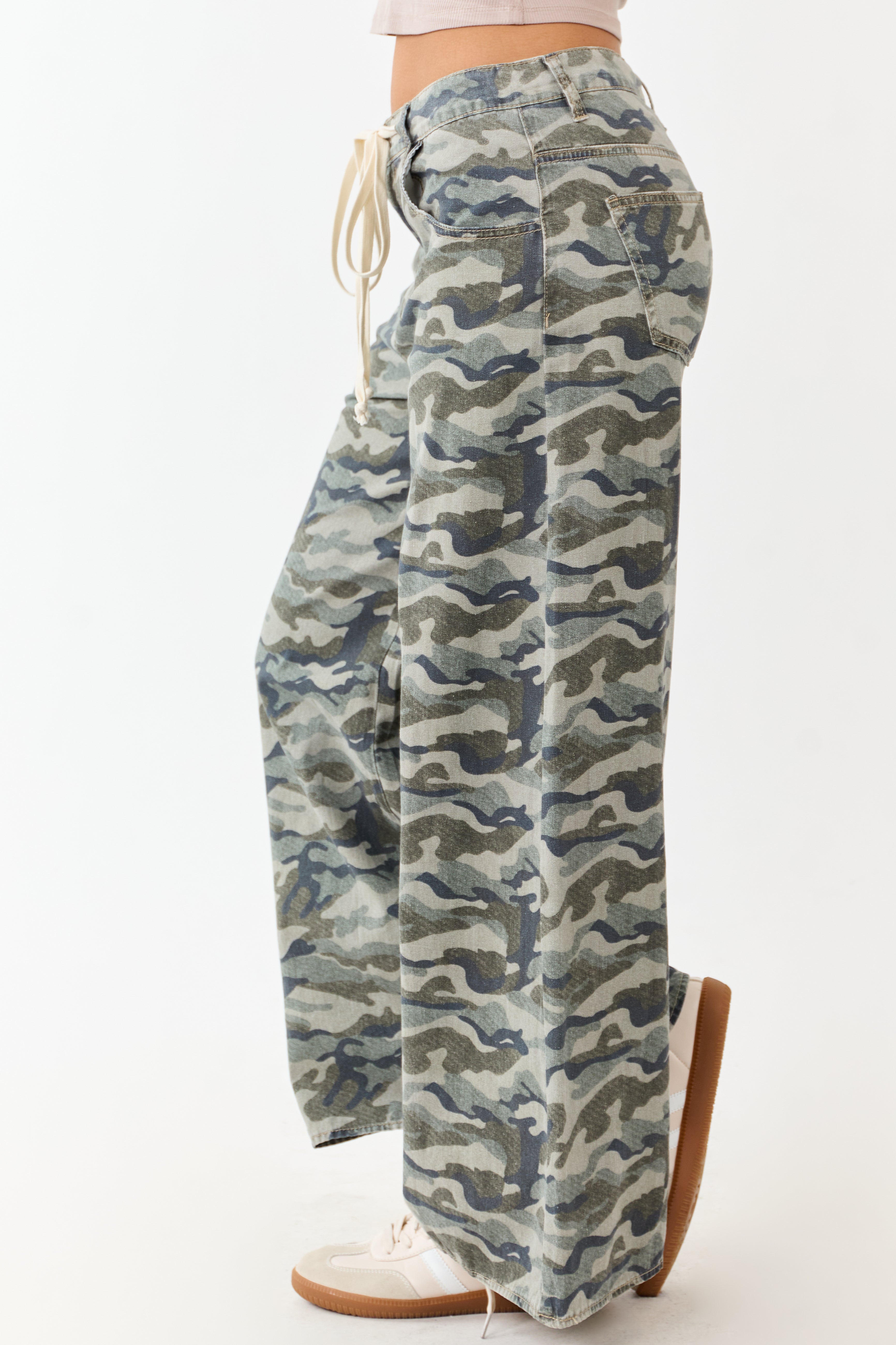 Stay fashionable and comfortable in these Olive Camo Wide Leg Drawstring Denim Pants . Designed with a relaxed drawstring waist, these non-stretchy lightweight denim pants feature a high waisted cut with a camo print in shades of Olive, Sage, Juniper, and Spruce. With an adjustable drawstring waistband, zipper fly, button closure, and five pockets for functionality. These ankle-length pants are made of 100% Cotton for a stylish yet relaxed look. Model is wearing a size Small – Size Chart: XS (0/2), S (4/6), M (8/10), L (12/14) and XL (16/18).