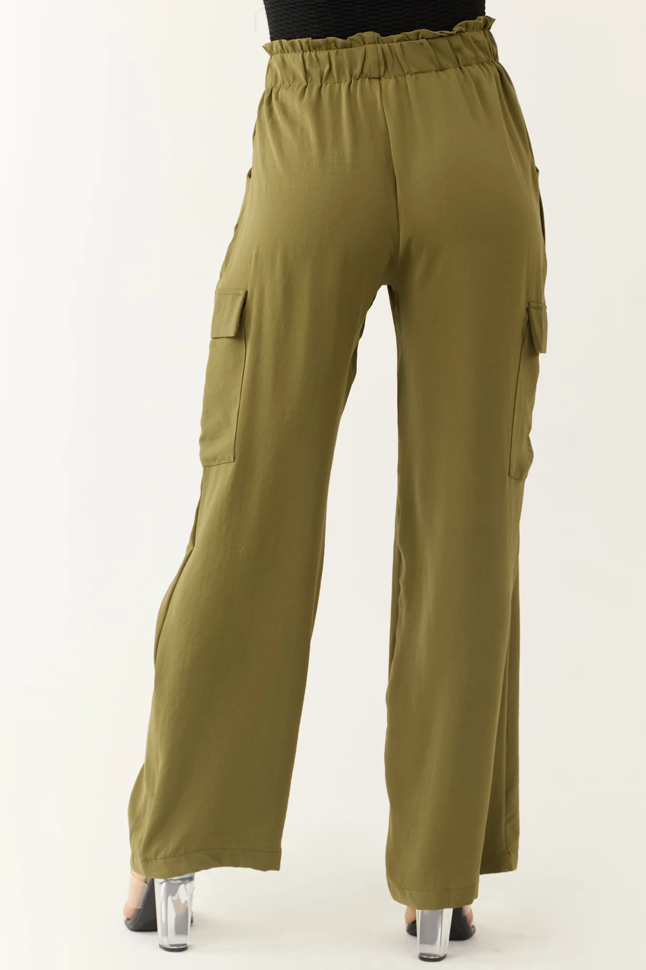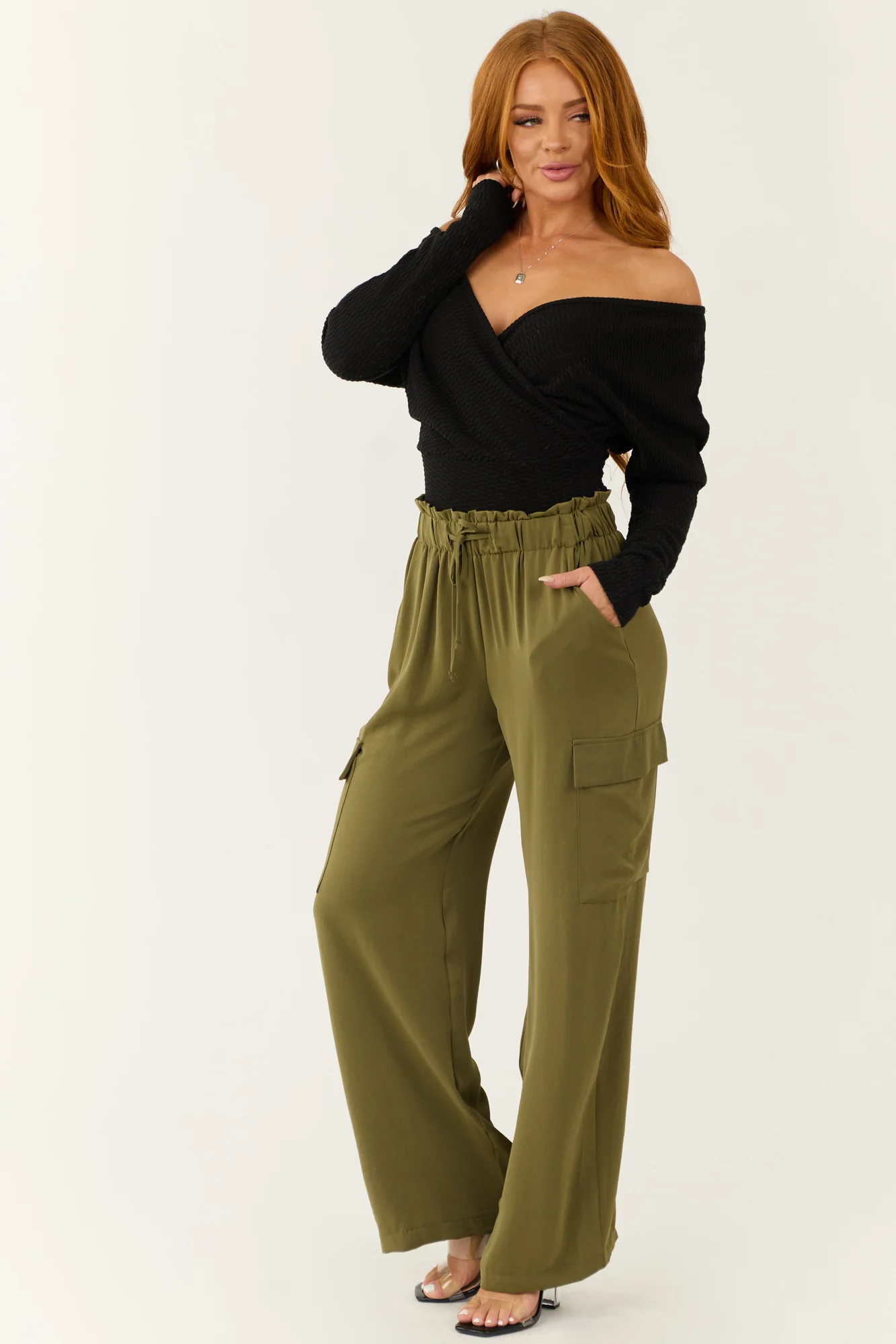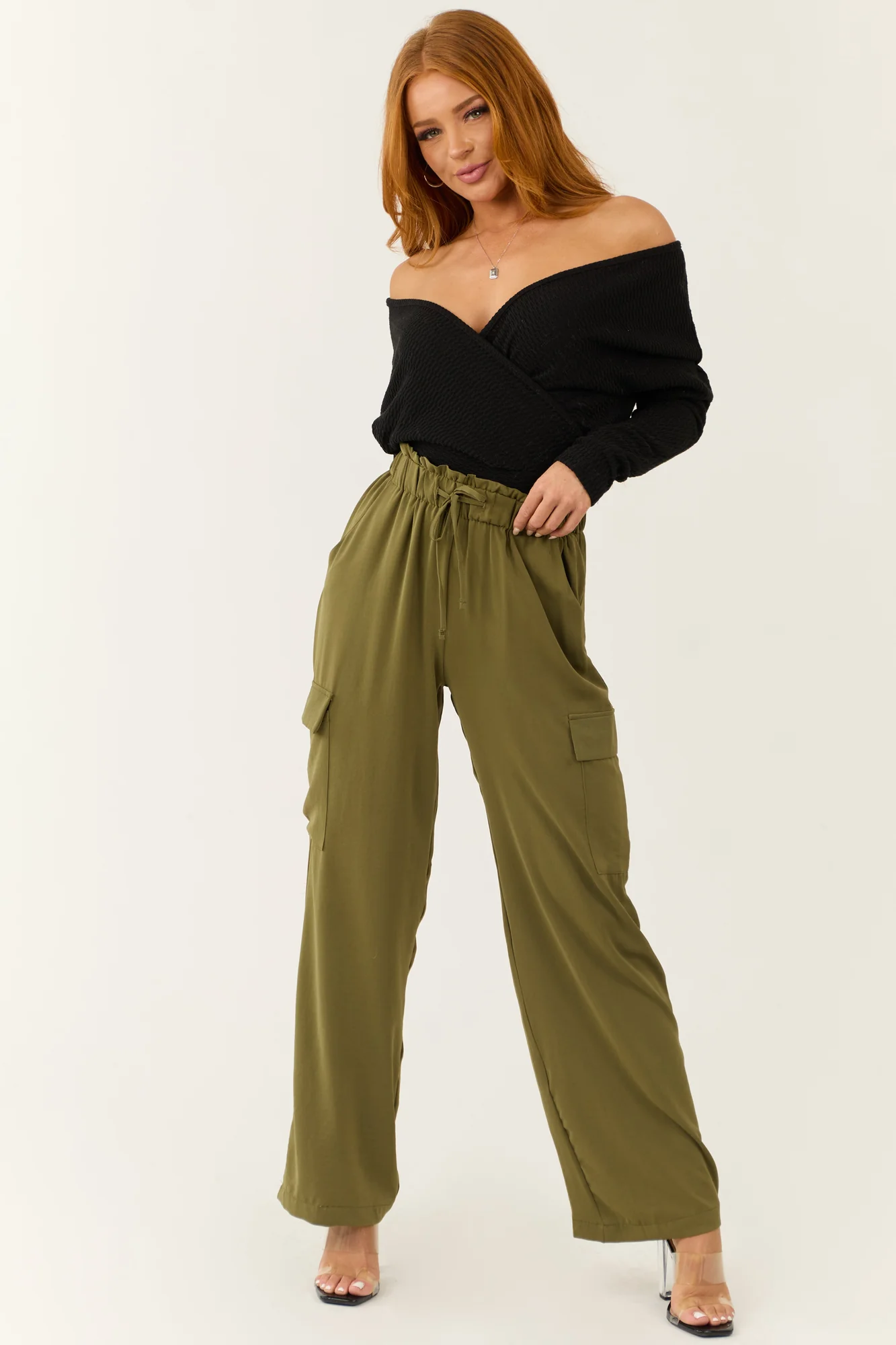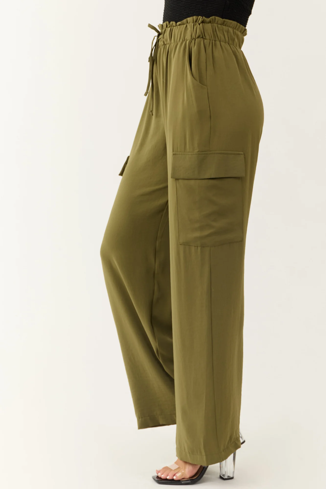 The Olive Drawstring Cargo Pants in S, M, L sizes feature a flowy, wide leg design with a high waist and an adjustable drawstring for a comfortable fit. Made of non-stretchy woven 100% Polyester, they include 2 side pockets and 2 cargo pockets. Perfect for daytime wear in fall and winter, these pants can be dressed up or down. Model is wearing a size Small. Waist sizes: S – 28-34″, M – 30-37″, L – 32-40″. Inseam lengths available: 30″, 31″, 32″. Imported. Care: Hand wash, iron low, dry flat.