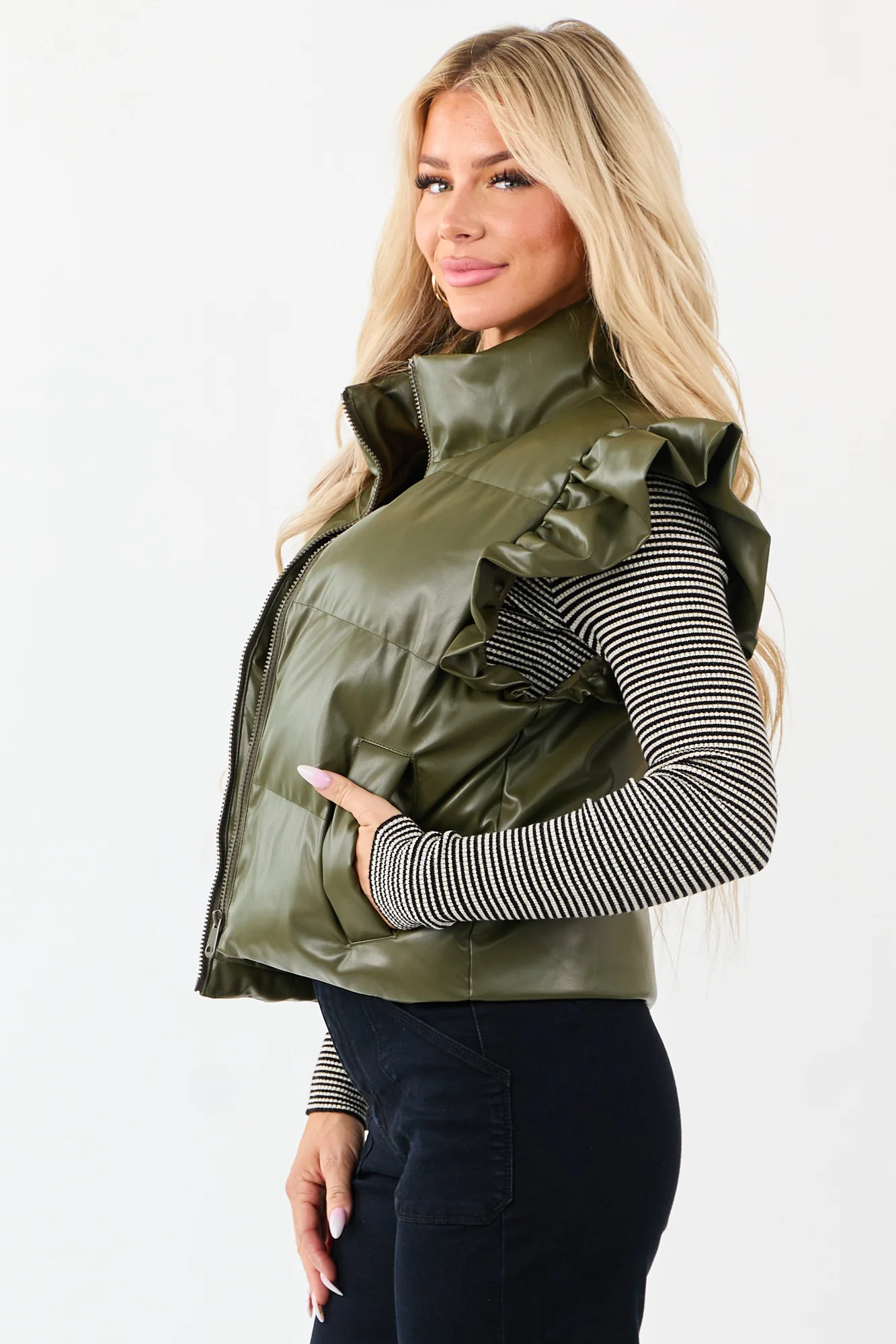 Elevate your outerwear collection with this chic olive faux leather puff vest featuring playful ruffle sleeves, a zip-up front, pockets, and a structured finish. Made from semi-stretchy faux leather, this vest offers both style and comfort. The vest is crafted from a blend of 50% Polyurethane and 50% Polyester with a 100% Polyester lining. Imported. Available in sizes S, M, and L. Model is wearing size Small. Models measurements: Size 3, Height 57, Bust 35, Waist 26.