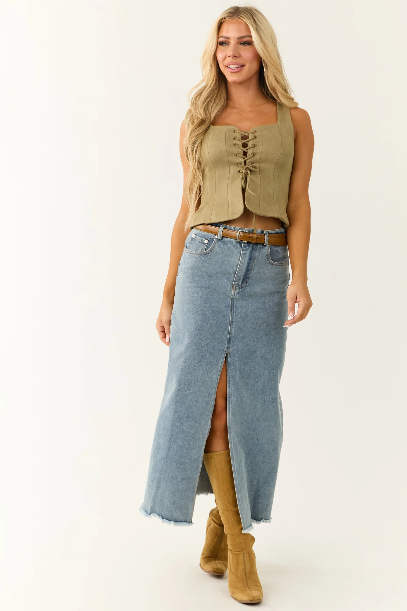 Enhance your wardrobe with our Olive Green Front Tie Cropped Tank Top, designed with a square neckline, sleeveless style, and open front for a trendy look. The semi-stretchy faux suede fabric ensures a comfortable fit. Available in sizes Small, Medium, and Large. Perfect for date nights and casual outings.