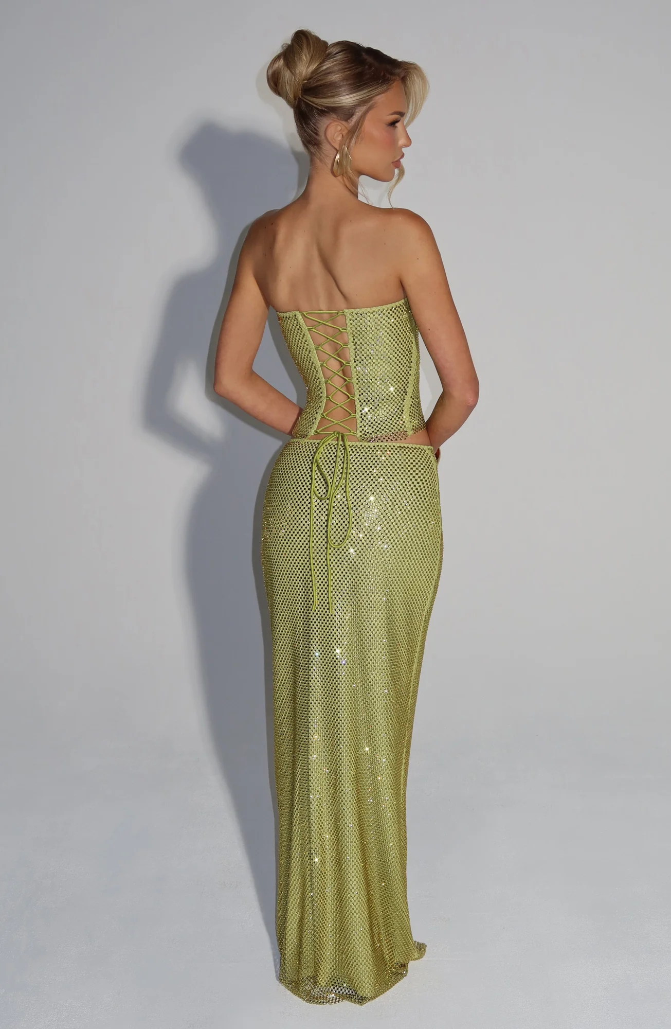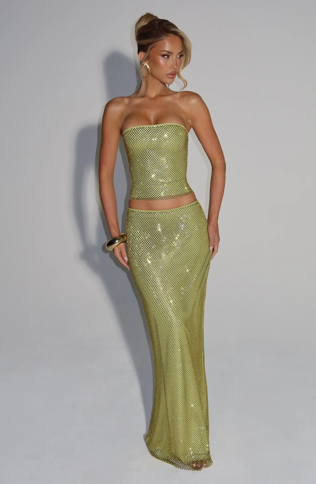 Elevate your wardrobe with the Olive Stretch Net Maxi Skirt embellished with square hotfix rhinestones. This mid-rise skirt boasts a semi-sheer look, an elastic waistband for a comfortable fit, and is fully mesh-lined. Perfect for pairing with the Serena Top for a stunning ensemble. Add a touch of sophistication to your style with this exquisite maxi skirt in olive green color. Ideal for evening events, parties, or summer gatherings. Enjoy a mix of style and comfort with the embellished design and semi-sheer appearance.