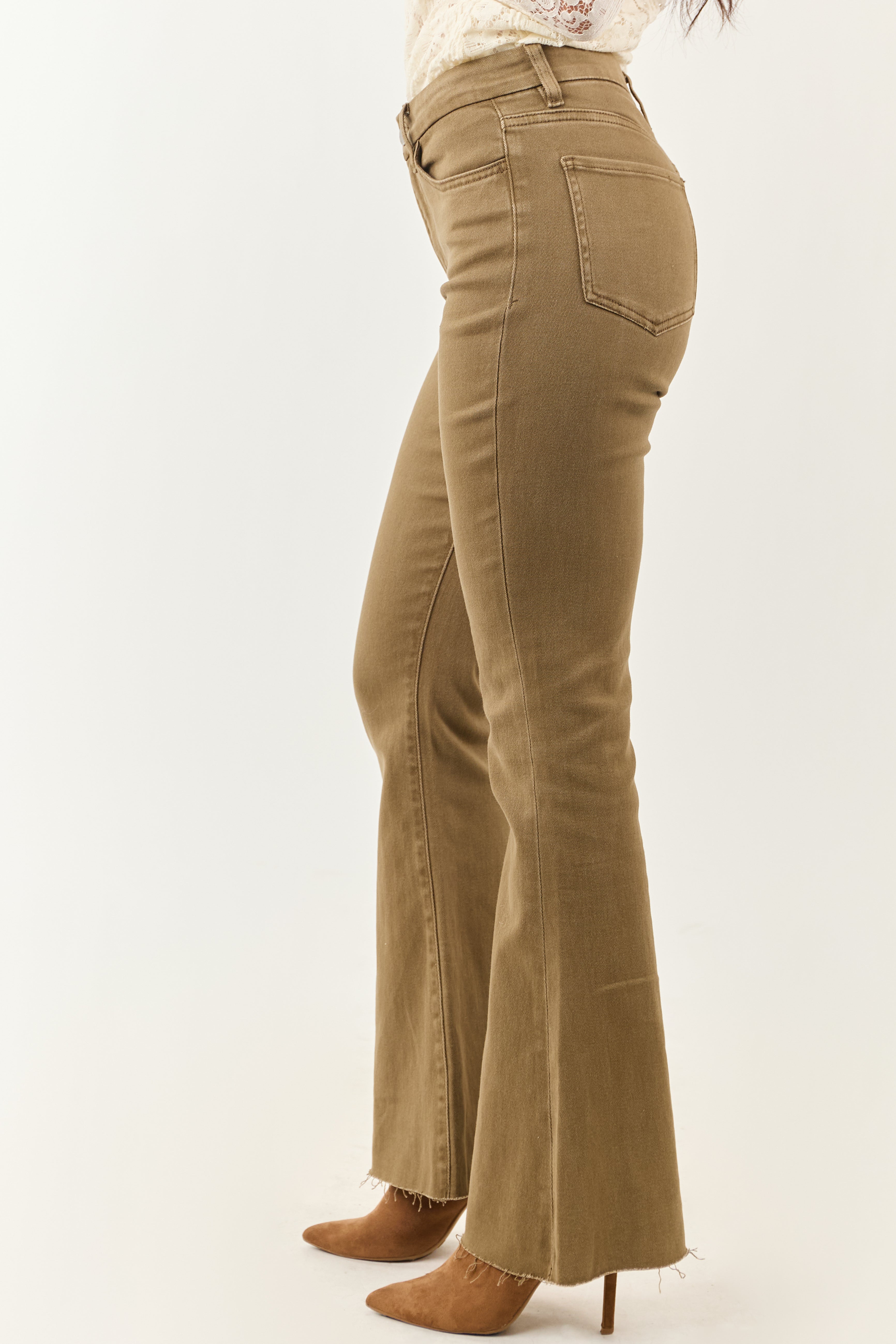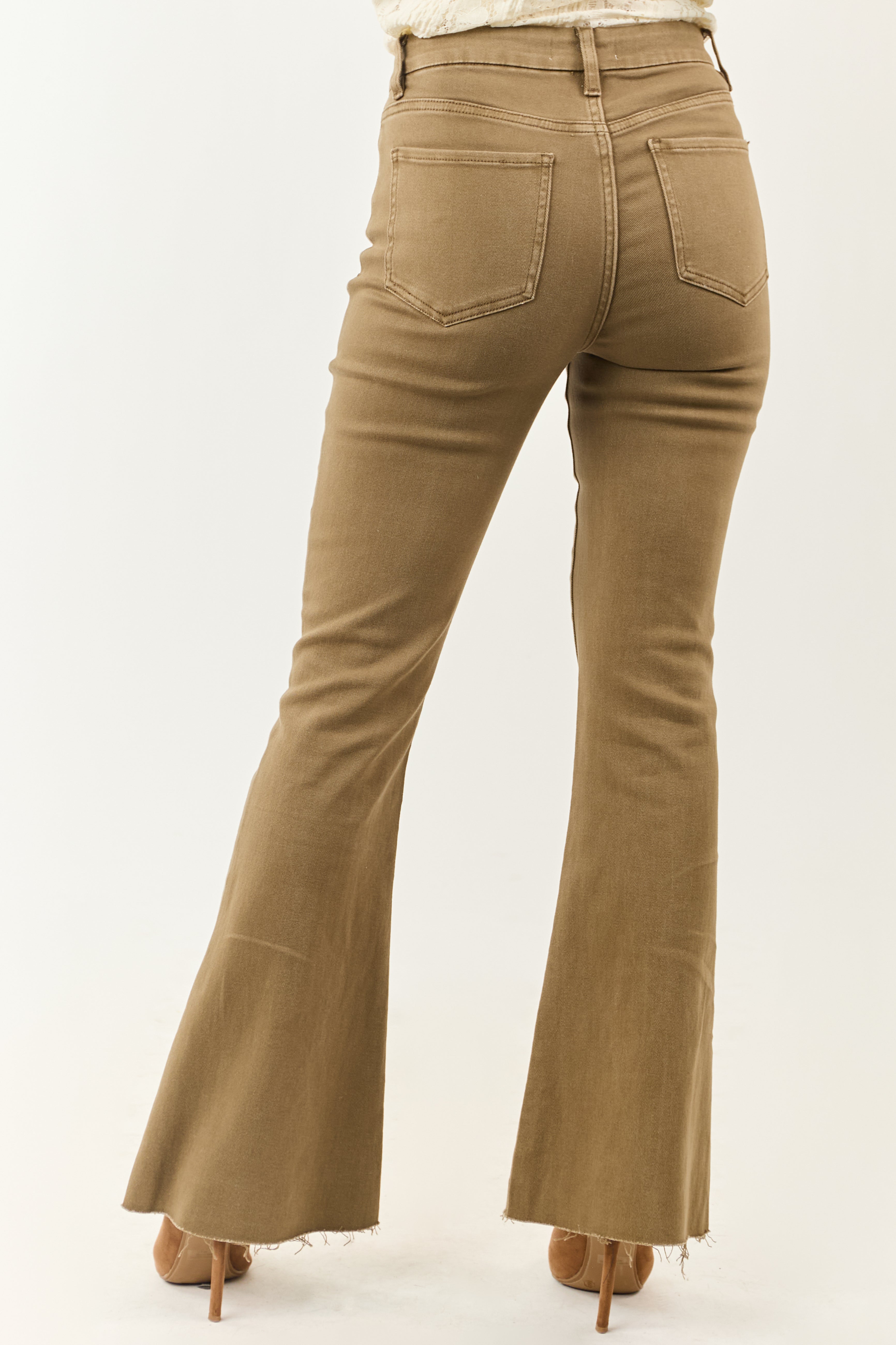 These olive high rise tall length flare jeans offer throwback vintage vibes that pair perfectly with platform heels. The stretchy denim ensures a comfortable fit while the high rise design complements your style. With a zipper fly, button closure, 5 pockets, and belt loops, these jeans are made of 98% cotton and 2% spandex for a flattering look. Available in various waist sizes from 26″ to 33″ and hip sizes from 30″ to 37″, these pants are ideal for women looking for a chic and trendy look. Size up if between sizes for the perfect fit. Inseam length is 32″. Imported.