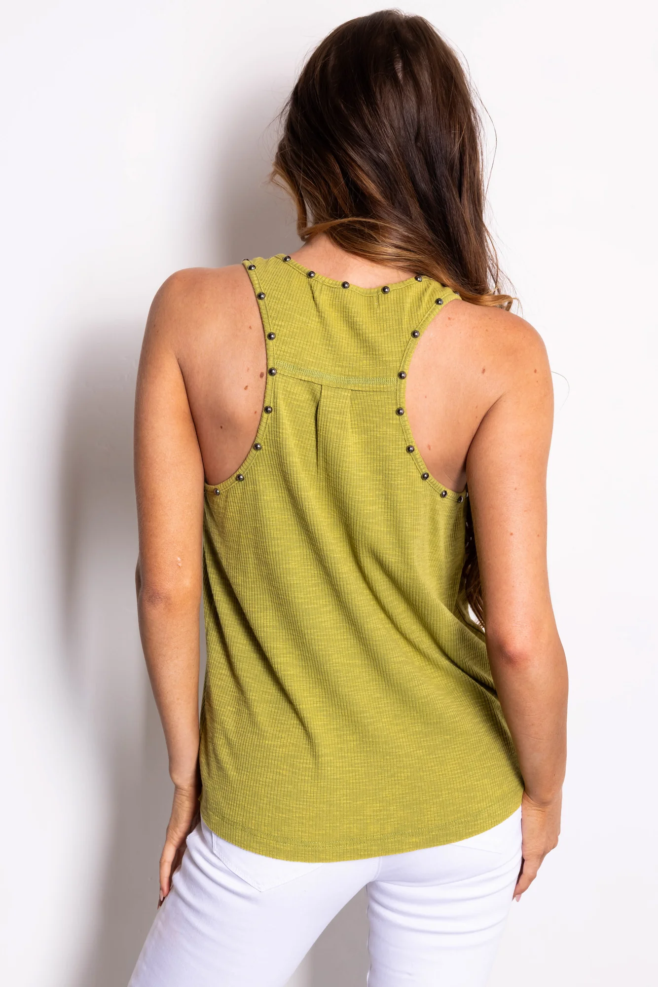 Step up your style with our Olive Studded Detail Ribbed Tank Top! Crafted from a stretchy ribbed knit, this sleeveless tank features a chic racerback design and elegant stitching detail. The rounded v neckline and rounded hemline add a touch of sophistication. Available in sizes S, M, and L with strap widths of 1.5, 1.75, and 2respectively. Perfect for casual or daytime wear, this tank is a must-have for your spring and summer wardrobe. Hand wash cold for best care. Each piece is unique due to the dying and washing process. Model is wearing a size Small. Model measurements: Size 2, Height 58, Bust 32, Waist 25