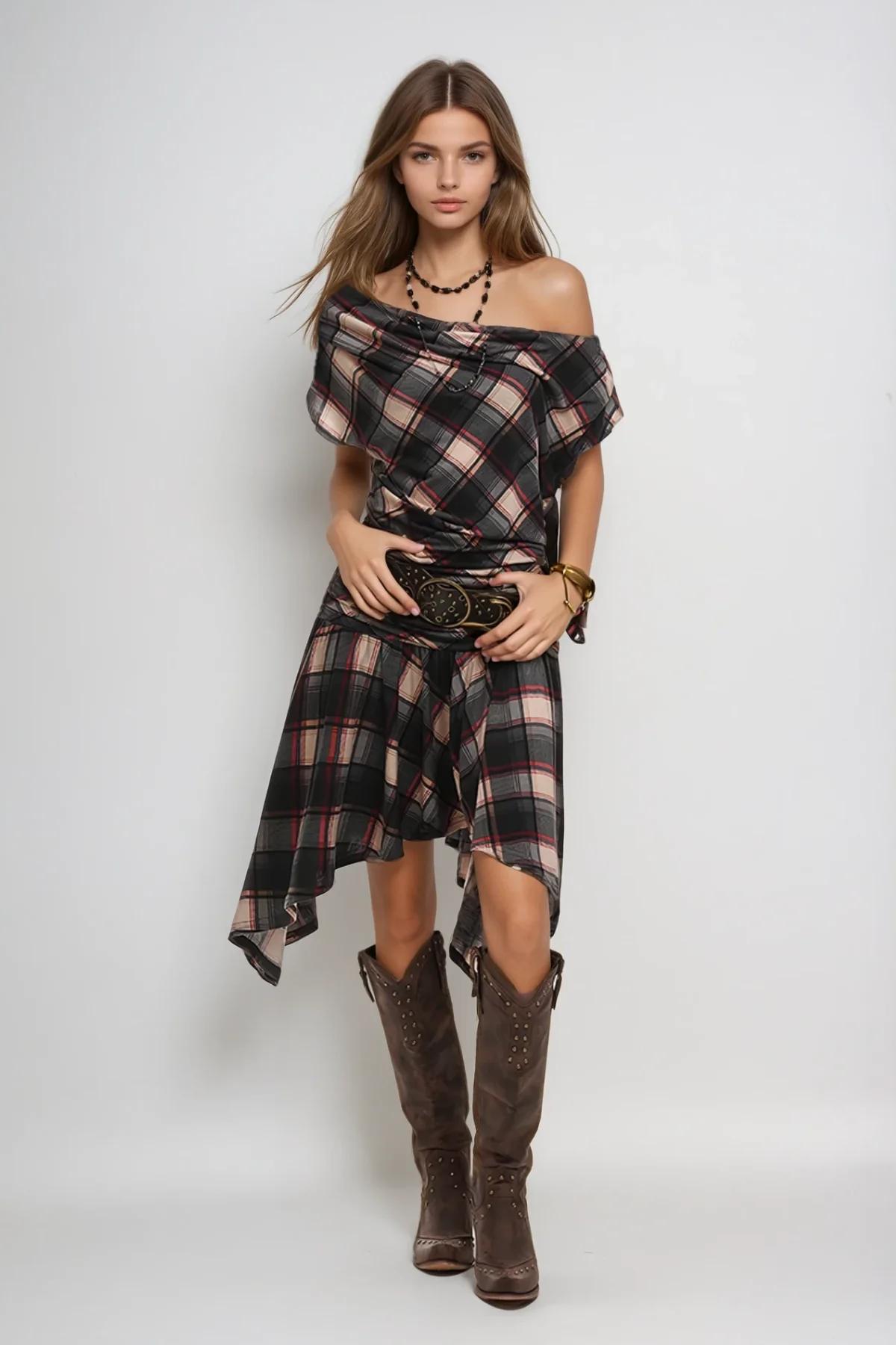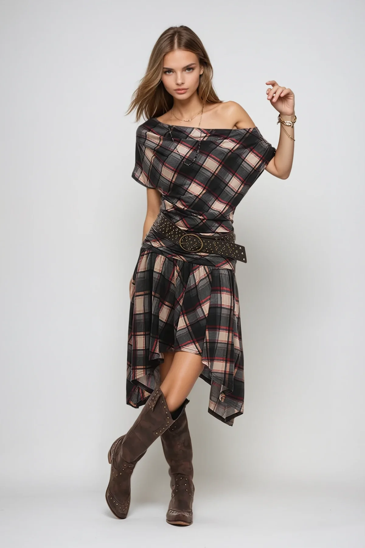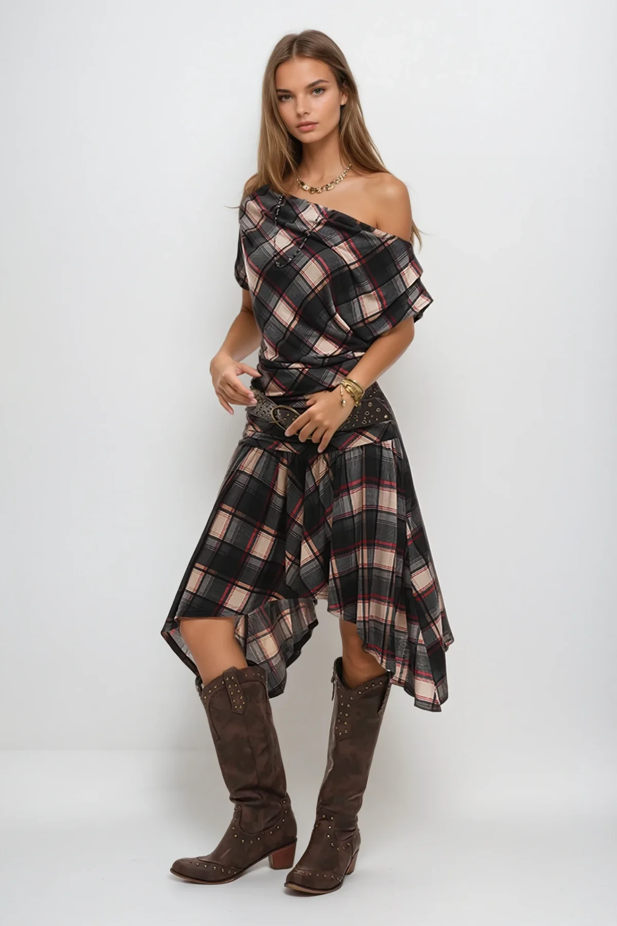 The One Shoulder Asymmetric Black Grid Midi Dress features a refined grid pattern that adds subtle texture and visual interest. Designed with a single shoulder and asymmetric hem, this midi dress offers a contemporary silhouette that enhances elegance and modernity. Ideal for occasions requiring polished style with a distinctive edge, its tailored fit ensures comfort while highlighting the wearers figure with sophistication. This dress seamlessly combines architectural design with wearable fashion, making it a versatile addition to any expert wardrobe. Experience the perfect blend of style and comfort all day long with this chic dress that embodies elegance and sophistication effortlessly. Discover how this unique piece can elevate your look and make you stand out from the crowd. Stretch Factor: Slight Stretch. Cleaning Care: Gentle machine wash recommended. Please note that the color may vary due to lighting conditions in the images.