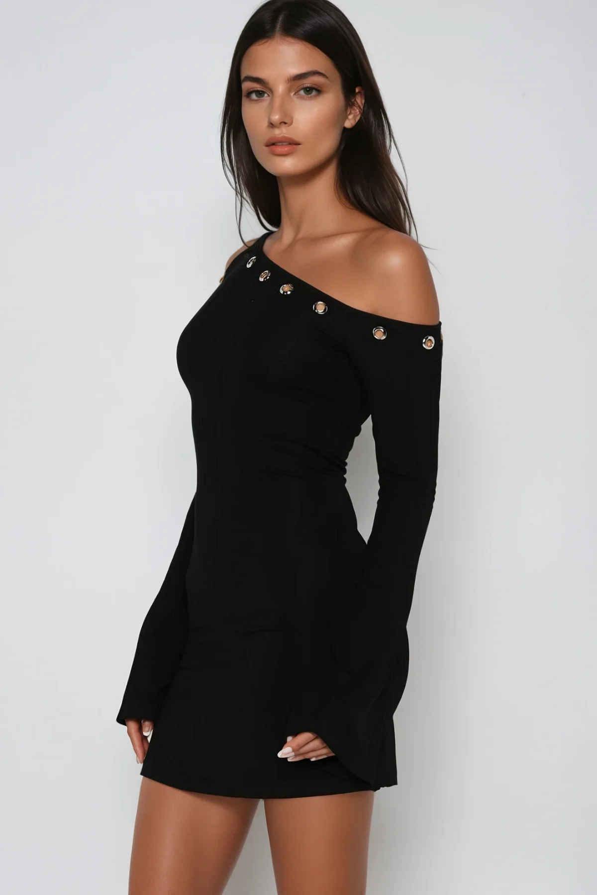 Indulge in the sophistication of the One Shoulder Eyelet Mini Dress in Black . This exquisite mini dress showcases delicate eyelet fabric and a sleek one-shoulder silhouette for a modern, asymmetrical look. Perfect for stylish events or evenings out, it offers a flattering fit that balances elegance with contemporary flair. Crafted for comfort without compromising style, this non-stretch dress is machine washable for easy care. Elevate your look effortlessly with this urban edge piece. *Color may vary due to lighting. Stretch Factor: Non-Stretch