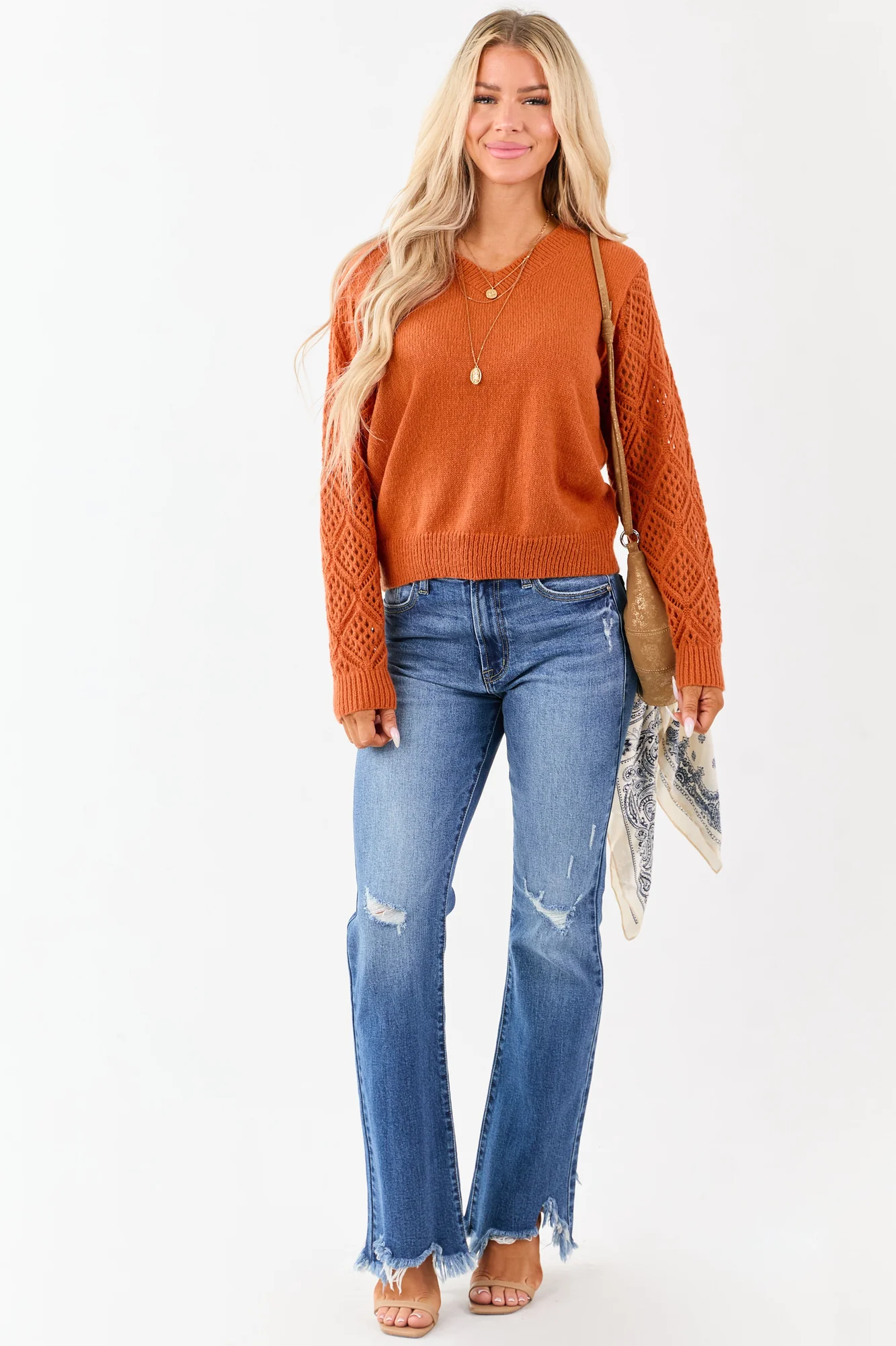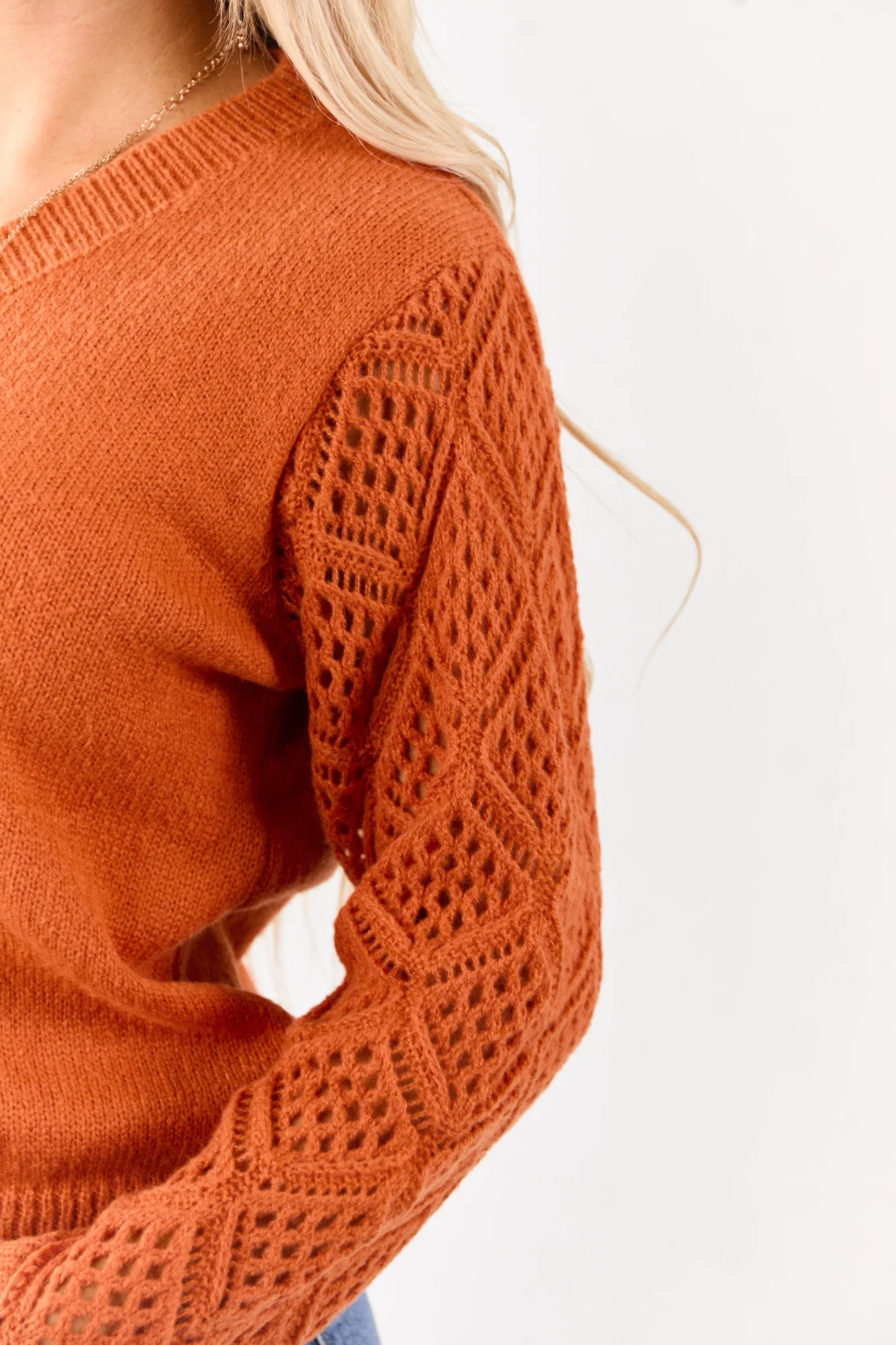 Indulge in the modern essential of this pumpkin spice pullover sweater featuring a relaxed fit and airy open-knit crochet sleeves for a versatile layered look. Crafted from a stretchy soft knit blend of 50% viscose, 30% acrylic, and 20% spandex with banded ribbed trim. Imported. Available in sizes S, M, L. Bust: 42″ – 44″. Length: 24″ – 25″. Sleeve Length: 22″ – 22.5″. Model is wearing a size Small. Model’s Profile: Size 3, Height 57″, Bust 35″, Waist 26″.