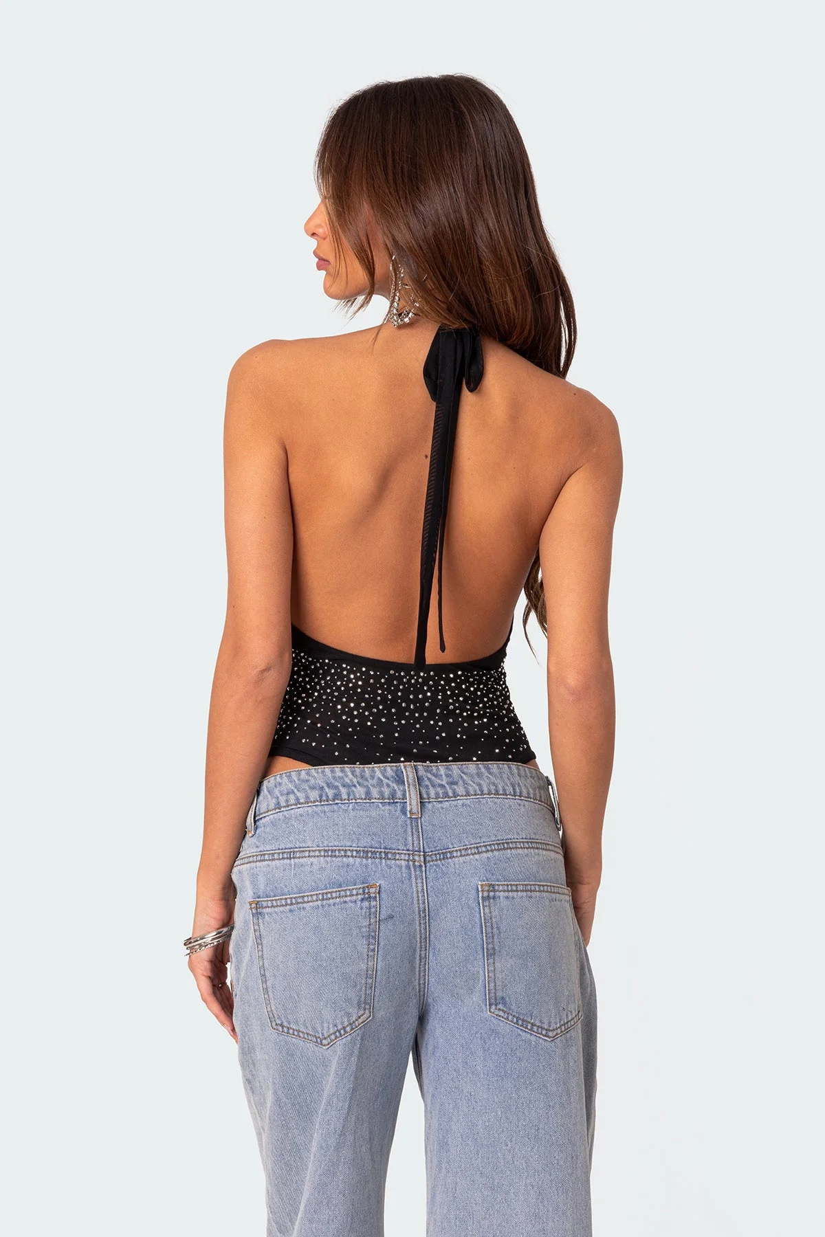Indulge in glamour with our Open Mesh Rhinestone Bodysuit. This halter neck bodysuit features a stunning open back design crafted from rhinestone mesh fabric for a dazzling look. Made of high-quality polyester and spandex blend, this bodysuit offers a comfortable yet chic fit. Perfect for evening wear and special occasions. Elevate your wardrobe with this head-turning piece!