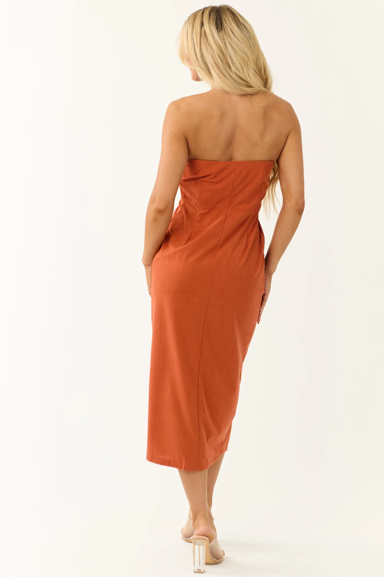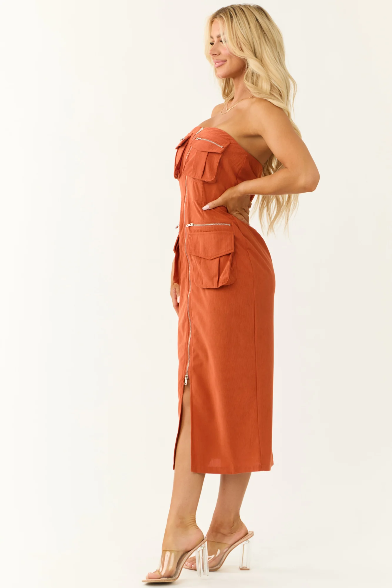 This stylish Orange Cargo Front Slit Midi Dress comes in sizes S, M, and L to fit perfectly, with a waist range of 28-30 inches and a length of 40-41 inches. It features a strapless design, double front zipper, and 4 cargo pockets. Made from non-stretchy textured woven fabric, this dress is both fashionable and comfortable. Ideal for casual or daytime wear, its a must-have for your fall wardrobe. Hand wash cold and line dry to maintain its 100% Polyester composition.