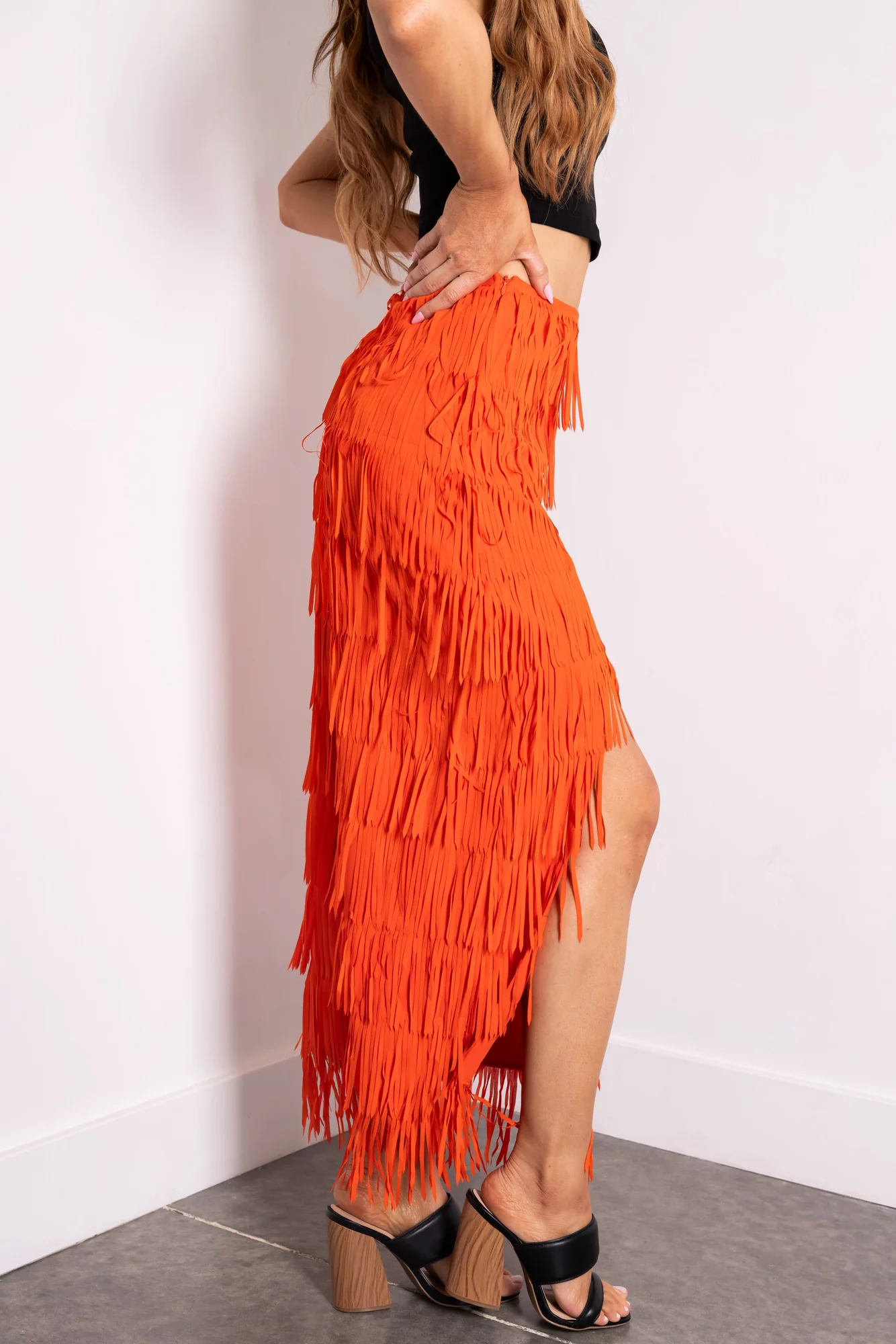 Upgrade your wardrobe with our stylish Orange Fringe Midi Skirt featuring a side slit design. Available in sizes S, M, and L with a waist range of 27-29 inches. Made from 95% Polyester and 5% Spandex for a comfortable fit. This semi-stretchy woven skirt comes with tiered fringe details, a side zipper, and is unlined for a flowy look. Perfect for date nights, parties, and going out occasions during the spring and summer seasons. Hand wash cold, iron low, and do not tumble dry. Model is wearing a size Small.