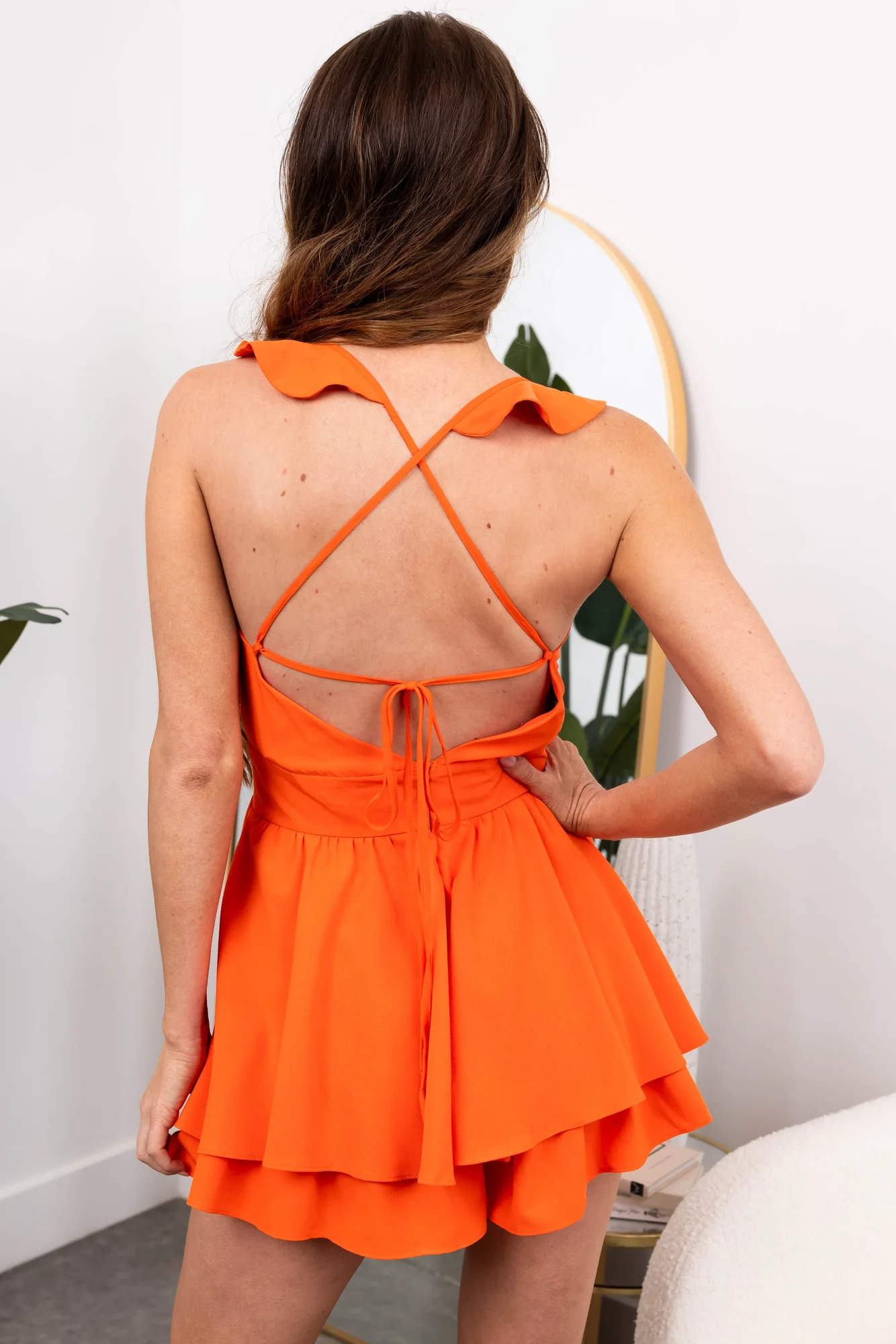 This Orange Layered Ruffle Sweetheart Neckline Romper is a must-have for the fashion-forward individual. Made of non-stretchy woven fabric, it features a ruffle layer sweetheart neckline, adjustable tie cross back spaghetti strap, layered flounce hem, and a banded waist for a flattering fit. With a zipper back and imported 100% Polyester material, this romper is ideal for a going out occasion. Available in sizes S (2-4), M (6-8), and L (10-12), it fits true to size and adds a playful touch to any wardrobe. Hand wash cold, do not bleach, hang or line dry for long-lasting wear. Model is wearing a size Small.Model’s Profile: Size 2, Height 58″, Bust 32″, Waist 25″