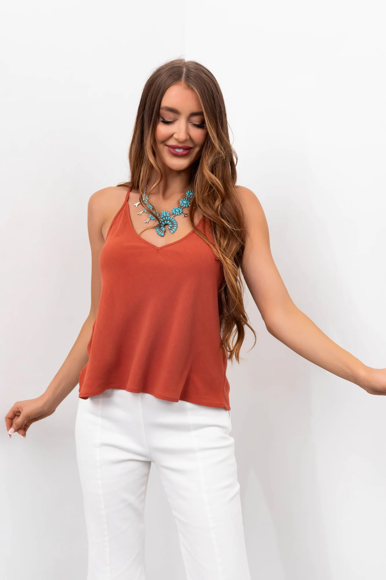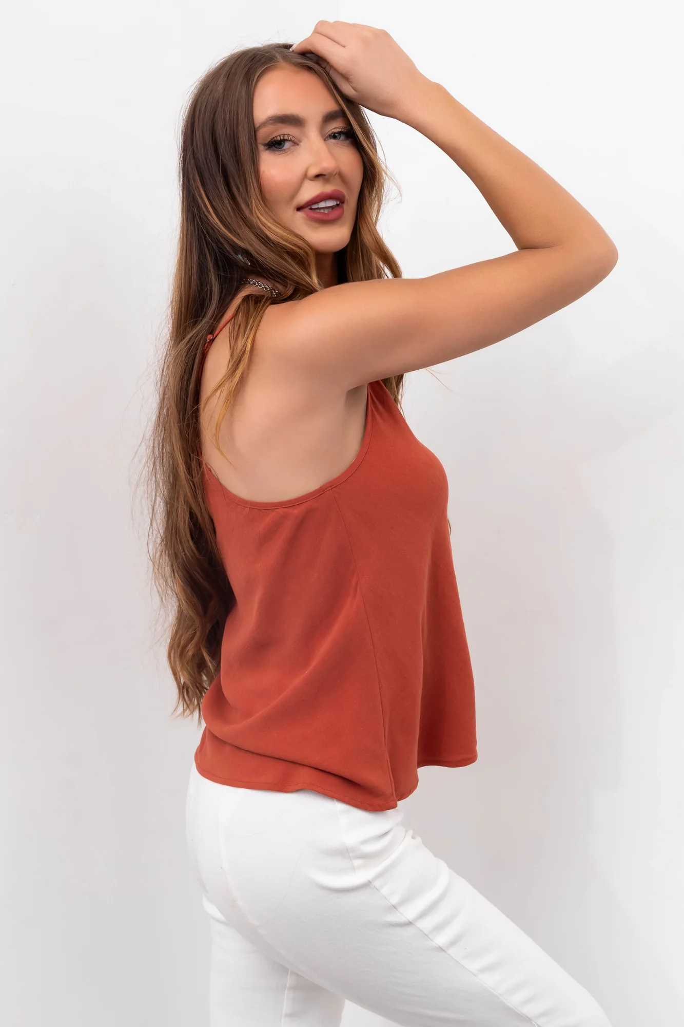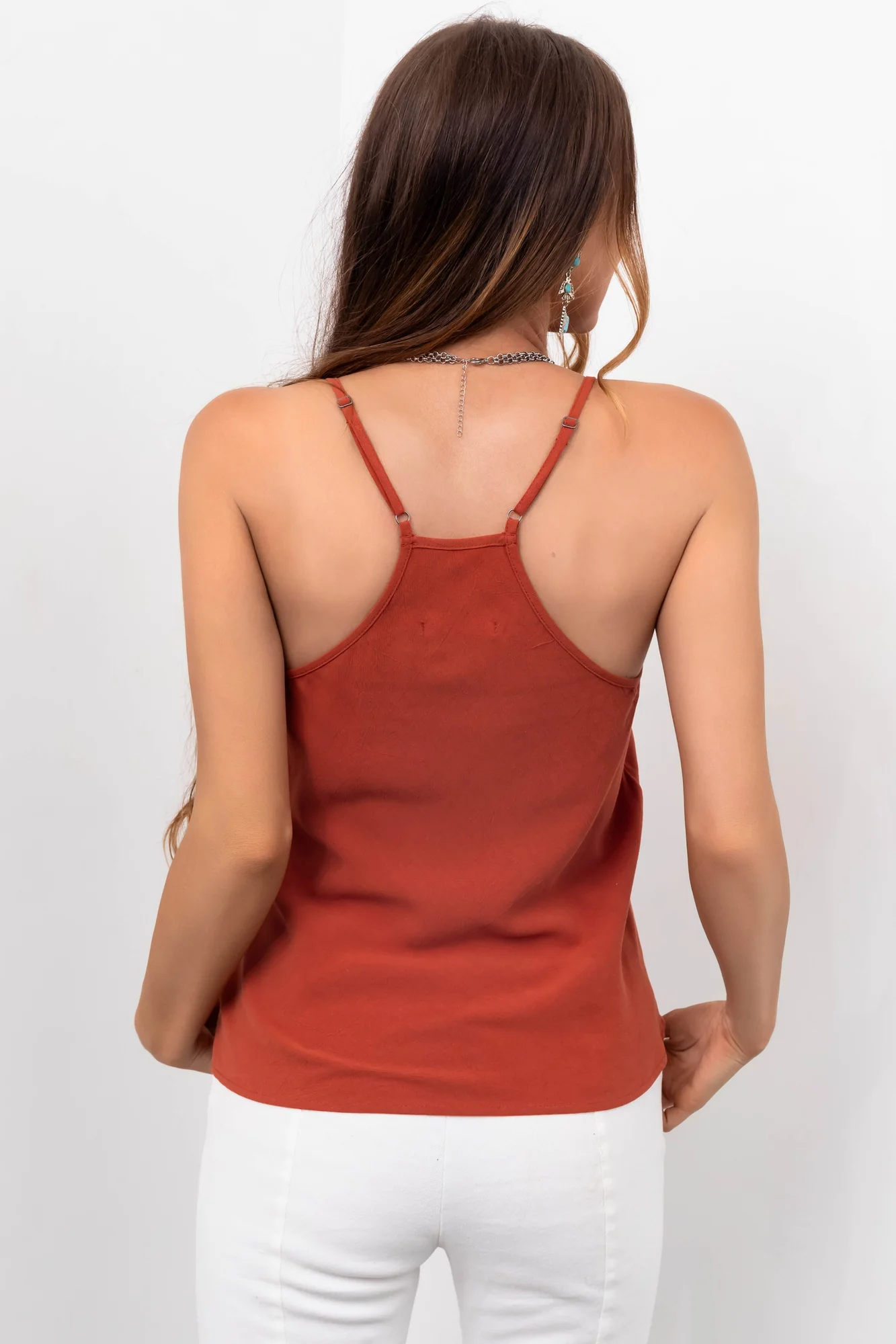 Stay stylish and cool in our Orange Linen V Neck Tank Top. This flowy cami features adjustable spaghetti straps, a non-stretchy woven fabric, and a relaxed fit perfect for hot days. Crafted with 85% Rayon and 15% Linen, this lightweight top is ideal for daytime outings. Hand wash cold and line dry to keep it looking fresh. Available in sizes S, M, and L. Model is wearing a size Small. Ideal for spring and summer. Find your perfect fit and enjoy the comfort and style!