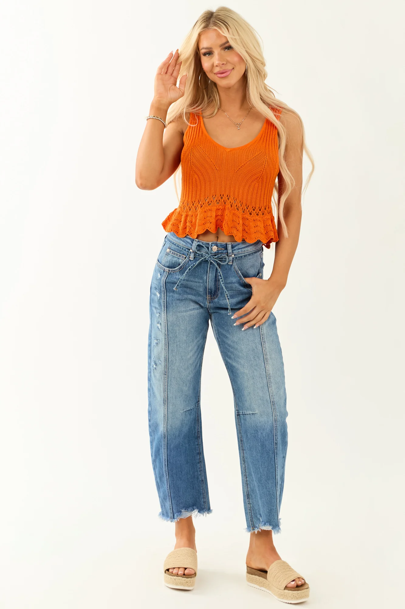Stay cool and stylish with our Orange Ribbed Knit V-Neck Cropped Tank Top + Moon. Available in sizes S, M, and L with bust measurements ranging from 32 inches to 44 inches. This bright and breezy top adds a splash of color to your sunny day look, featuring stretchy ribbed knit fabric, open pointelle details, and a flattering V neckline. Made of 100% viscose, this top is perfect for warm seasons. Care instructions: Hand wash cold, do not bleach, do not tumble dry, hang dry. Model is 57″ tall, wearing a size Small with a bust of 34 inches and a waist of 26 inches.