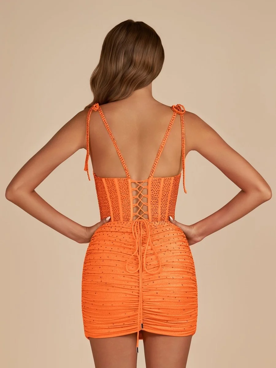 Elevate your style with our stunning orange satin bodycon homecoming dress. The scoop neckline and sleeveless design accentuate your shoulders, while the lace-up back ensures a perfect fit. Adorned with exquisite bead embellishments and charming bow straps, this short dress exudes feminine elegance. Ideal for homecoming, parties, or a night out, this dress merges sophistication with a playful touch. Available in fuchsia, black, dark green, navy blue, red, and royal blue. Embrace your unique style and stand out from the crowd!