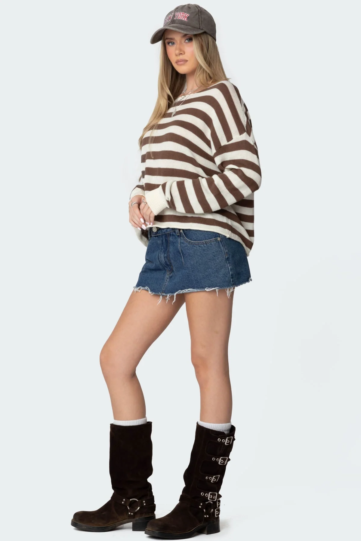 Stay cozy and stylish in our oversized brown and cream striped sweater. This knit piece features rolled edge detailing and a comfortable fit. Made from a blend of cotton and polyester, its perfect for every occasion. Machine washable for easy care. Available in sizes XS, S, M, L, and XL.