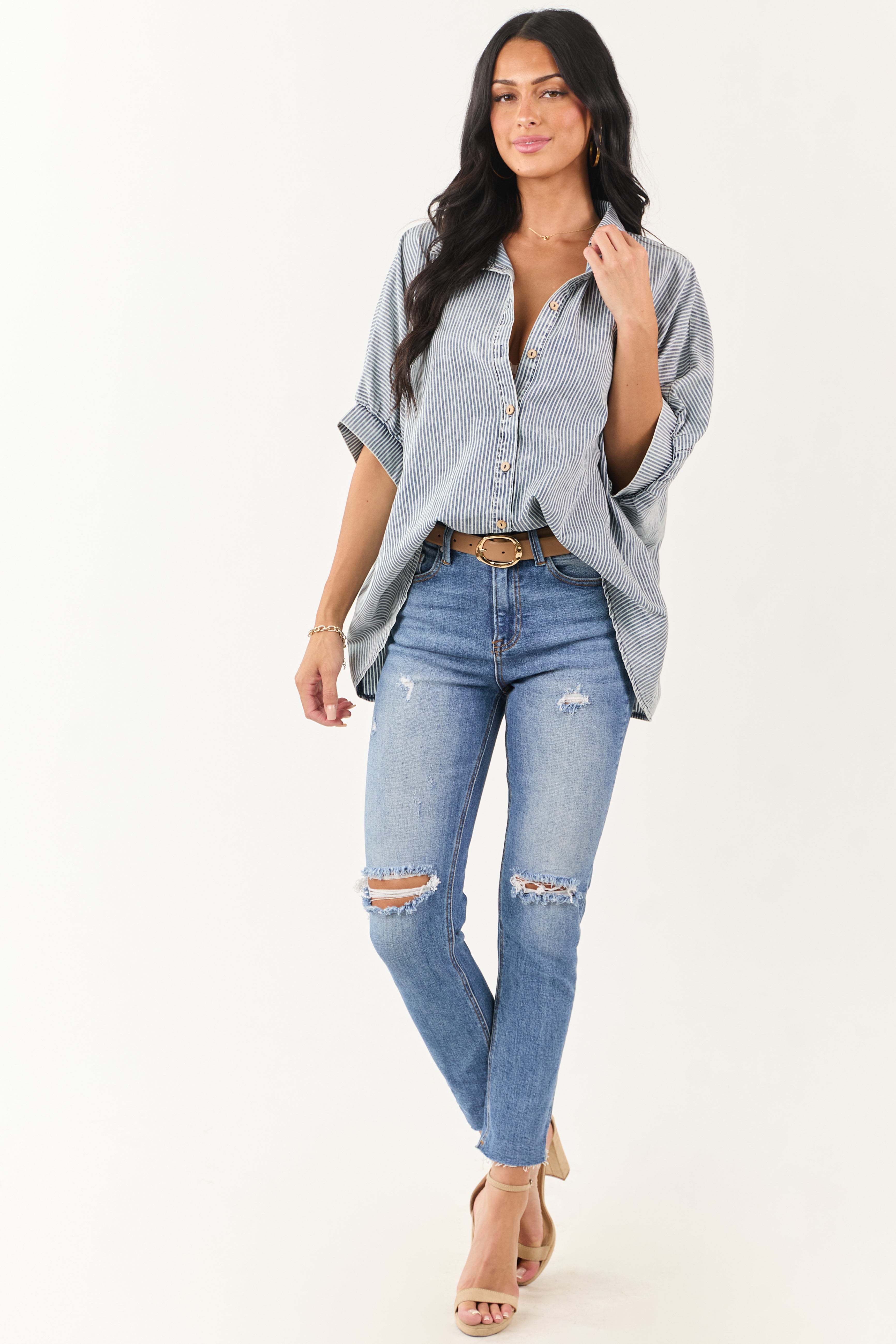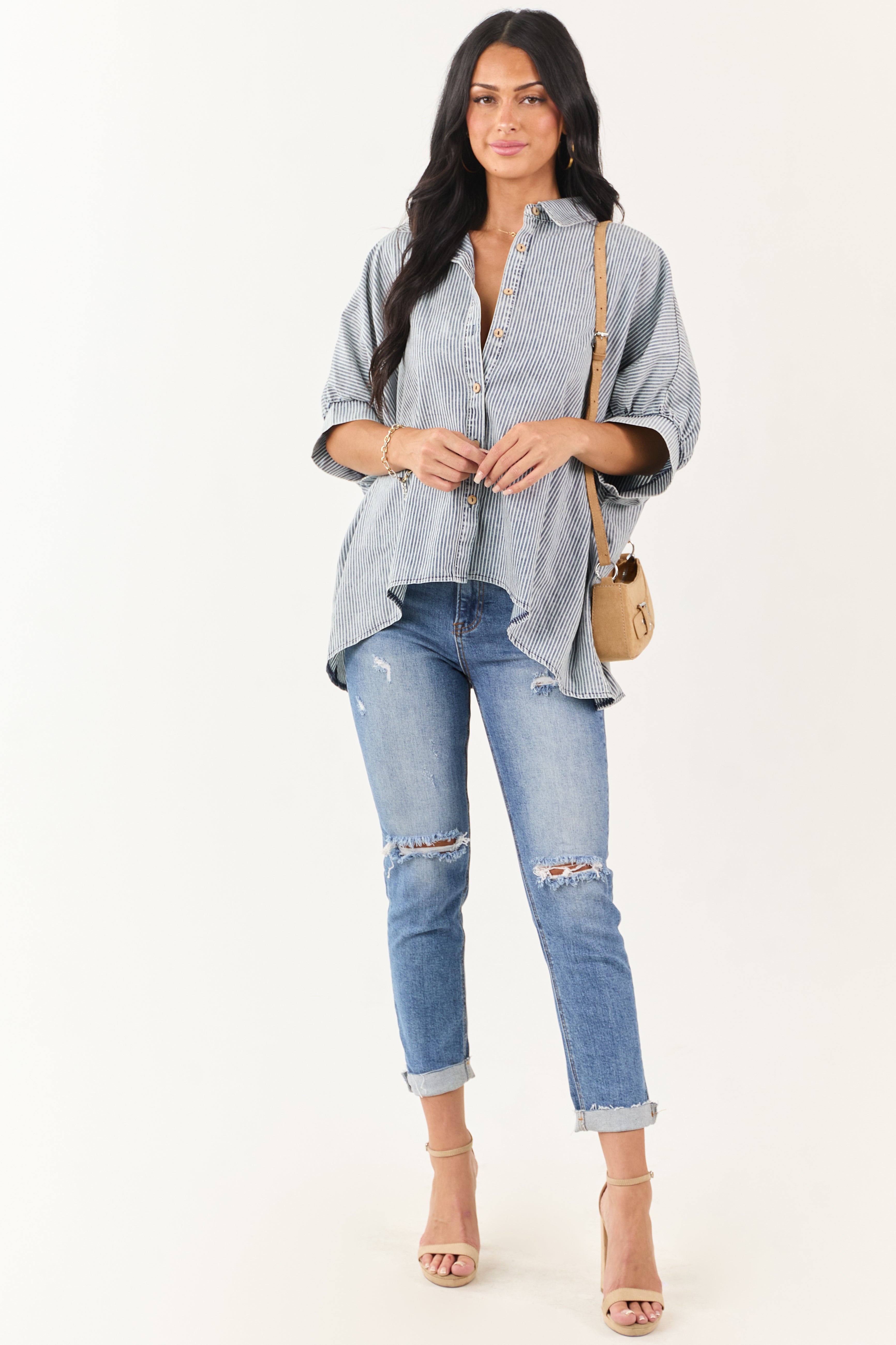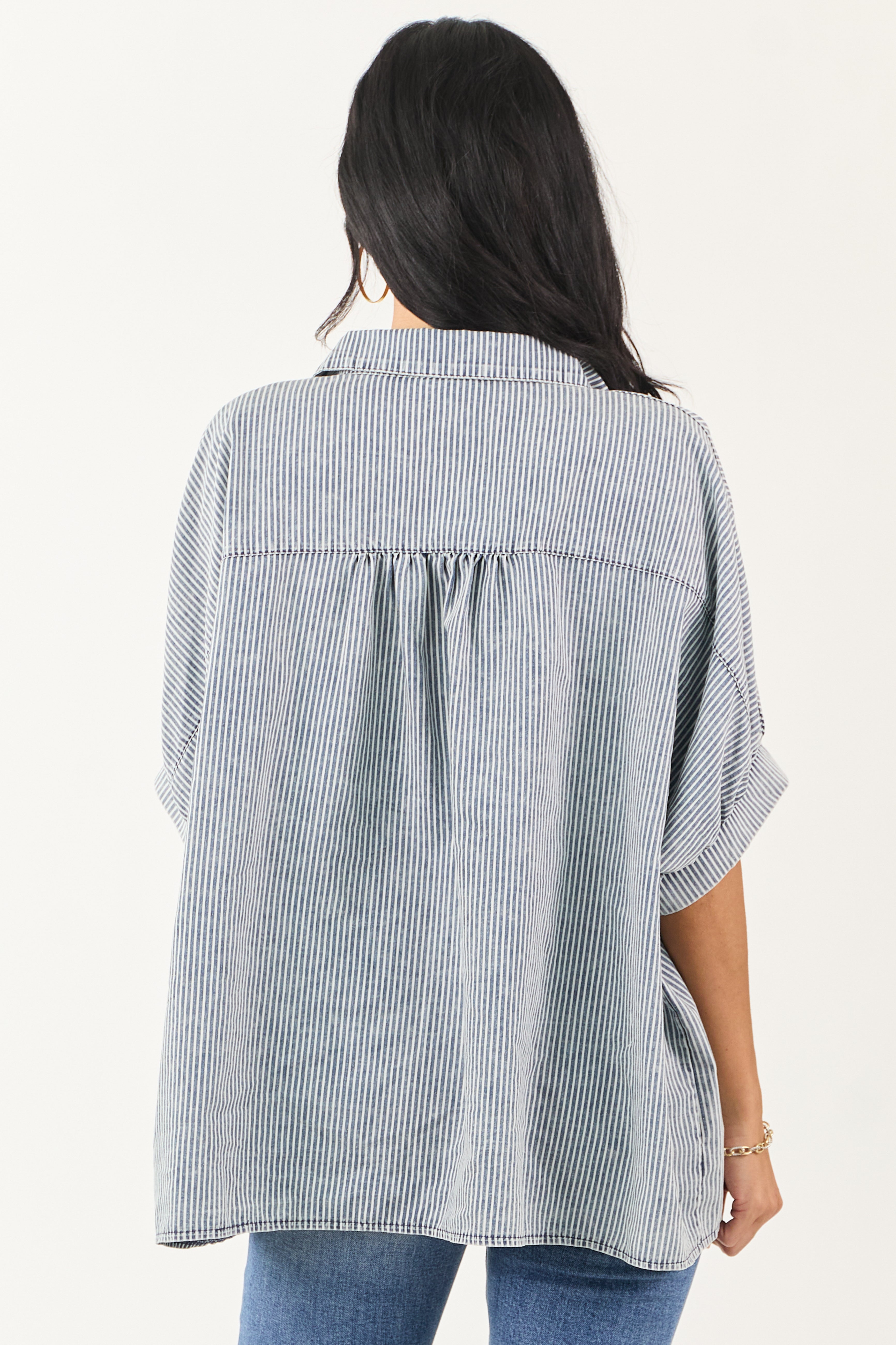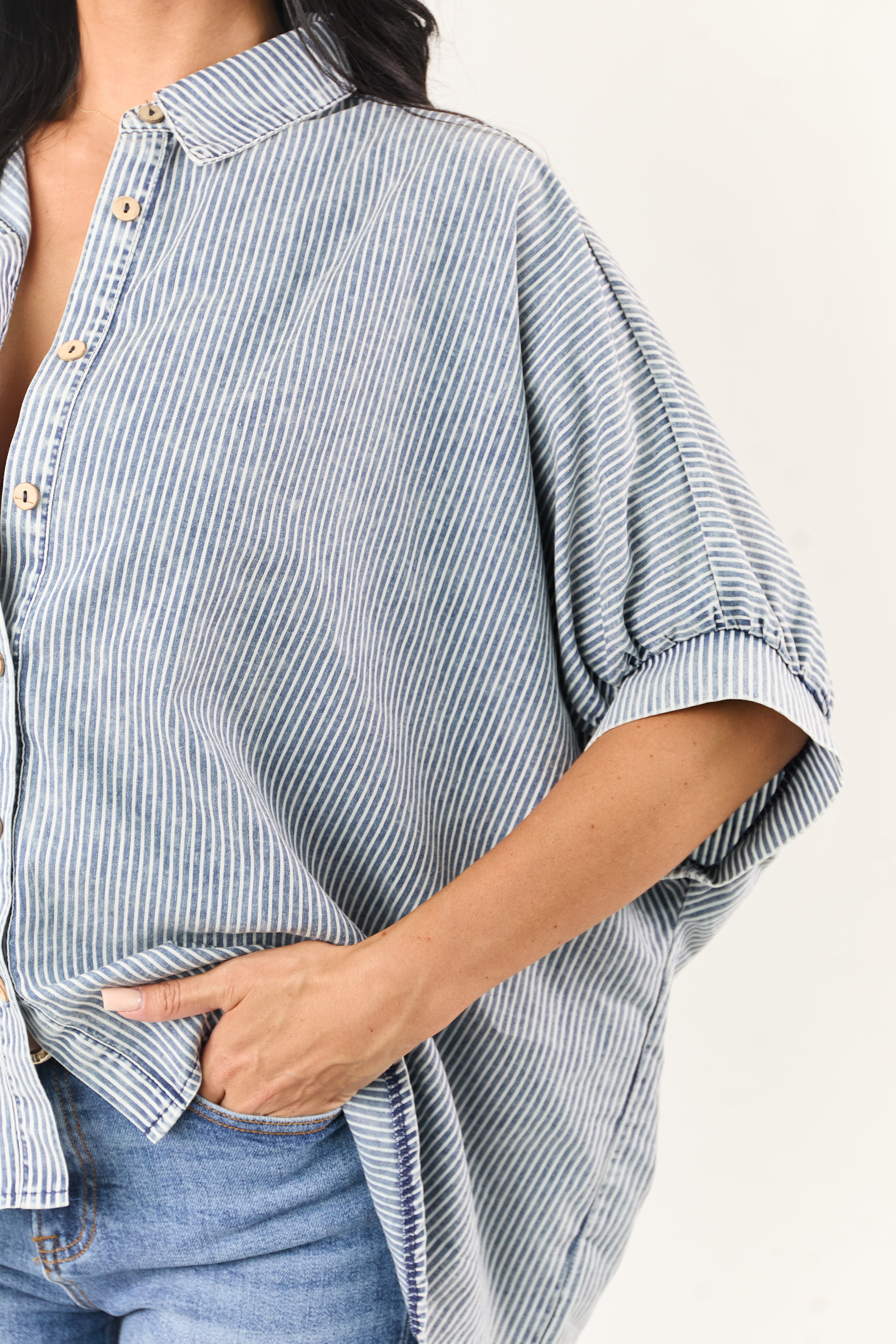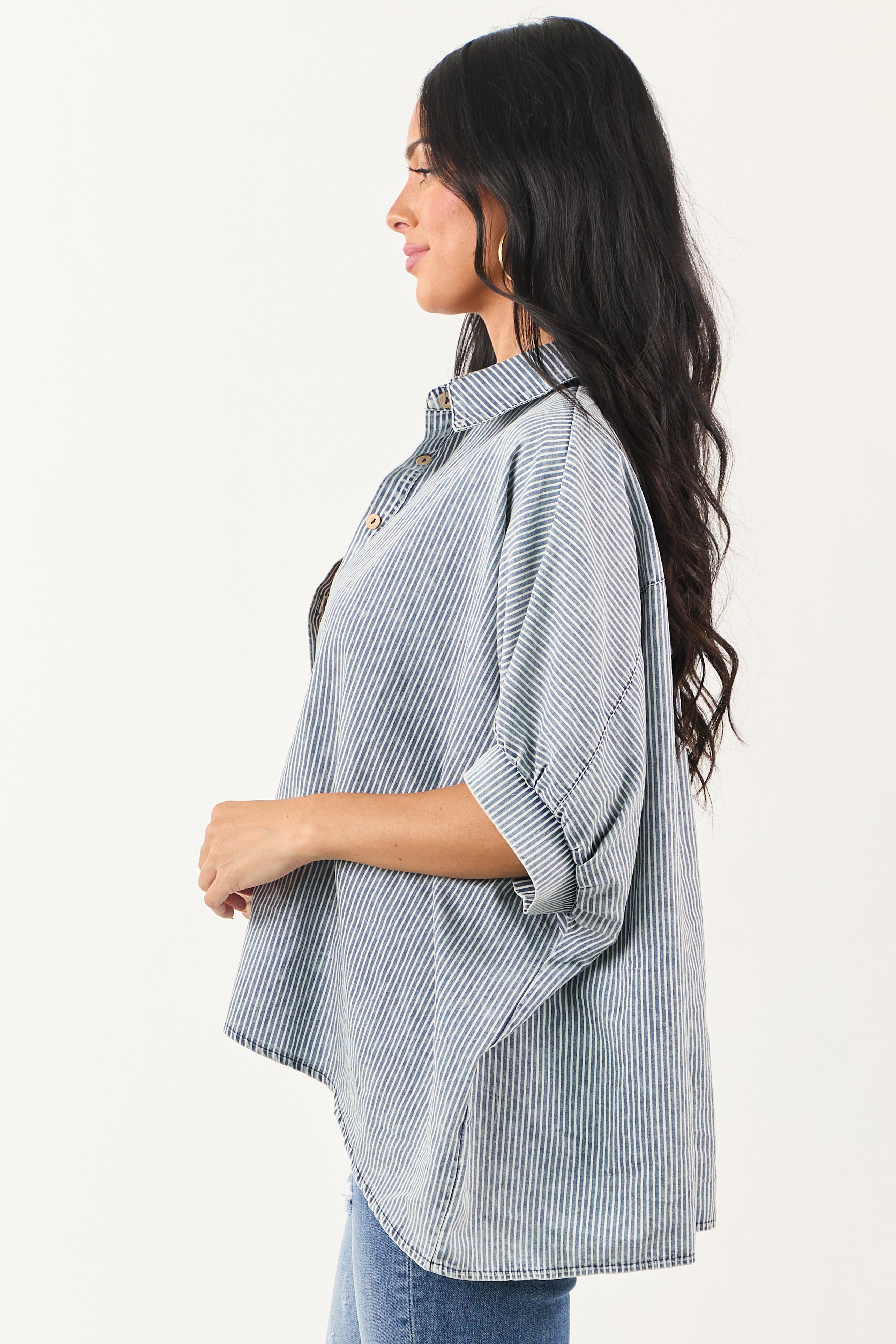 Upgrade your wardrobe with this effortlessly cool oversized chambray denim top featuring half dolman sleeves and high-low hem. Crafted from non-stretchy chambray denim blend of 65% Cotton, 35% Polyester for a comfortable fit that pairs well with any bottoms. This top boasts a borrowed-from-the-boys look with a hint of femininity. Imported. Model is wearing size Small. Model’s Profile: Size 1, Height 59″, Bust 34″, Waist 26″. Elevate your style effortlessly!