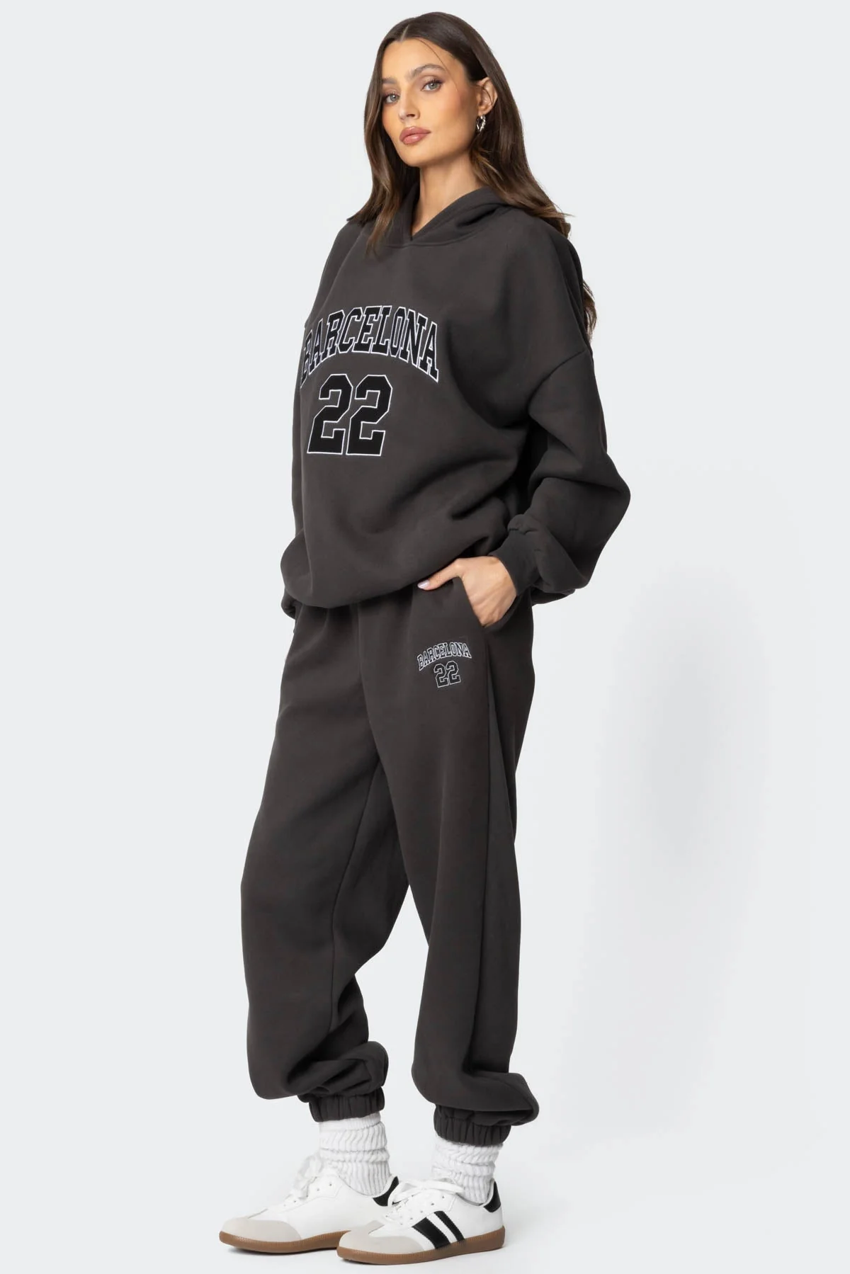 Tags: Barcelona embroidery, dark gray sweatpants, Graphic Style, loungewear, oversized sweatpants