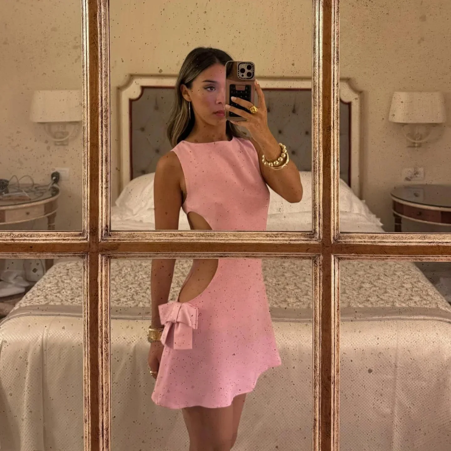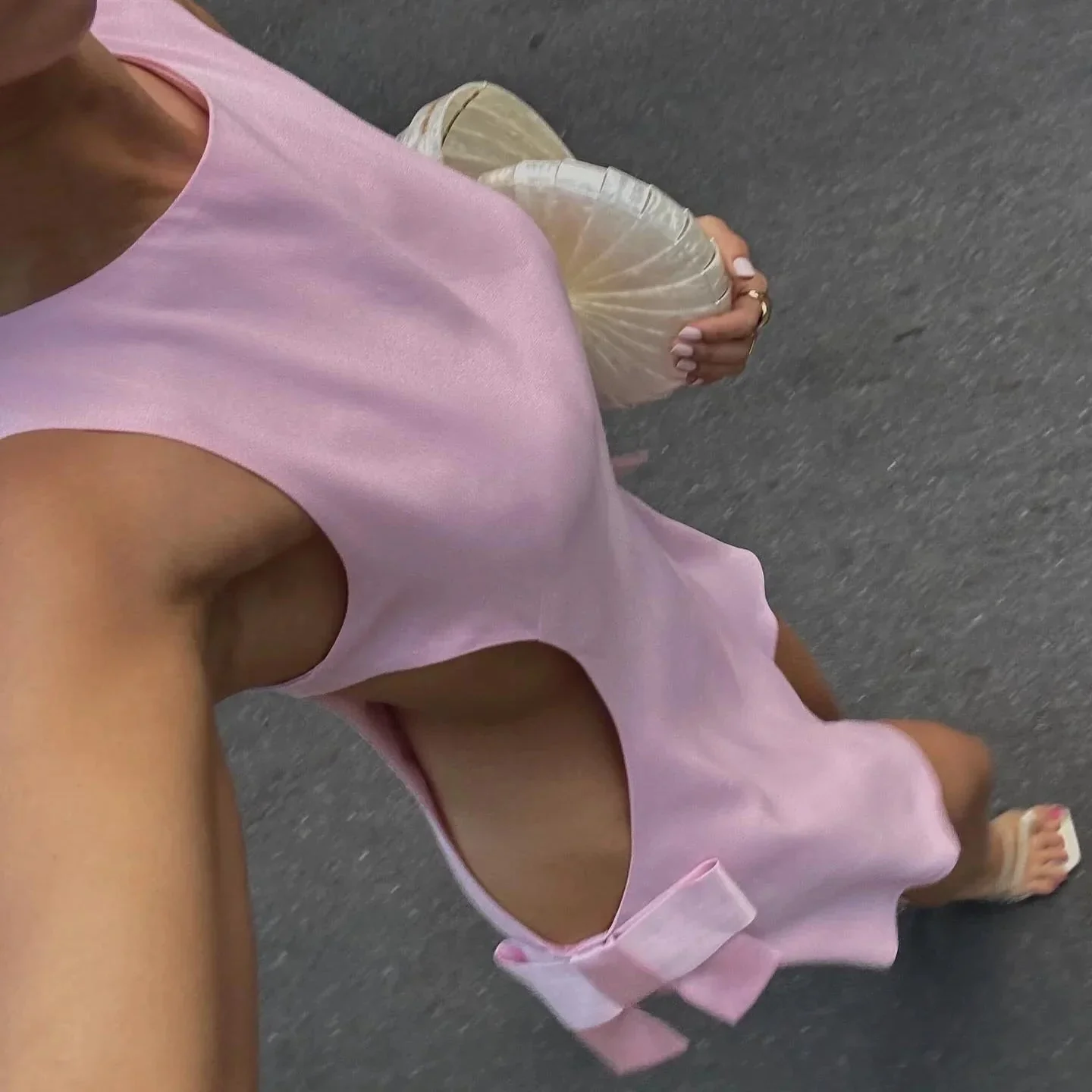 Indulge in the feminine charm of the Pastel Pink A-Line Bow Detail Mini Dress. Embrace effortless chic with this sleeveless mini featuring alluring side cut-outs and oversized bows at the hips. Crafted for sunny brunches or open-air dance nights, this dress exudes elegance with a whimsical touch. Join the celebration with this coquette essential that guarantees a fashionable statement. Love it or exchange for a better fit!