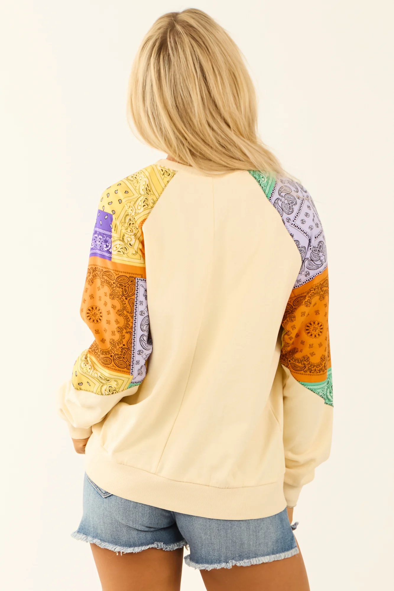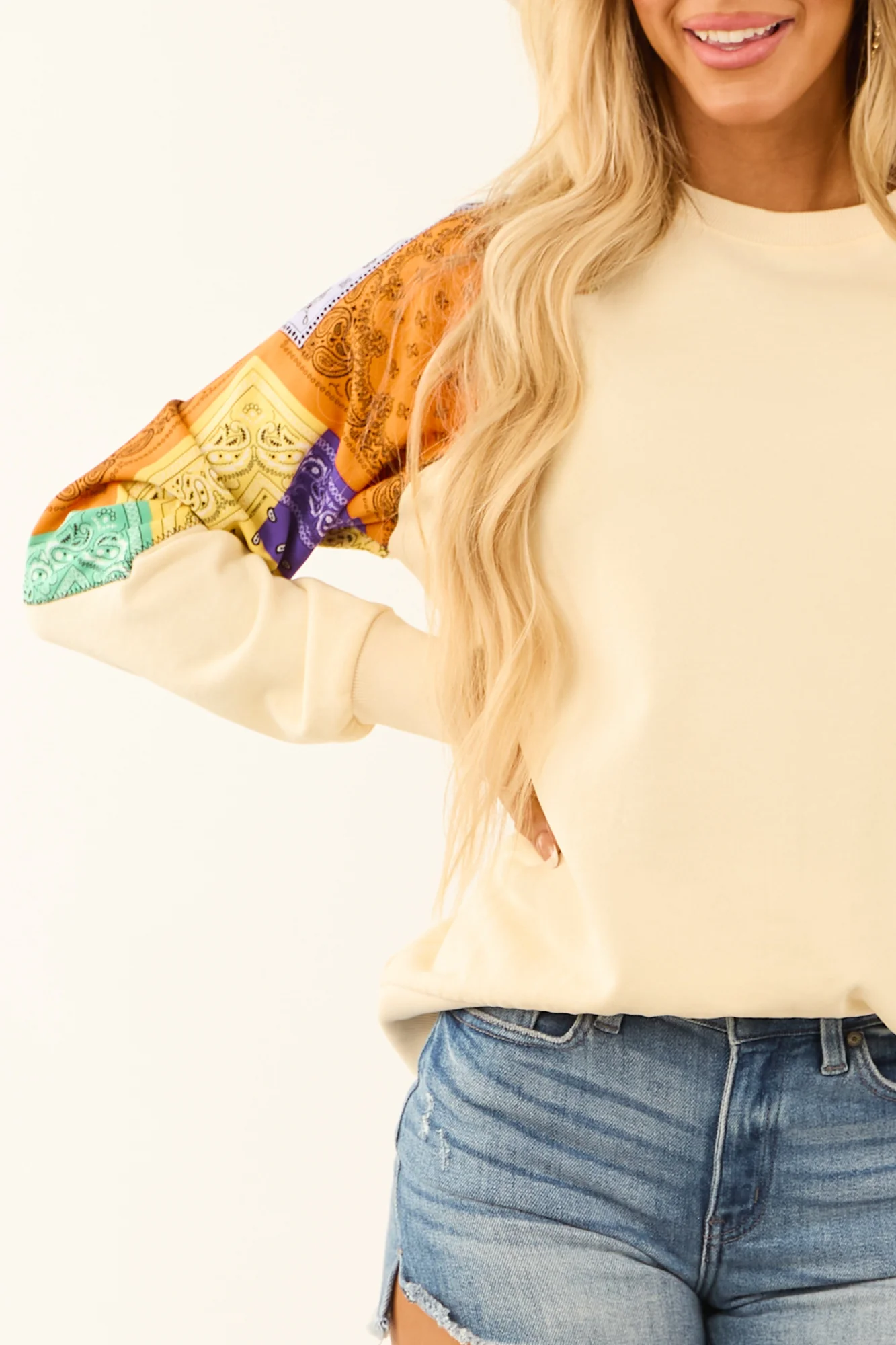 Experience comfort and style with our Patchwork Bandana Print Long Sleeve Sweatshirt! Made of semi-stretchy knit fabric in shades of Periwinkle, Sunset, Lemon, Indigo, Kelly Green, and Coral. Featuring a crew neckline, drop shoulder, banded ribbed trim, and back seam detail. Ideal for casual outings or lounging at home. Hand wash cold separately to preserve colors. Available in sizes S, M, and L.