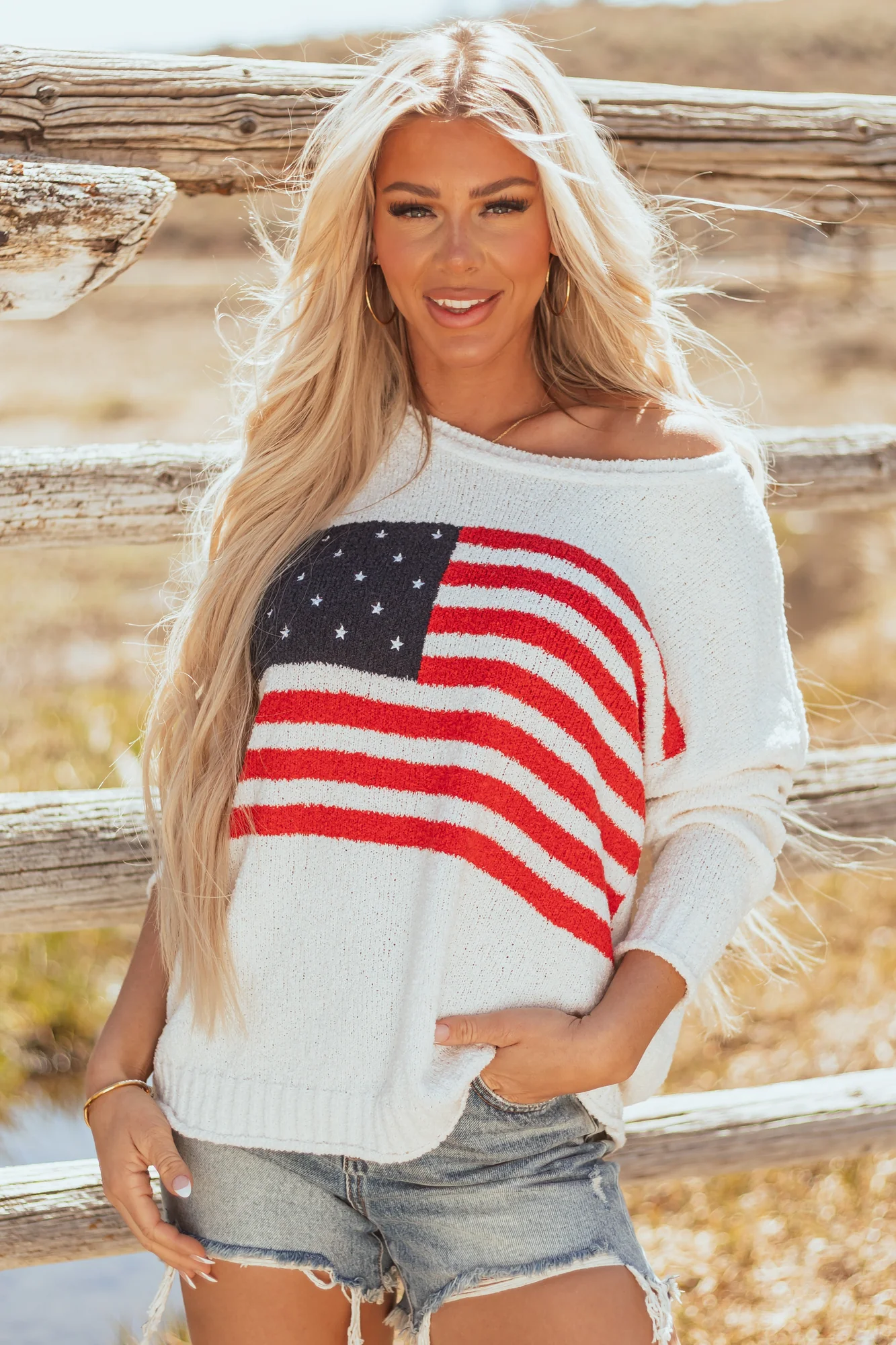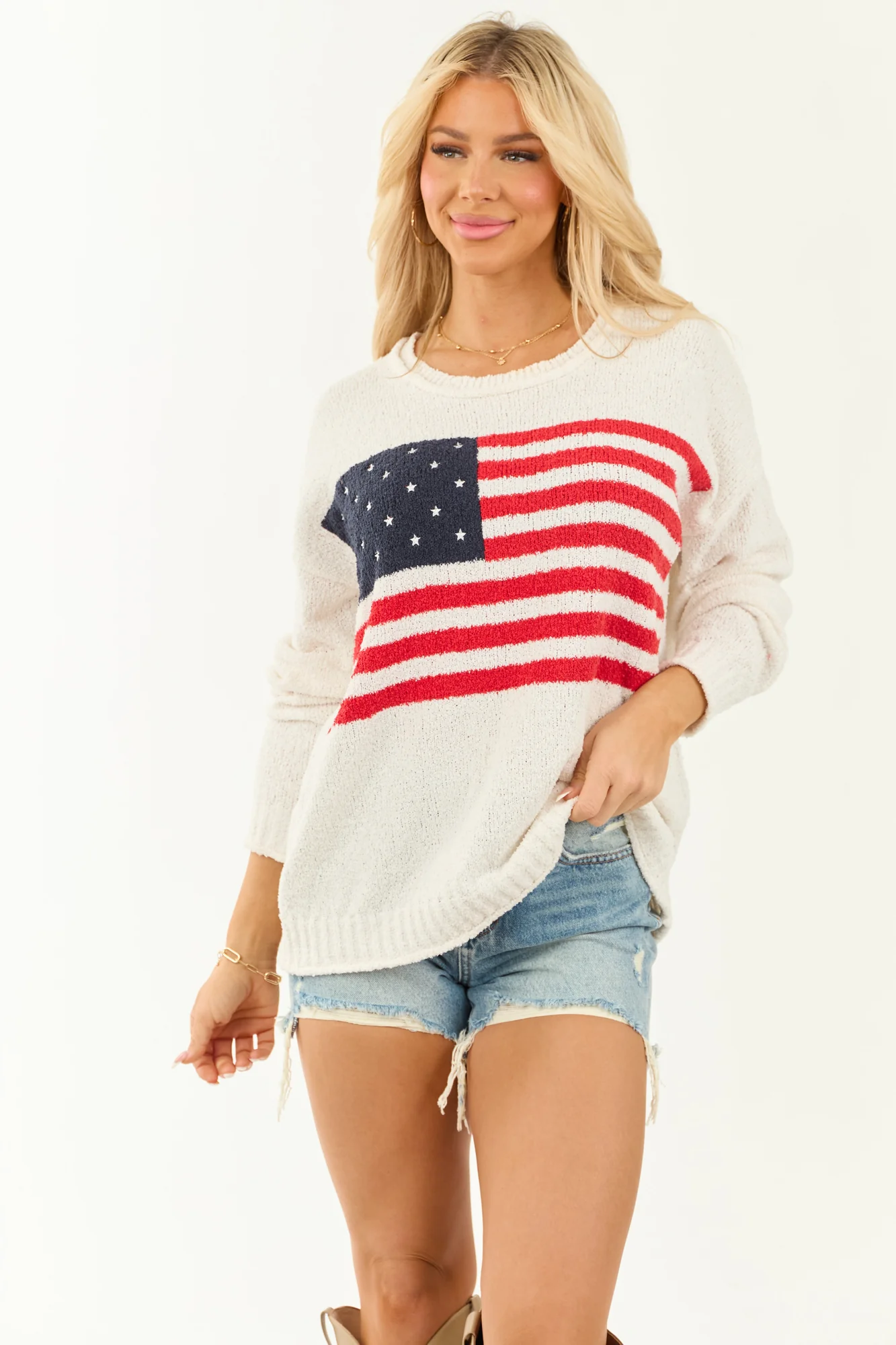 Celebrate in style with our Patriotic Flag Lightweight Sweater Top! This cozy sweater features an oversized fit, stretchy fuzzy knit, and an American flag design in shades of Navy and Lipstick. Perfect for a day filled with fireworks and fun. Made of 100% Polyester. Hand wash cold water, dry flat, low iron. Available in sizes S, M, and L. Model is wearing a size Small. Ideal for 4th of July, Memorial Day, or casual patriotic events. Shop now and show off your American pride!