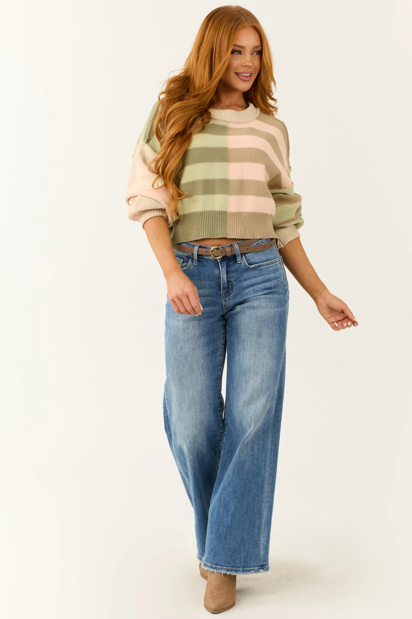 Stay cozy and stylish with our Peach, Latte, Sage, and Olive Striped Cropped Sweater. Featuring a boxy wide fit, stretchy knit fabric, long bubble sleeves, and a crew neckline with ribbed banded trim for a fashionable look. Made of 60% Cotton and 40% Acrylic, this sweater is perfect for any casual day out. Pair it with your favorite jeans for a trendy ensemble. Hand wash cold and hang dry for best care.