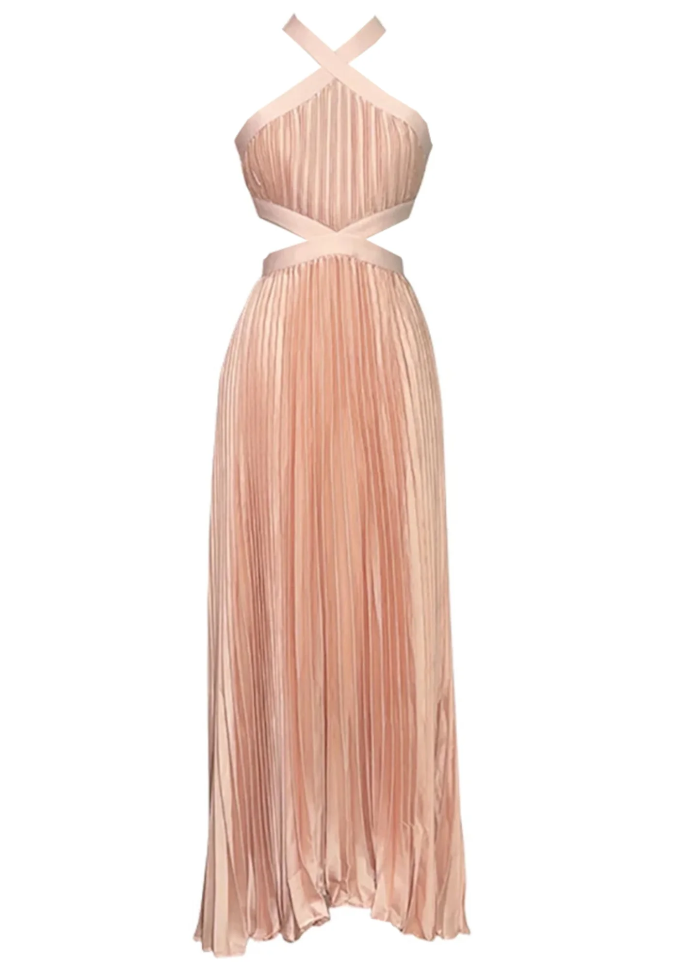 Indulge in the elegance of our Peach Pink Halter Pleated Maxi Dress. Crafted from a blend of Polyester, Cotton, and Silk for durability and comfort. Featuring a Halterneck, Sleeveless design, and A-line silhouette with a chic Cut-out detail. The concealed back zipper ensures a sleek fit. Carefully stitched with precision for lasting quality using a YKK zipper. Dry clean only. Enhance your wardrobe with this sophisticated piece.