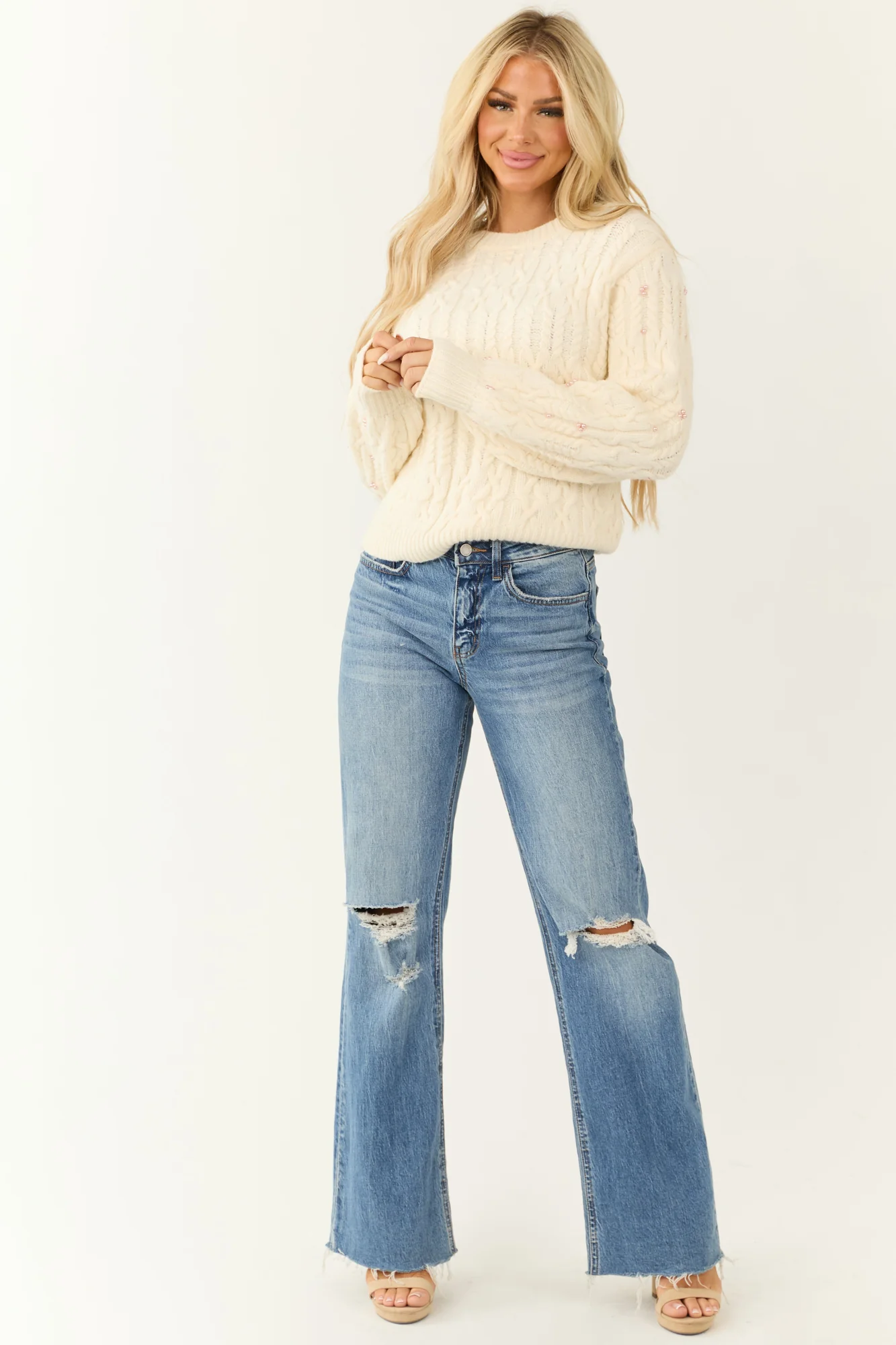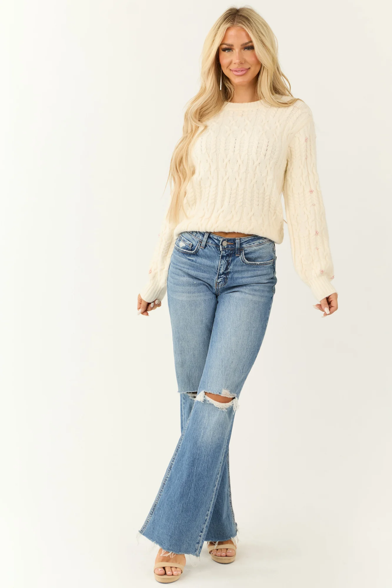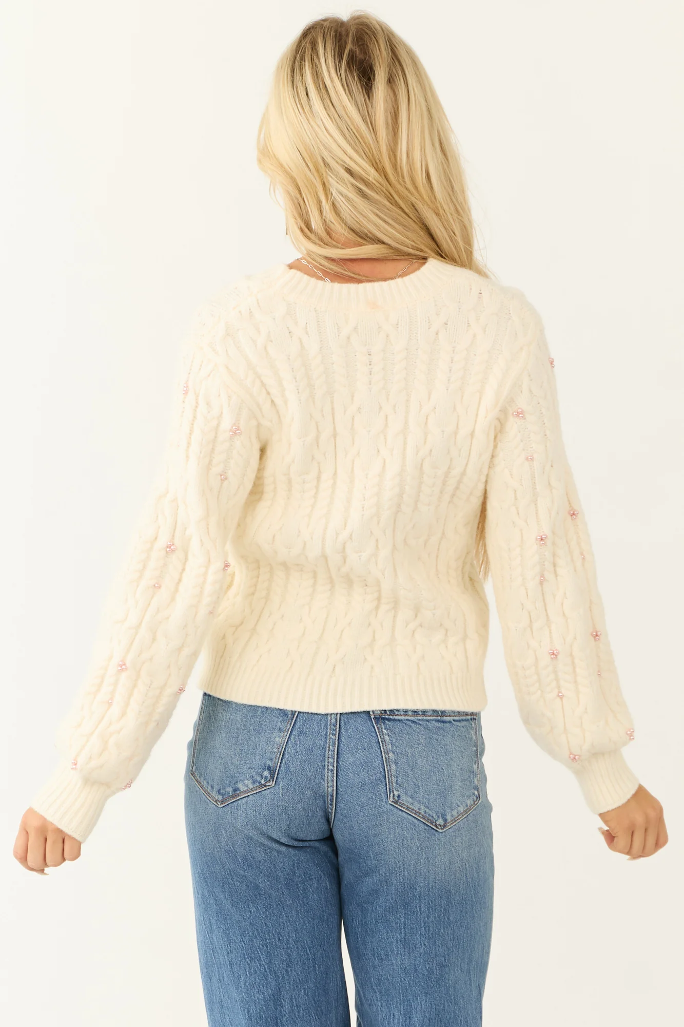 Indulge in elegance with our Pearl Embellished Cable Knit Sweater in Cream. Crafted from a stretchy knit blend, this sweater features intricate pearl detailing on the sleeves for a touch of sophistication. With a crew neckline, ribbed trim, and long sleeves, this sweater offers both style and comfort. Machine washable for easy care. Perfect for adding a touch of luxury to your winter wardrobe.