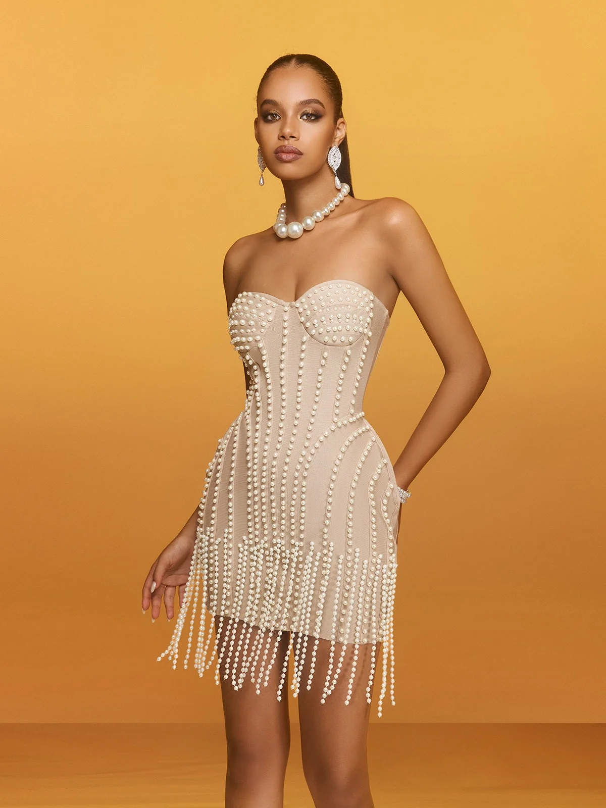 Make a dazzling statement in the Pearl Fringe Bandage Mini Dress. This luxurious mini dress showcases a strapless design adorned with delicate pearl fringe detailing for a touch of opulence and movement. Crafted from 95% Polyester and 5% Spandex, its bandage fabric sculpts your figure elegantly while offering a slight stretch for comfort. The invisible zipper at the back ensures a seamless fit. Suitable for parties and evening events, this chic dress beautifully combines sophistication with a bold flair, making you the focal point of any occasion. Experience a flattering silhouette that exudes confidence with this must-have piece. Color variations may occur due to image lighting. Available sizes: S, M, L.