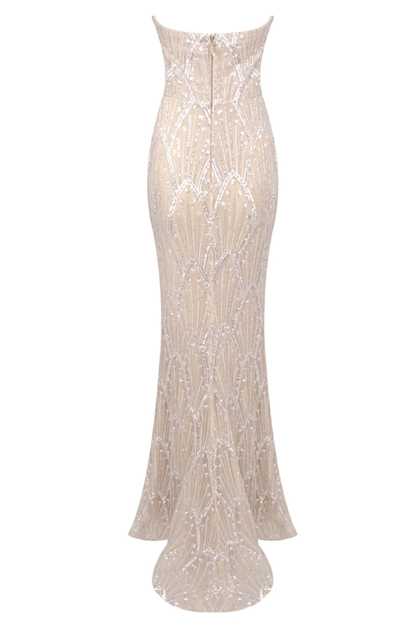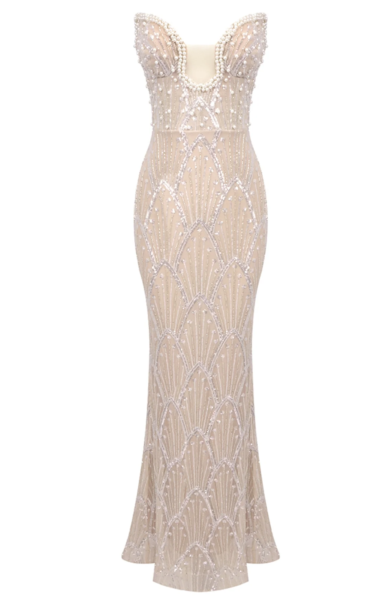 This stunning nude maxi dress features a strapless, sleeveless design with a bustier detail and sequined mermaid design adorned with pearls. The dress is elegantly finished with a concealed zipper at the back. Perfect for special occasions and evenings out. Please note that color may vary slightly due to lighting. For the best fit, refer to our size chart and choose your usual size. Avoid sizing up or down for optimal comfort. Gentle dry clean only. Length: Maxi.
