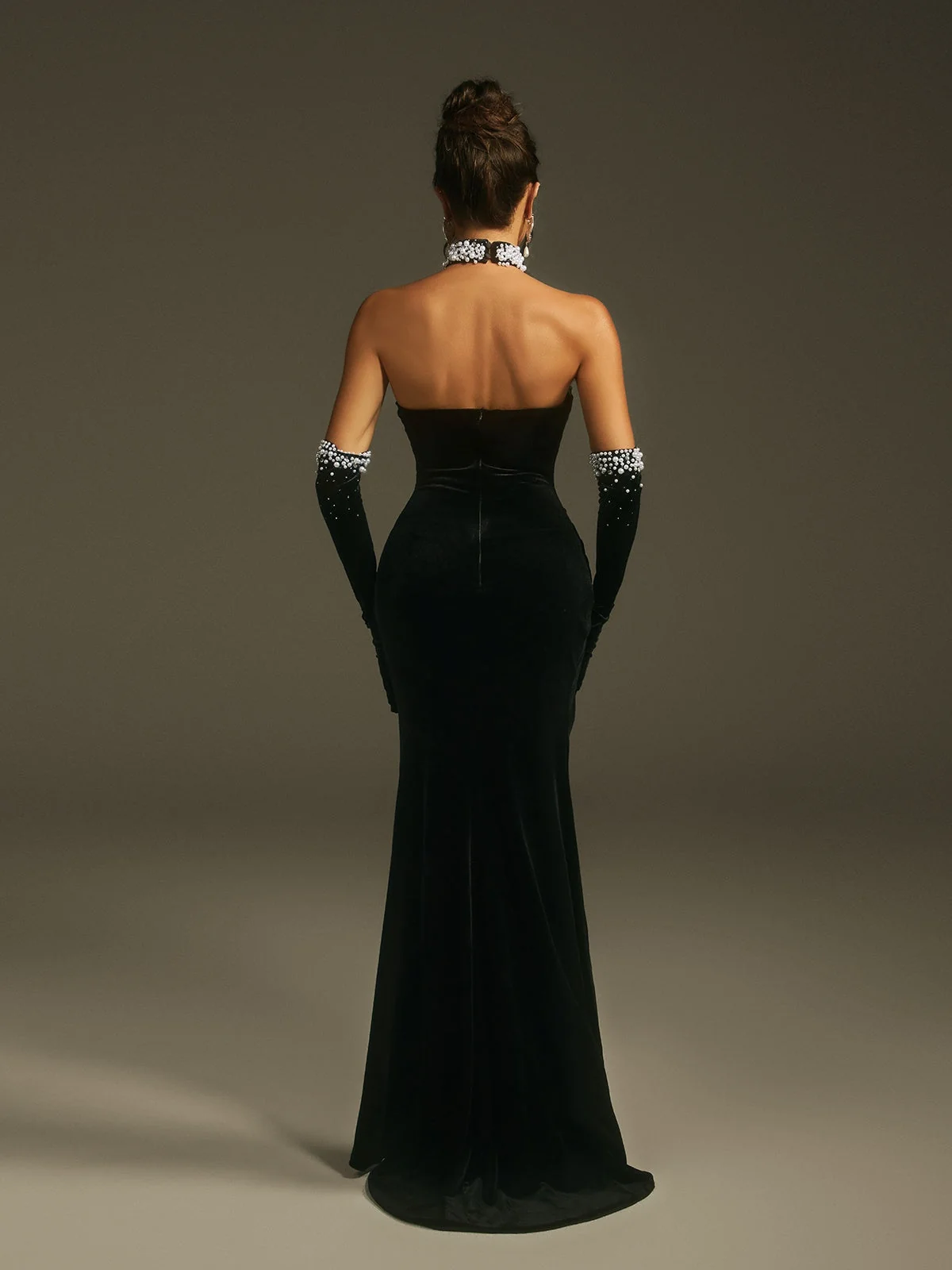 Elevate your elegance with the Pearl Split Strapless Maxi Dress paired with matching gloves for a sophisticated touch. This stunning dress features a strapless design, a striking split, and delicate pearl accents, perfect for a remarkable entrance. Made of 100% Polyester, it offers a slight stretch and easy invisible zipper closure. Dry clean only. Model showcased in size S. Dress color may vary due to lighting. Package includes gloves and choker accessory for a complete look.