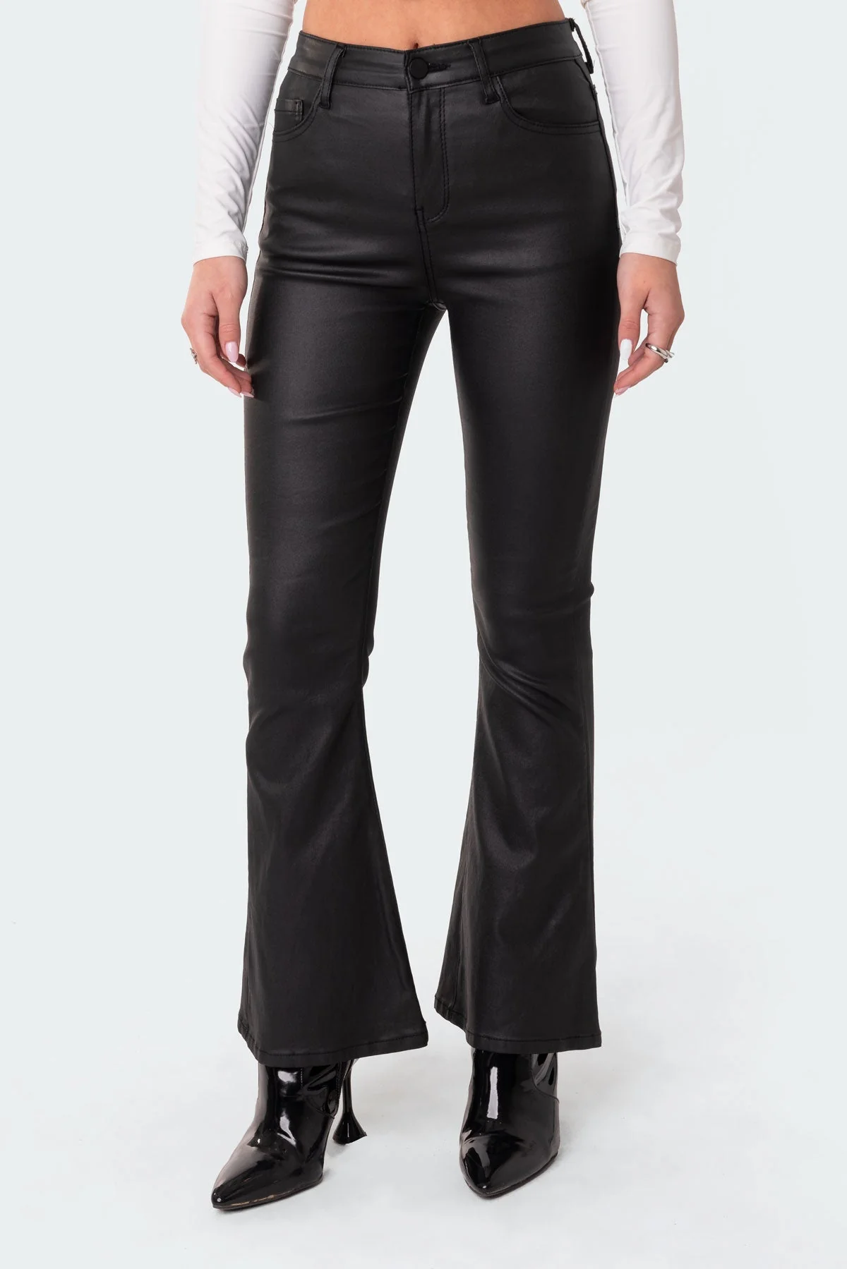 Experience chic comfort in these Petite Black Faux Leather Flare Pants available in sizes XS to XL. Made with a blend of Polyester, Rayon, and Spandex, these trendy pants are perfect for heights up to 54. The model in size S stands at 55, showcasing a regular fit. Care for this fashion piece by washing with similar colors. Elevate your style with these versatile faux leather pants today!